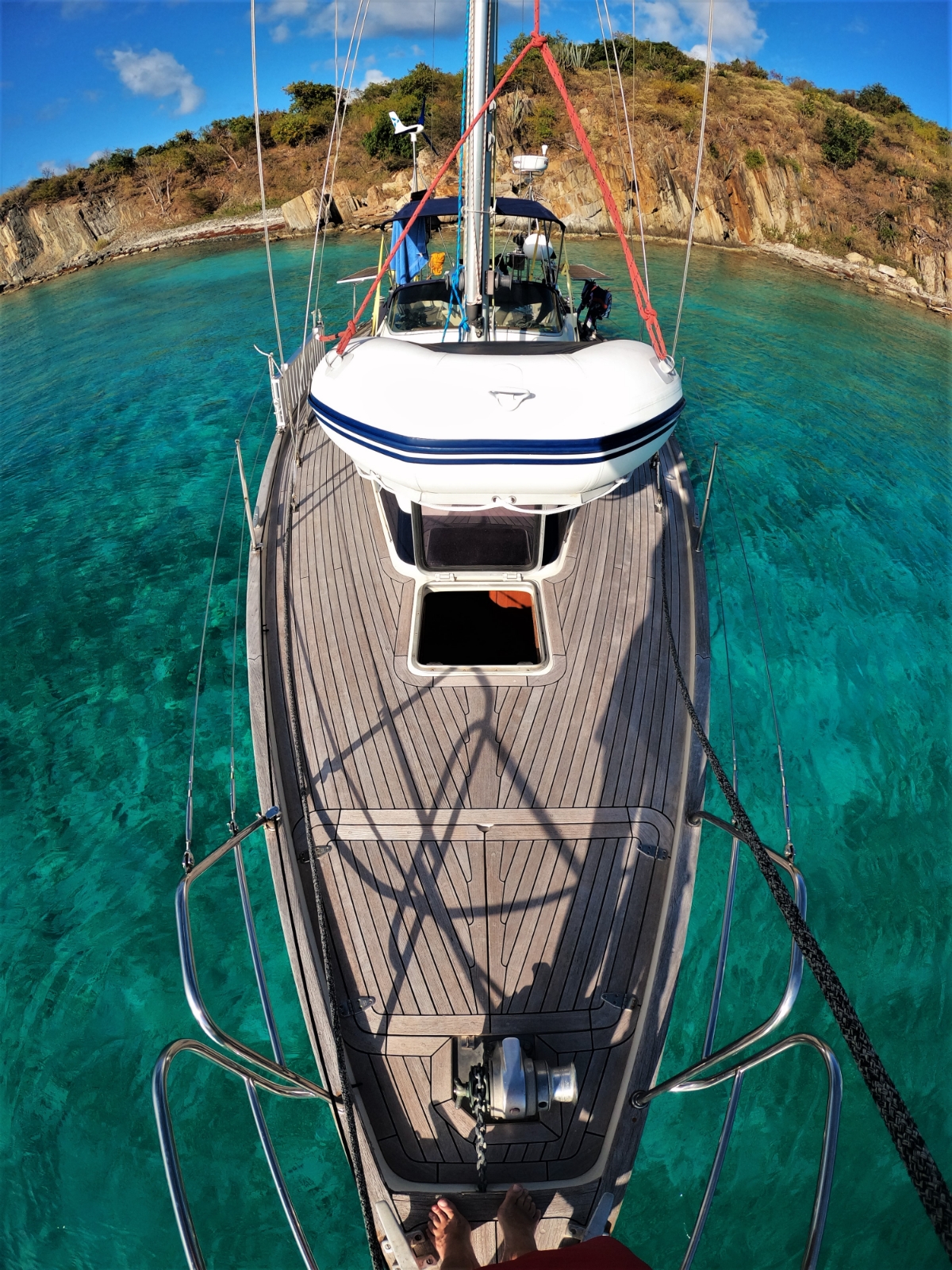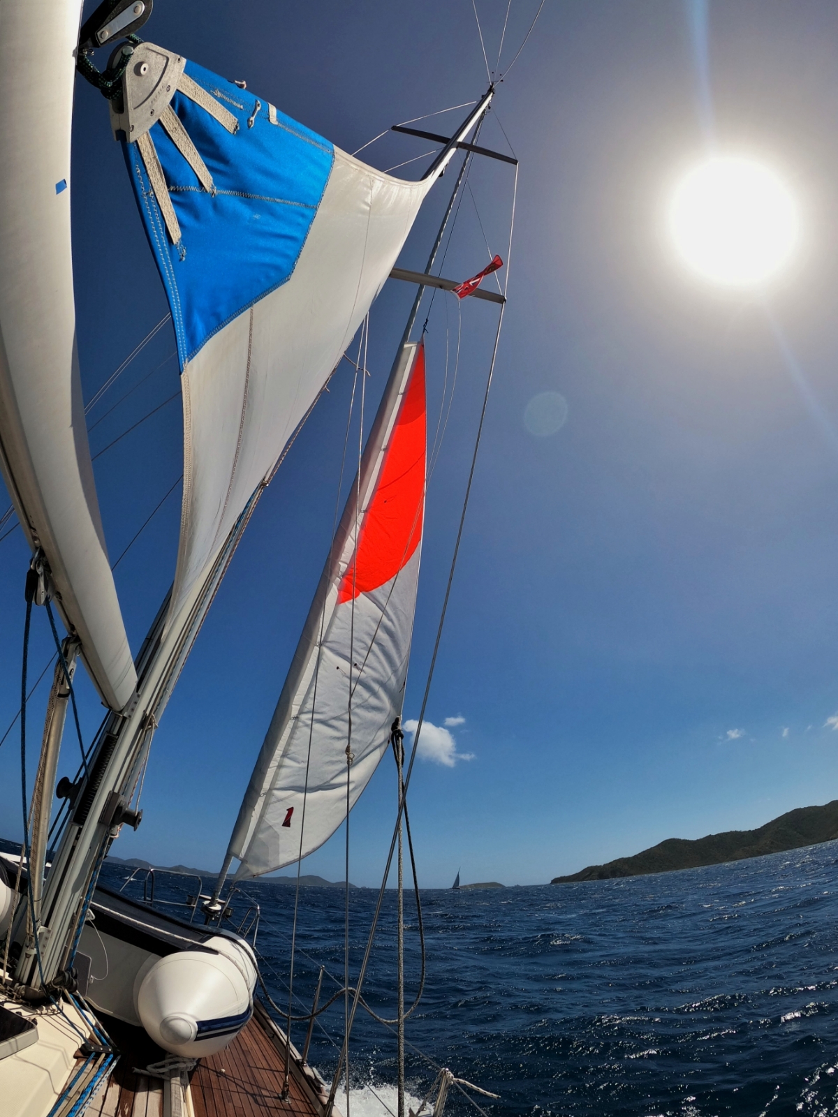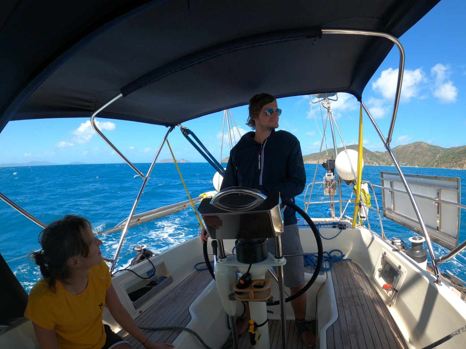 Am Weg nach Peter Island macht sich Jimi als Rudergänger damit vertraut, wie sich das Boot in Böen verhält. Aha, wenn die Böe kommt, krängt das Schiff, wenn die Böe aufhört fallen wir unkontrolliert ab, machen keine Fahrt mehr und können das Ruder nicht bewegen. Momeeeeent. Nach kurzer Recherche dieses doch eher ungewöhnlichen Phänomens bemerken wir, dass wir uns in einer Fischerboje verfangen haben. 20 Minuten und ein paar Muschelschnitte später sowie den glücklicherweise nicht erforderlichen Einsatz einer Person im Wasser schaffen wir es uns ohne Folgeschäden aus der Lage zu befreien.