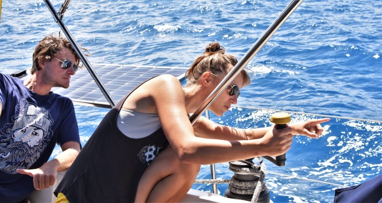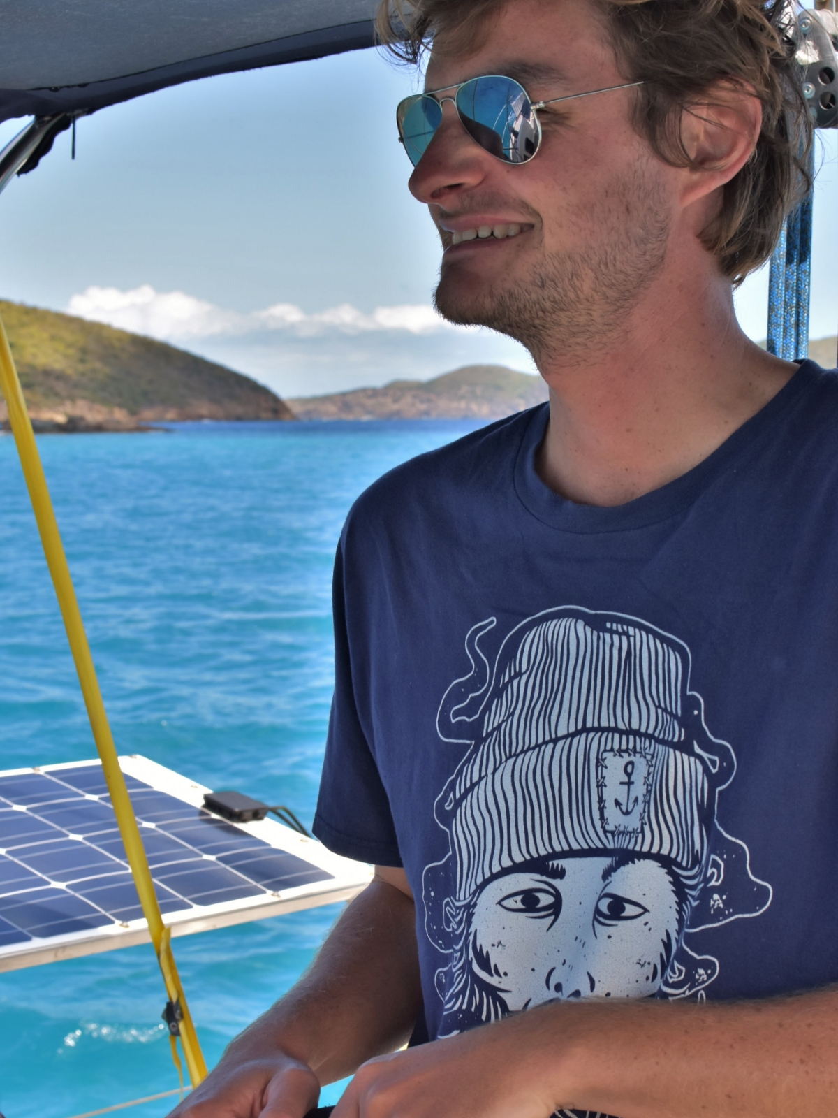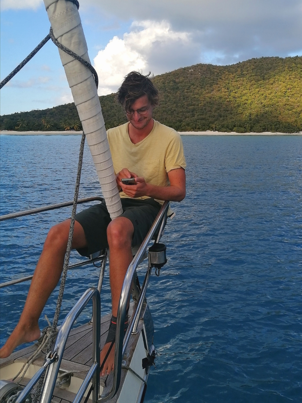 Am Weg nach Peter Island macht sich Jimi als Rudergänger damit vertraut, wie sich das Boot in Böen verhält. Aha, wenn die Böe kommt, krängt das Schiff, wenn die Böe aufhört fallen wir unkontrolliert ab, machen keine Fahrt mehr und können das Ruder nicht bewegen. Momeeeeent. Nach kurzer Recherche dieses doch eher ungewöhnlichen Phänomens bemerken wir, dass wir uns in einer Fischerboje verfangen haben. 20 Minuten und ein paar Muschelschnitte später sowie den glücklicherweise nicht erforderlichen Einsatz einer Person im Wasser schaffen wir es uns ohne Folgeschäden aus der Lage zu befreien.