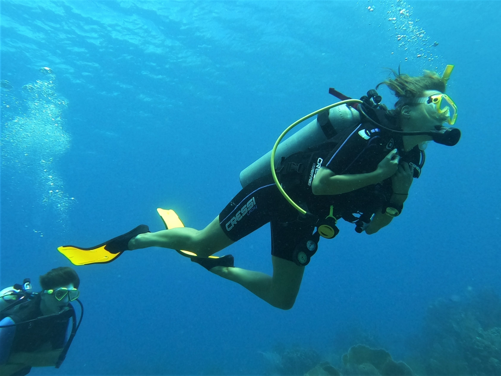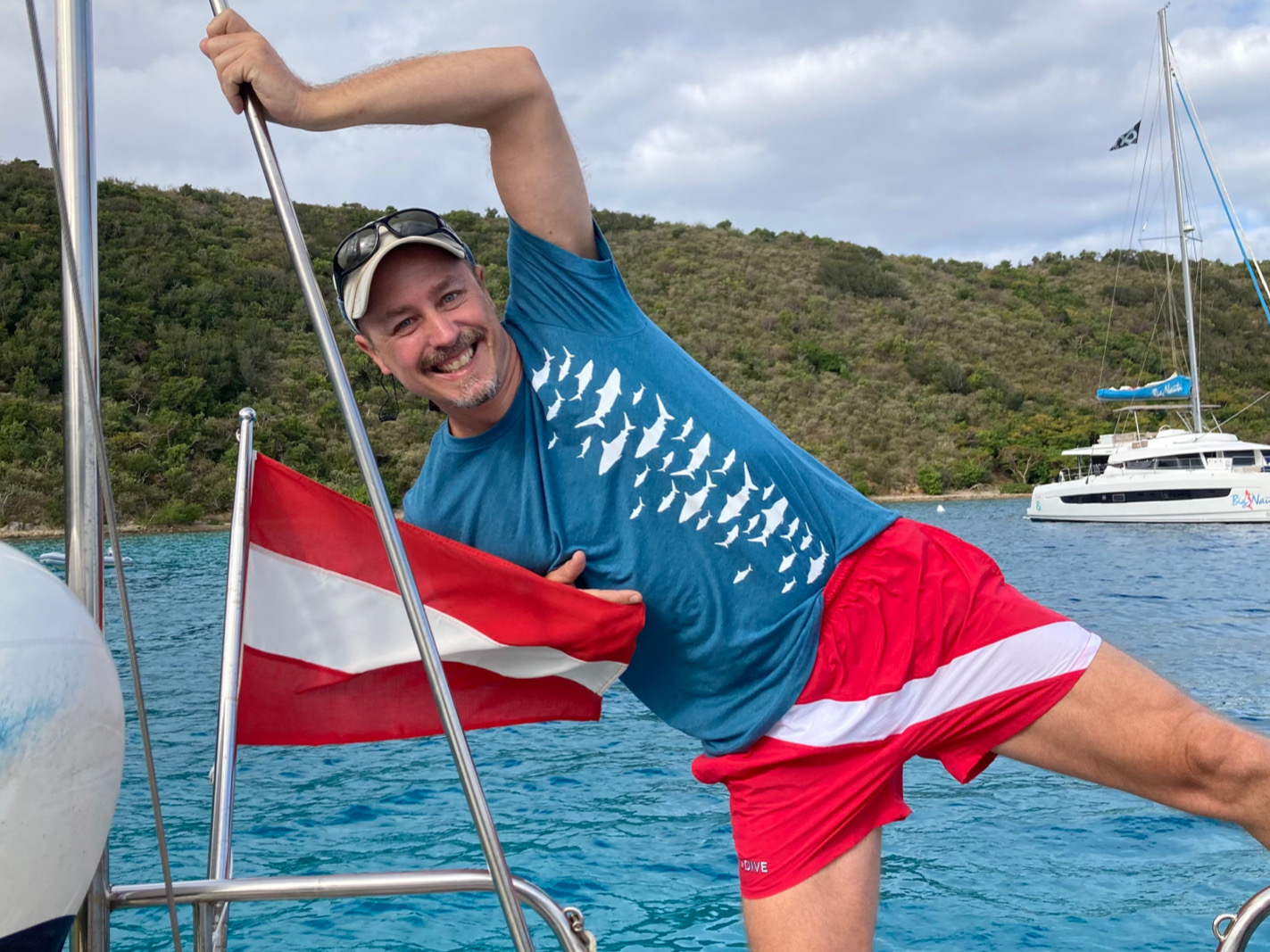 Ich, in der einen Hand ein Geodreieck, in der anderen einen Apfel, kreuze lernwillig bei der Tauchbasis in Nanny Cay auf. Während ich mich hinter Jimi und Bernhard verstecke, fangen die beiden in ihrer Routine schon mal an das Tauchboot zu beladen. Meine Theorieeinheiten beschränken sich auf einen kurzen Kreuzerltest, der ein Kinderspiel sein sollte, hätte ich das e-learning schon abgeschlossen. Mangels (stabilem) Wifi hab ich aber erst ein paar Absätze gelesen. Zum Glück versucht PADI aber scheinbar nur komplette Dussel auszufiltern und ich bestehe das Quiz mit 100 % (ohne Schummeln!) – juhuuu! In den BVIs ist das Meer das Pool und so werd ich mit dem gesamten Equipment auch gleich aufs Tauchboot geladen. Eine glückliche Fügung des Schicksals erlaubt uns, das Tauchboot für uns alleine zu haben: Jimi und Bernhard tauchen mit ihrem nordirischen, halbwitzigen Guide Kyle und ich mit meiner New Yorker Instructorin Kelsey. Der Einfachheit halber kommen beim nächsten Tauchgang noch eine Cathy und eine Casey dazu.