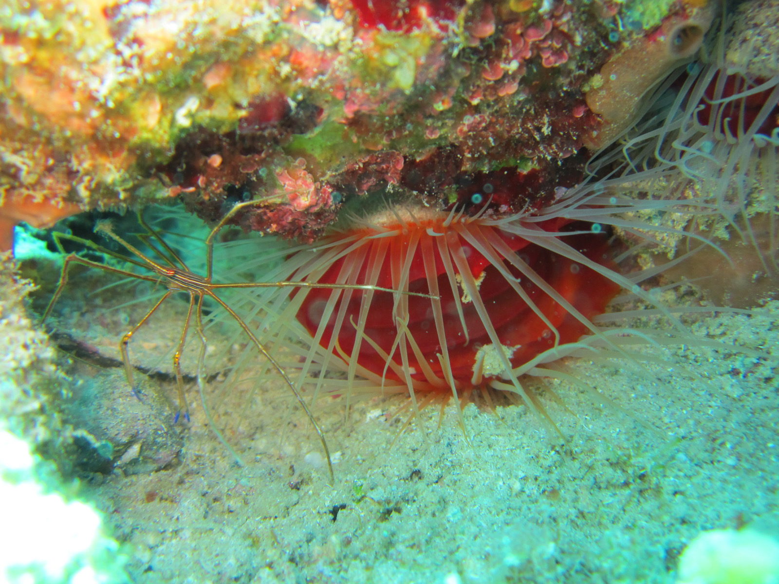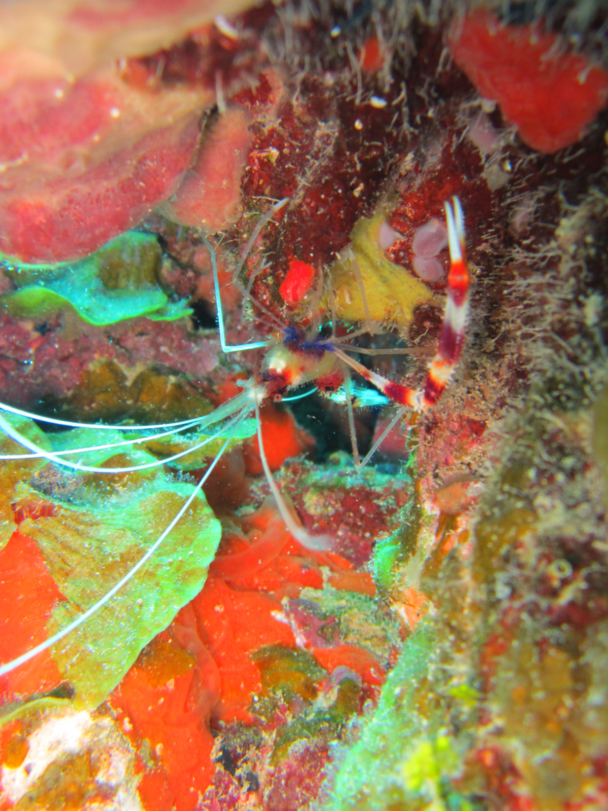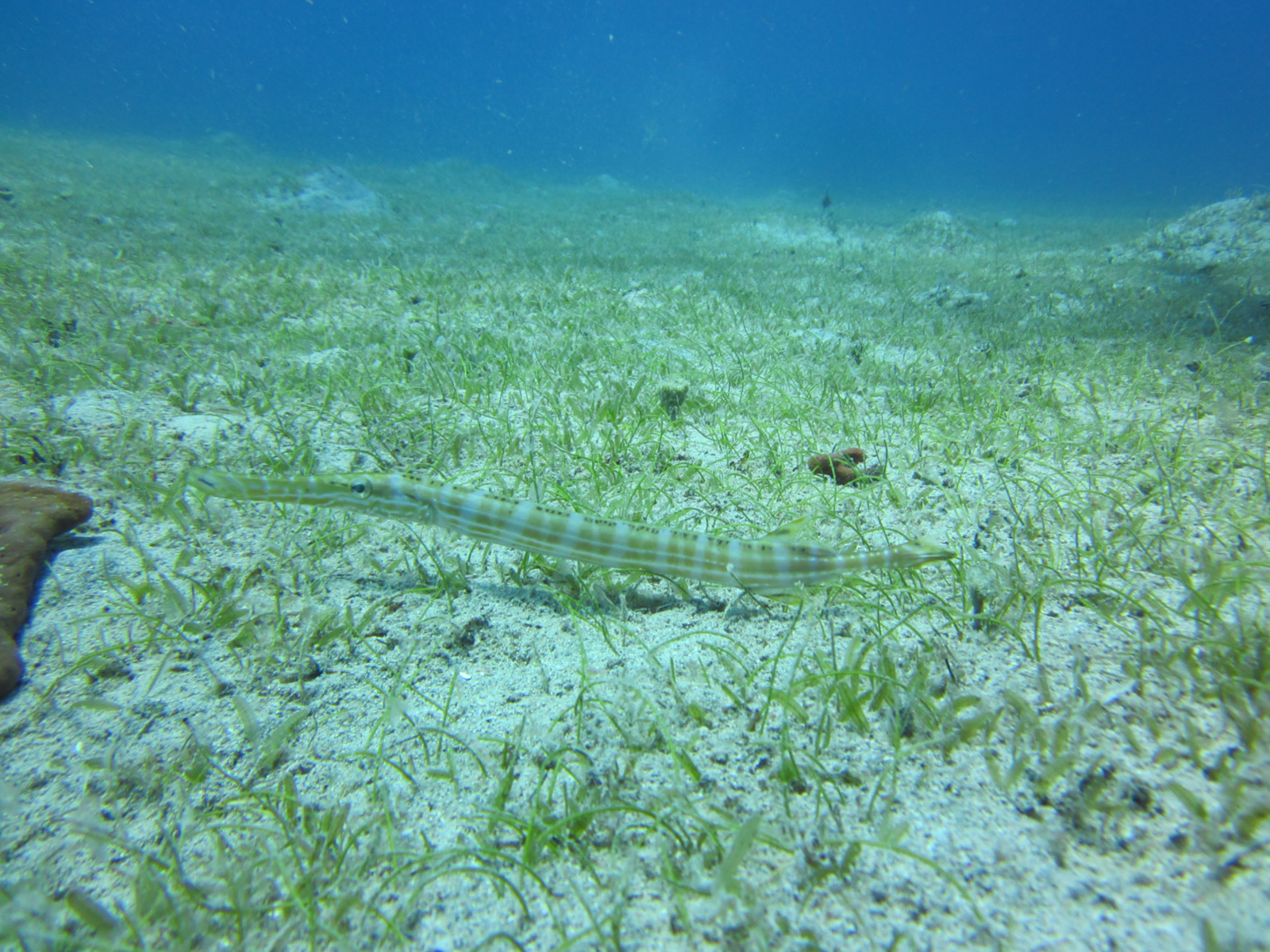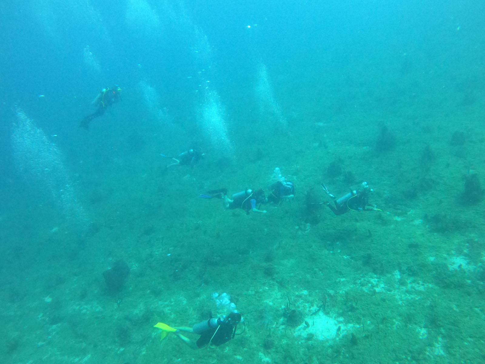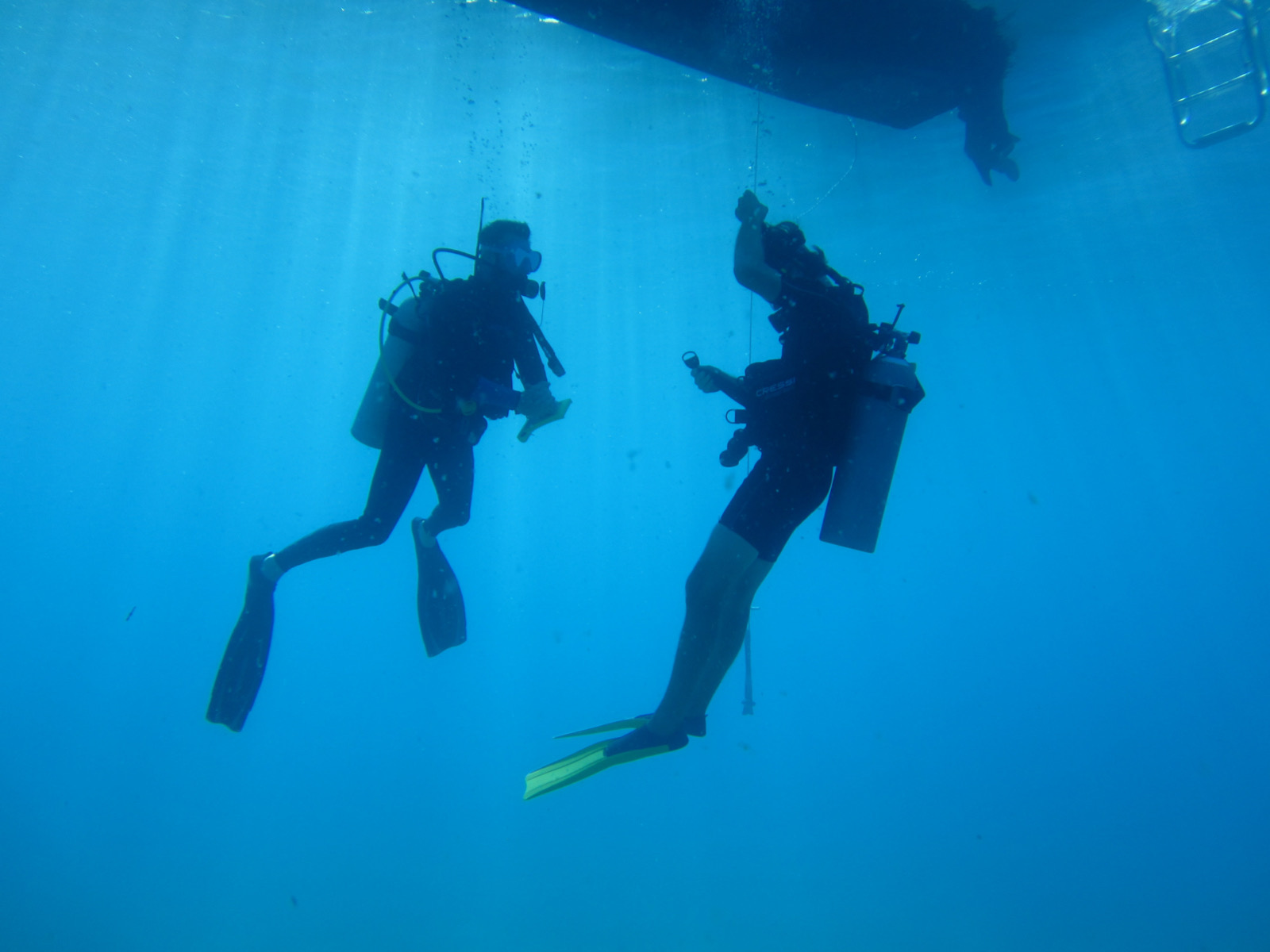 Während die fortgeschrittene Gruppe auf ihrem ersten Tauchgang in der Kelly Cove Pediküreshrimps (Darling, wie schauen denn deine Nagelhäute aus!?), Gruselmuränen und Zwickkrabbler (die echten Namen der Fische muss man erst im Advanced Kurs lernen) beobachten, plantsche ich mit Kelsey im Flachwasser und lerne Dinge wie: Was passiert, wenn ich mir beim Winken den Atemschlauch aus dem Mund ziehe und wie klaue ich einem anderen Taucher artgerecht die Maske, wenn ich meine vergessen hab.
