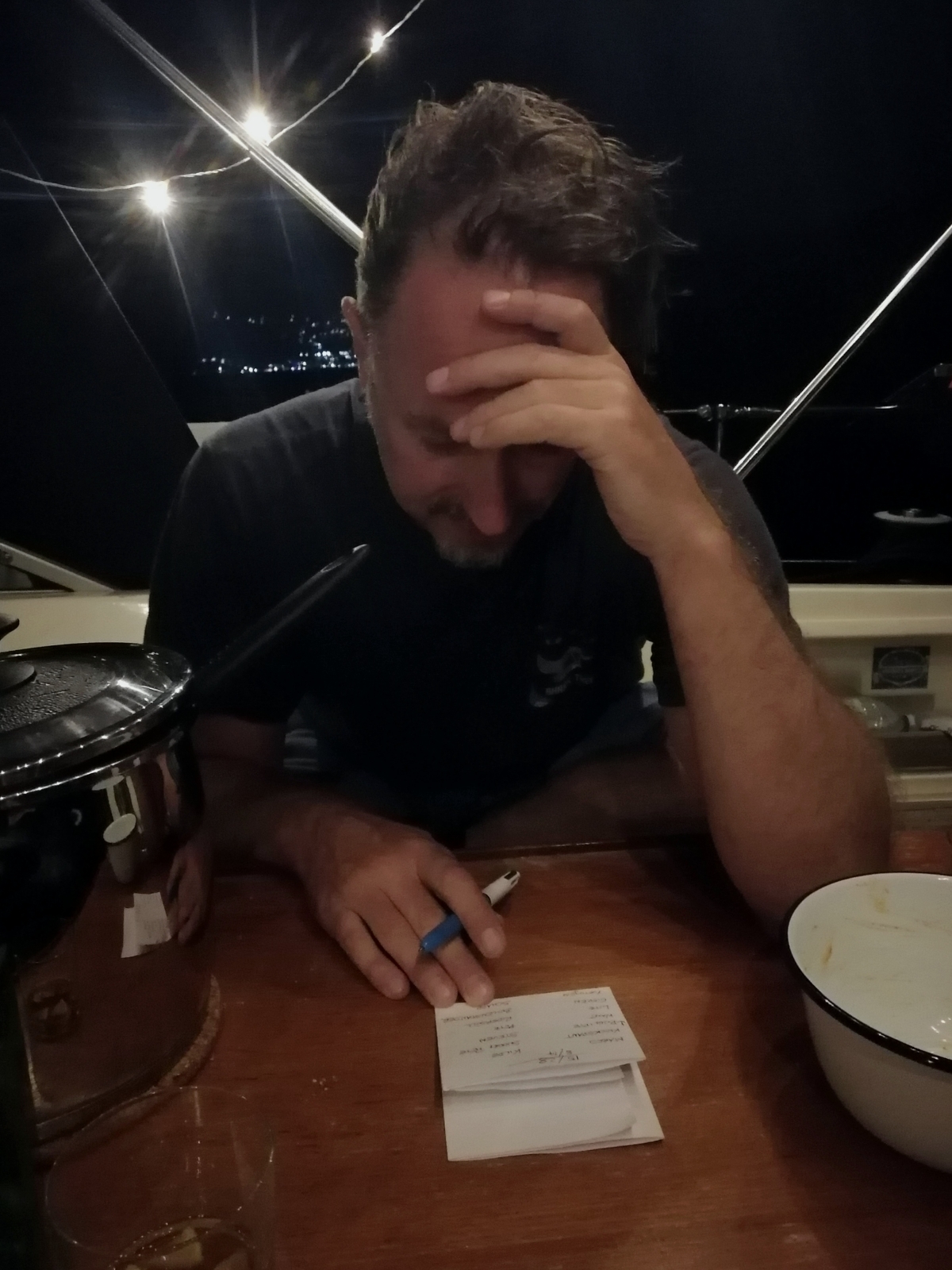 Nach Frühstück im Cafe, proviantisieren und Wasser füllen verbringen wir am nächsten Tag noch eine gemütliche knappe Stunde an der Tankstelle und warten auf den Lkw, der die Tankstelle betankt. Beim Ausfahren aus der Marina werden wir von einer wütend herumspringenden Lady mit Tröte angehupt und angepöbelt, da sie entweder die Größe ihres Katamarans oder die Größe unserer sehr schlanken Mêlée über- oder die Breite der Zufahrt unterschätzt. Wir können sie einem früher belauschten Funkspruch zuordnen, in dem sie ein anderes Schiff auf Kanal 16 anpöbelt, es solle sich doch an die Vorrangregeln halten, wobei die Antwort des anderen Schiffs in etwa so ausfällt: ähm, ja eh!?