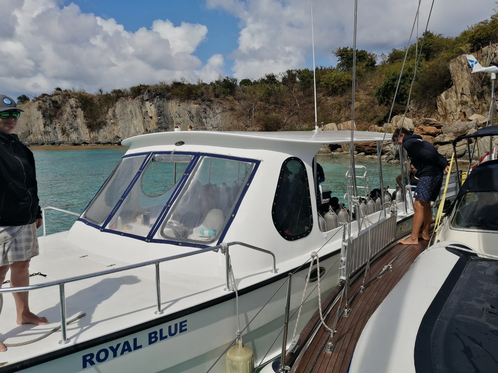 Rendezvous. Das ist Französisch und bedeutet, nach dem Frühstück mit dem Fernglas nervös nach einem heranbrausenden Tauchboot Ausschau zu halten. Dieses Erlebnis hatten wir zuerst vor Anker auf Norman Island, wo wir diesmal das legendäre Discoschiff Willy-T nur aus sicherer Entfernung erleben. Gekonnt legt die heute gut besetzte Royal Blue längsseits an Mêlée an und wir steigen mit unseren sieben Sachen über, um zu den heutigen Tauchplätzen zu fahren. Auch für Jimi mit zigmillionen Tauchgängen im Logbuch eine Premiere.