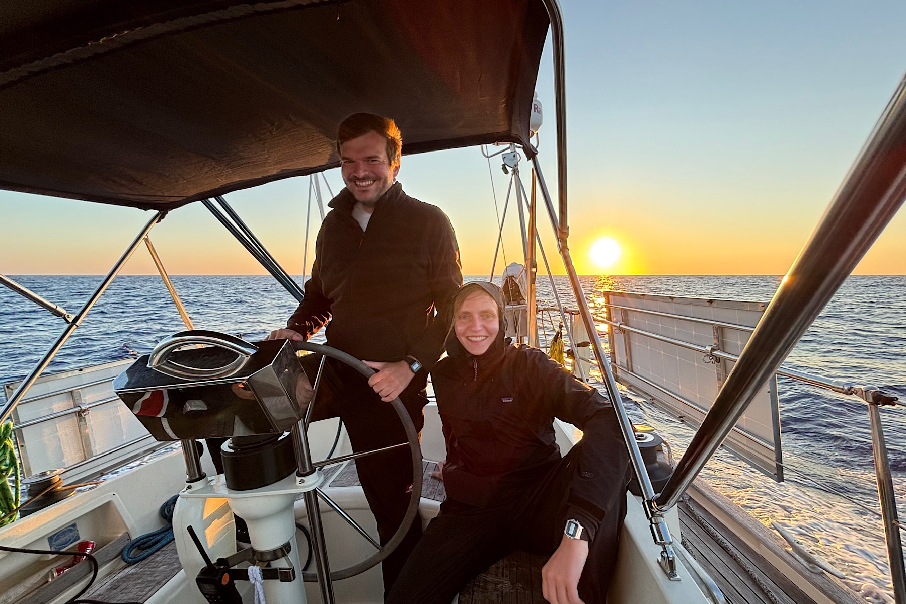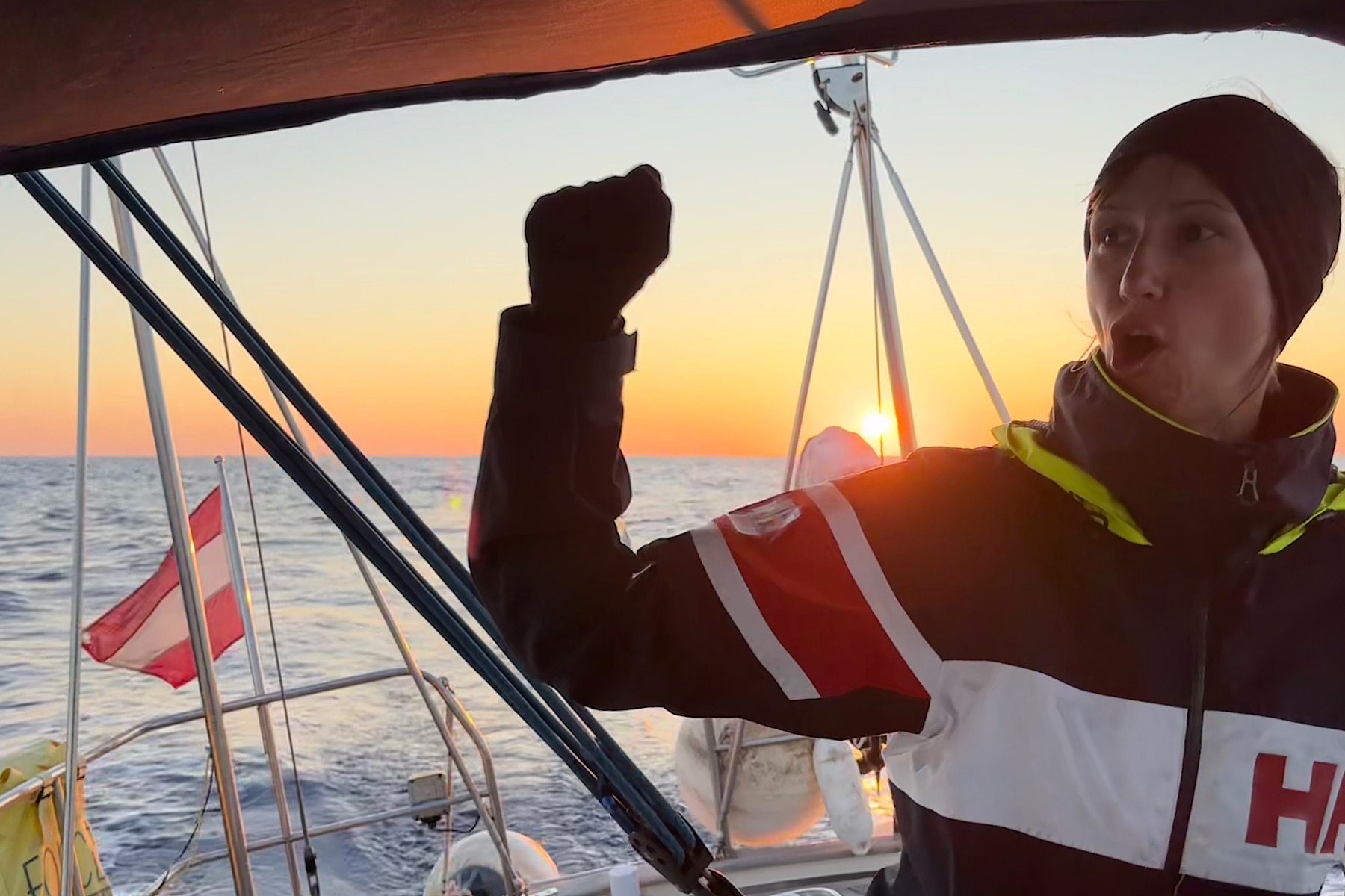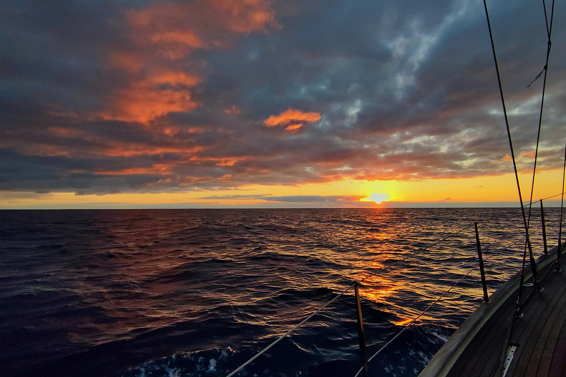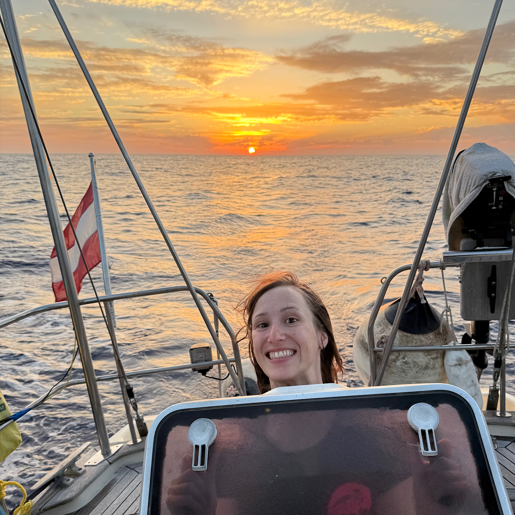Während meiner ersten Nachtschicht überlege ich fast durchgehend, wann wohl die erste Welle über Deck bricht – und ob so ein Segelboot wohl wirklich nicht so leicht kentern kann. Spoiler: Ich bin trocken geblieben und wir sind nicht gekentert. Und irgendwann – nach den zähen ersten 48 Stunden stellt sich tatsächlich auch irgendwann Freude ein: stabiler Halbwindkurs, Tunfischpasta, zauberhafter Sonnenuntergang und glitzerndes Plankton bei Nacht.