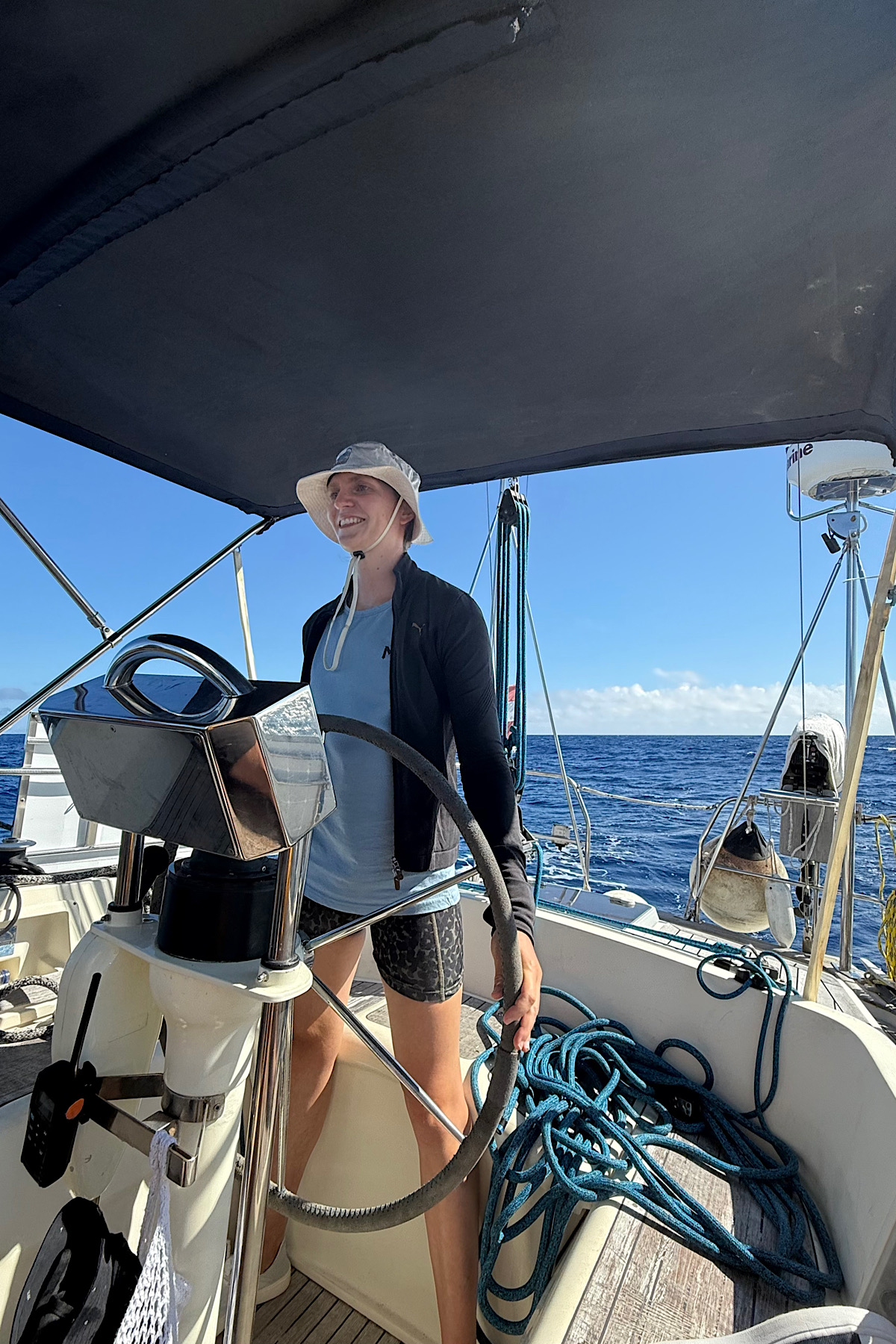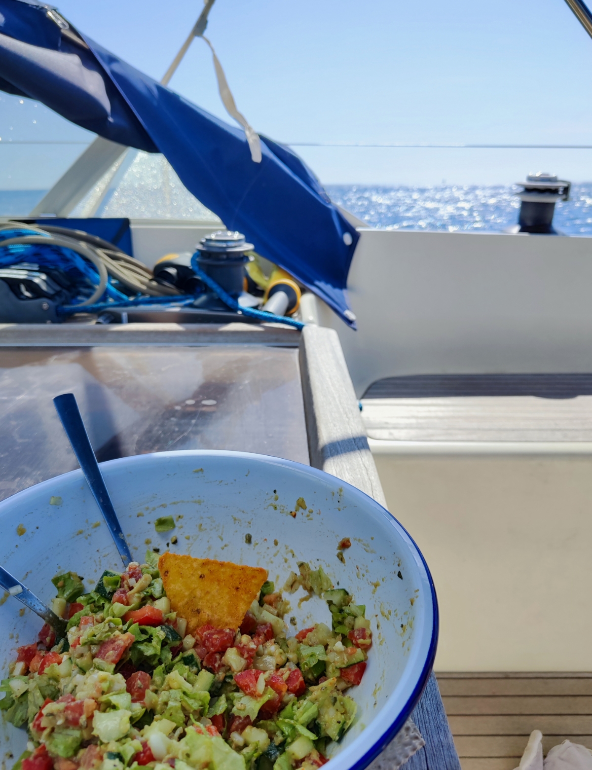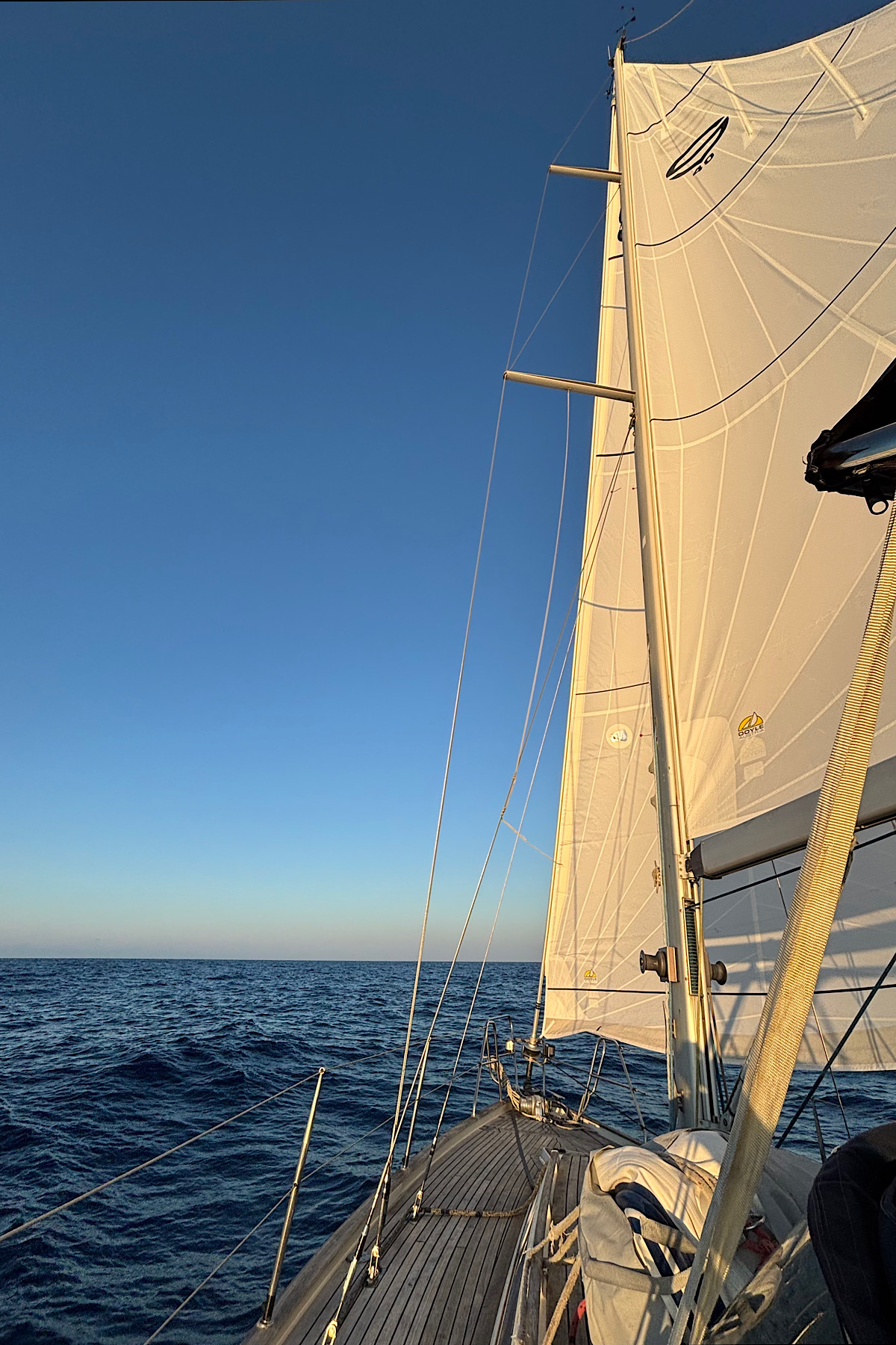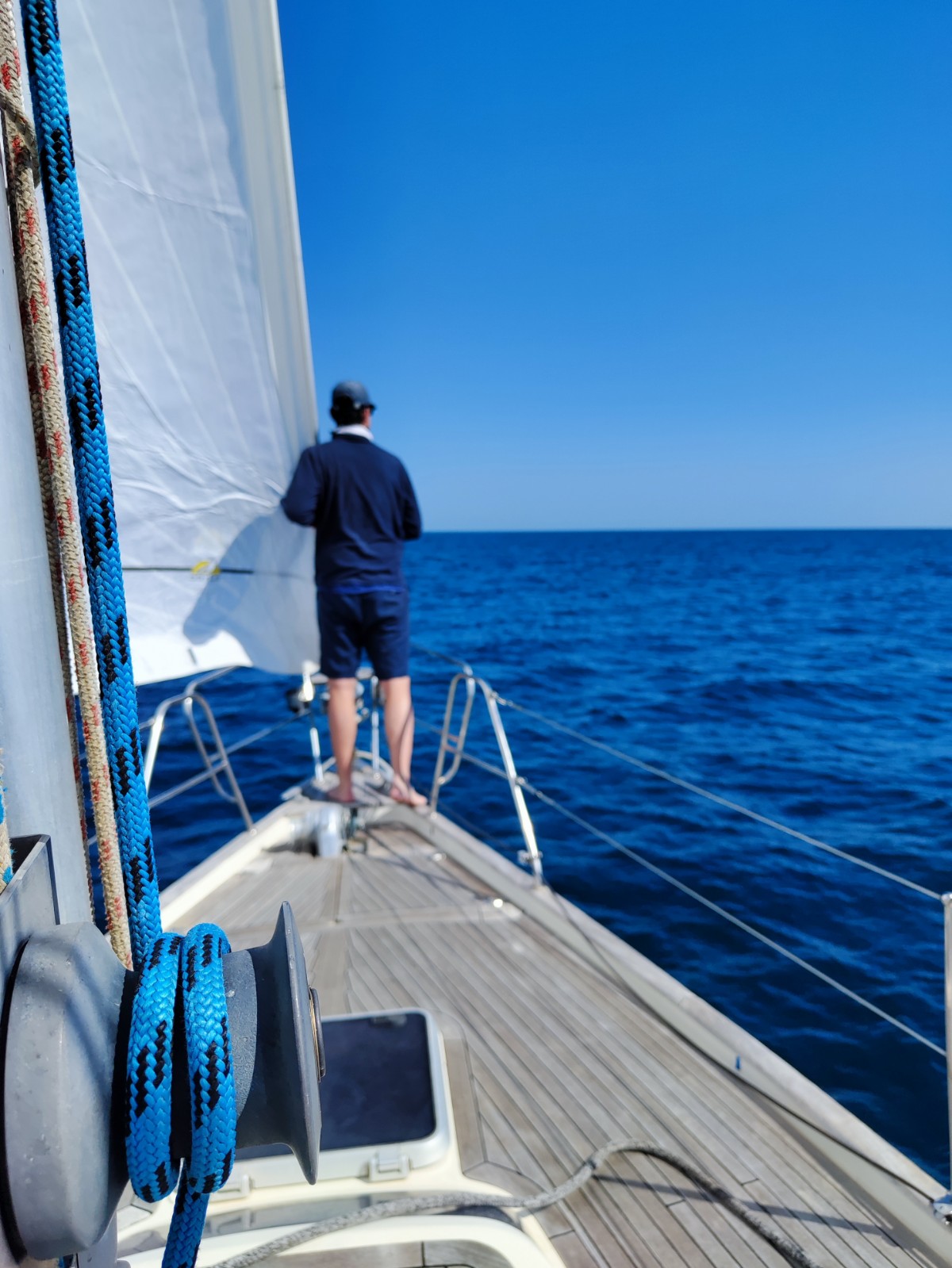 Während meiner ersten Nachtschicht überlege ich fast durchgehend, wann wohl die erste Welle über Deck bricht – und ob so ein Segelboot wohl wirklich nicht so leicht kentern kann. Spoiler: Ich bin trocken geblieben und wir sind nicht gekentert. Und irgendwann – nach den zähen ersten 48 Stunden stellt sich tatsächlich auch irgendwann Freude ein: stabiler Halbwindkurs, Tunfischpasta, zauberhafter Sonnenuntergang und glitzerndes Plankton bei Nacht.