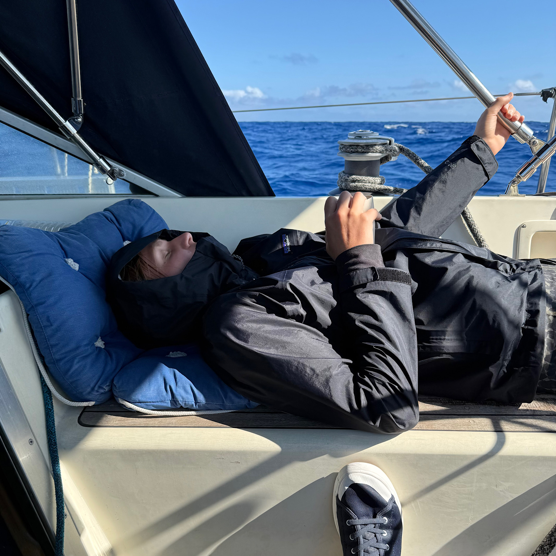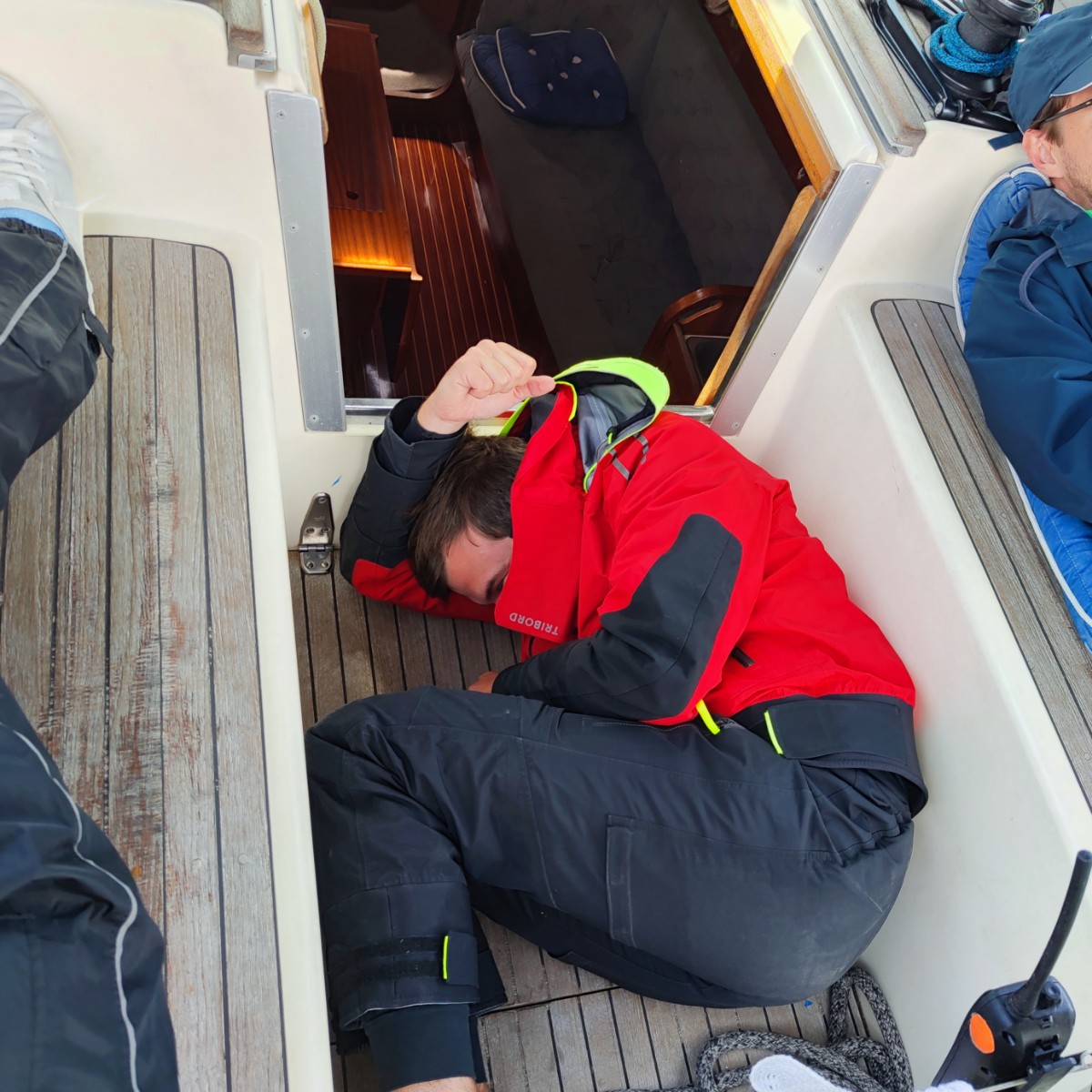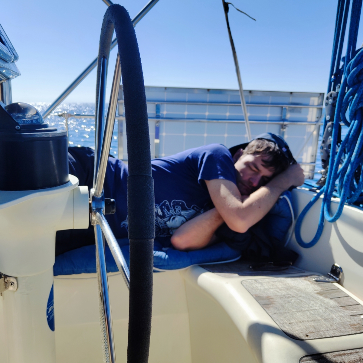 Schon nach sehr kurzer Zeit auf See ist klar – zu viert ist besser als zu zweit! Auch wenn man nicht ganz so viel zum Schlafen kommt wie man es sich vielleicht erträumen würde, ist es diesmal doch erheblich mehr als wir gewohnt sind. Wir arbeiten nach dem Wachsystem 3 Stunden – 3 Stunden – 3 Stunden und die vierte Person übernimmt dann (meist nicht ausgeschlafen, aber immerhin weniger durchgefroren) bei Sonnenaufgang das Steuer (manch einer munkelt etwas über eine Scam-Schicht). Tagsüber steuern wir abwechselnd immer eine Stunde händisch, was Autopilot und Batterie ganz erheblich entlasten und uns gute Übung und Zeitvertreib bietet.