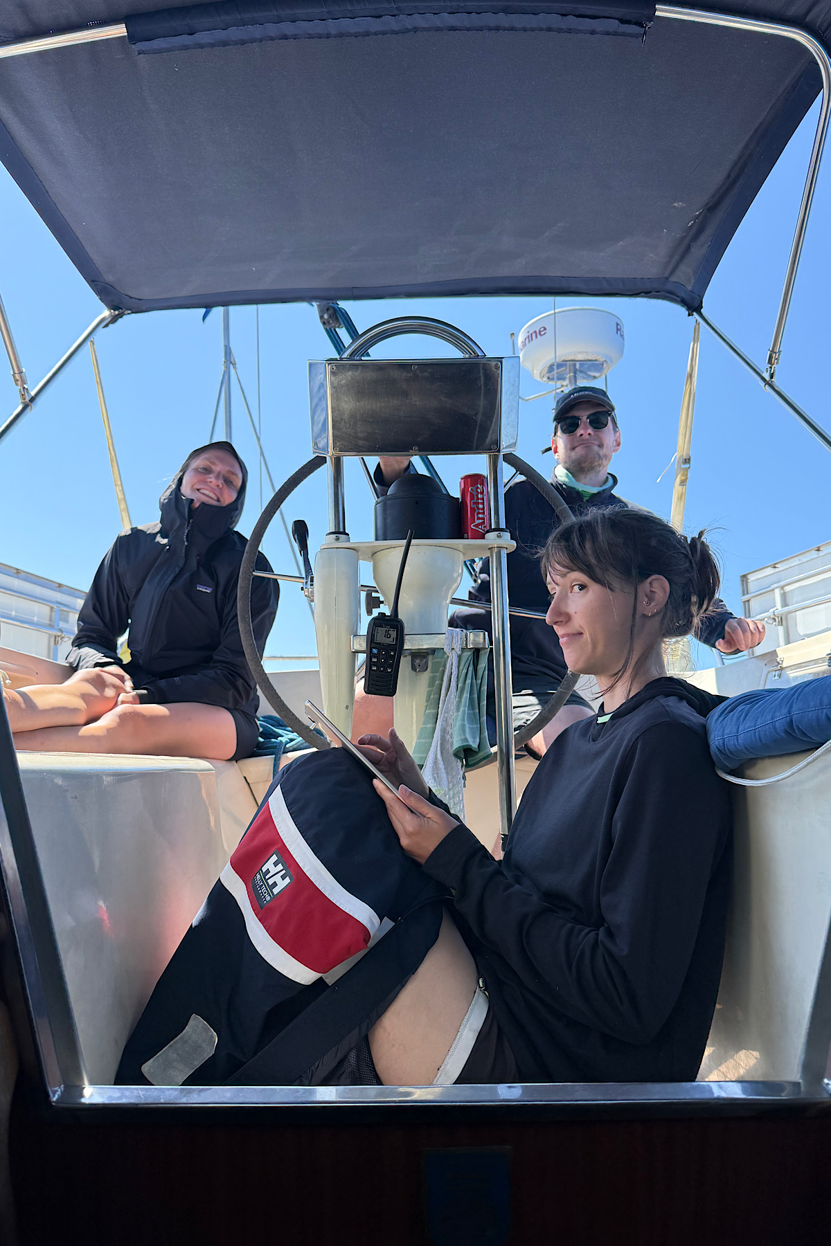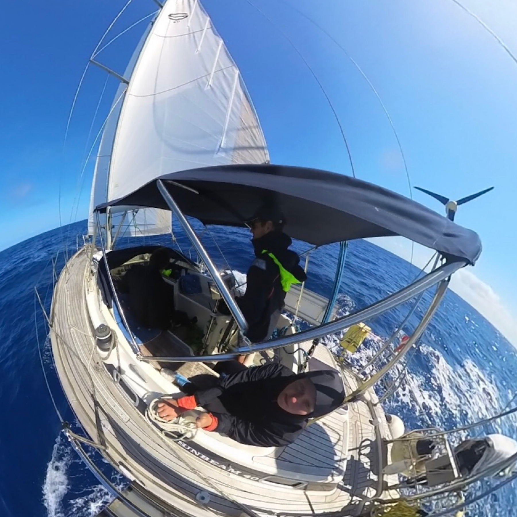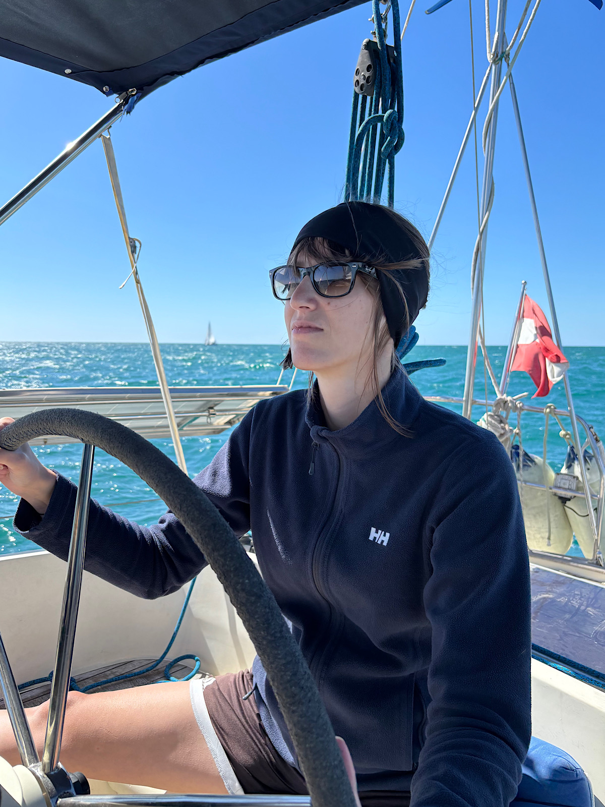 Schon nach sehr kurzer Zeit auf See ist klar – zu viert ist besser als zu zweit! Auch wenn man nicht ganz so viel zum Schlafen kommt wie man es sich vielleicht erträumen würde, ist es diesmal doch erheblich mehr als wir gewohnt sind. Wir arbeiten nach dem Wachsystem 3 Stunden – 3 Stunden – 3 Stunden und die vierte Person übernimmt dann (meist nicht ausgeschlafen, aber immerhin weniger durchgefroren) bei Sonnenaufgang das Steuer (manch einer munkelt etwas über eine Scam-Schicht). Tagsüber steuern wir abwechselnd immer eine Stunde händisch, was Autopilot und Batterie ganz erheblich entlasten und uns gute Übung und Zeitvertreib bietet.