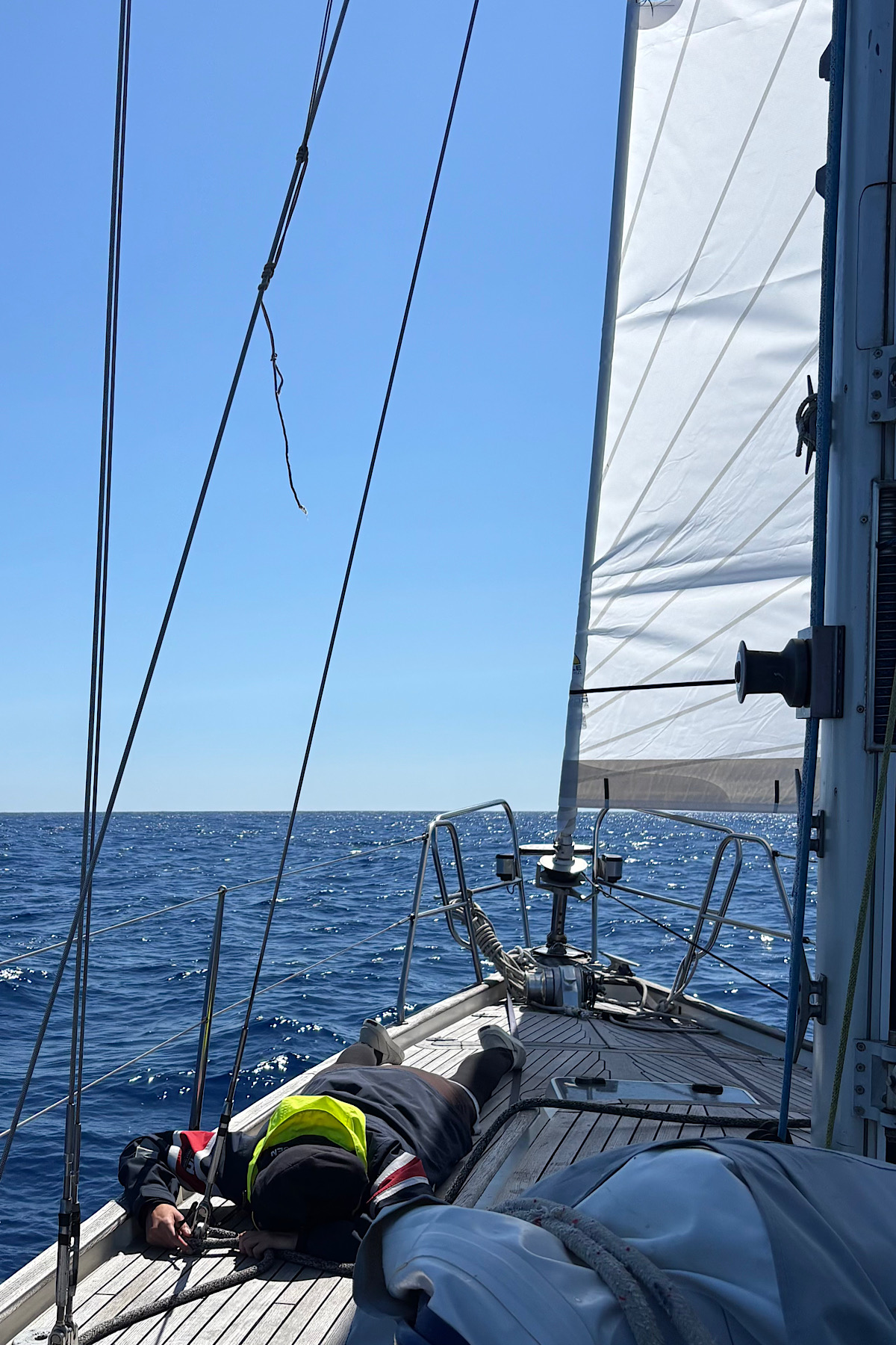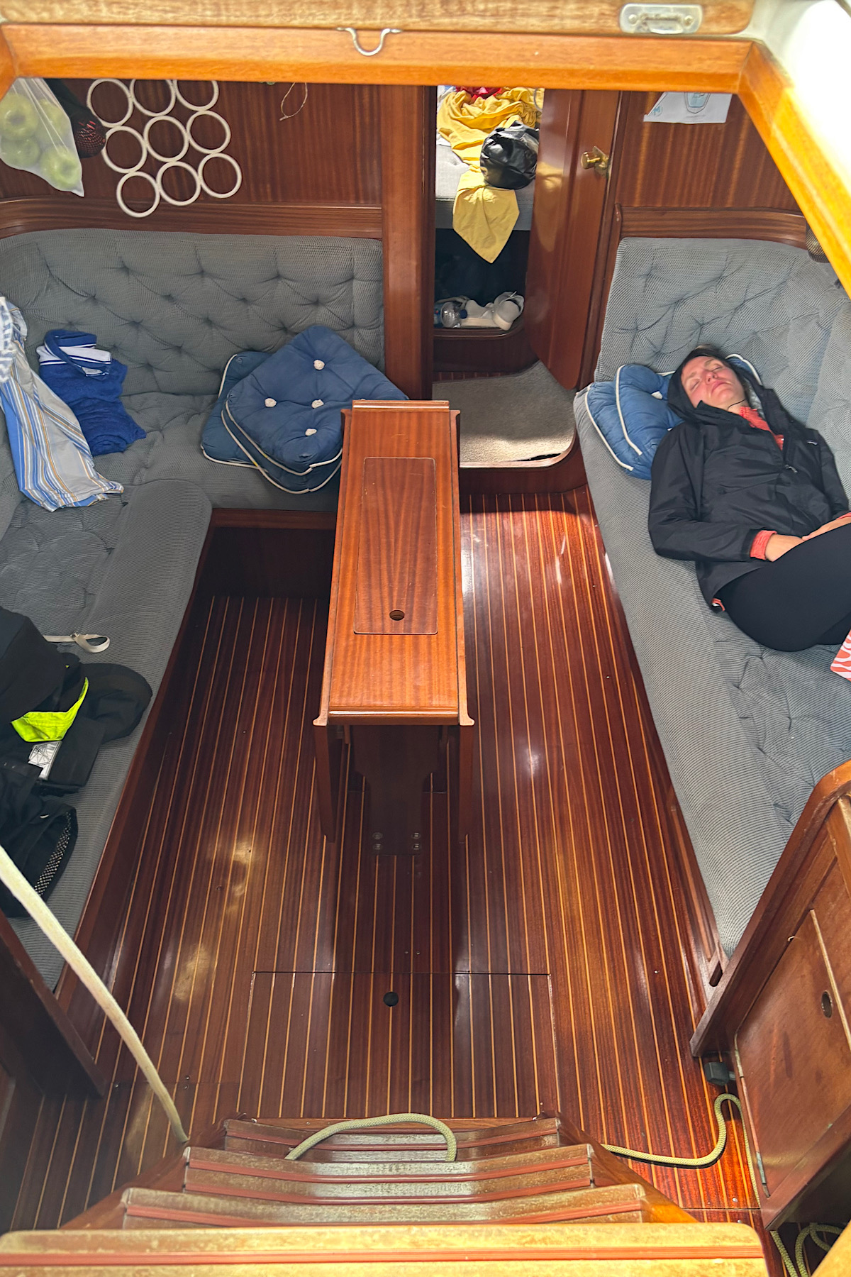 Rund um die Halbzeit ist für mich der mental anstrengendste Tag, da das Ziel (mittlerweile ist sicher, dass wir den Kurs nach Portugal beibehalten) noch in gefühlt unendlich weiter Ferne liegt. Der Schlafmangel macht sich deutlich bemerkbar, da ich in der Kabine weder unter Segel (schaukelig) noch unter Motor (laut) wirklich schlafen kann und daher auf kurze Naps im Cockpit oder am Salonboden zurückgreifen muss.