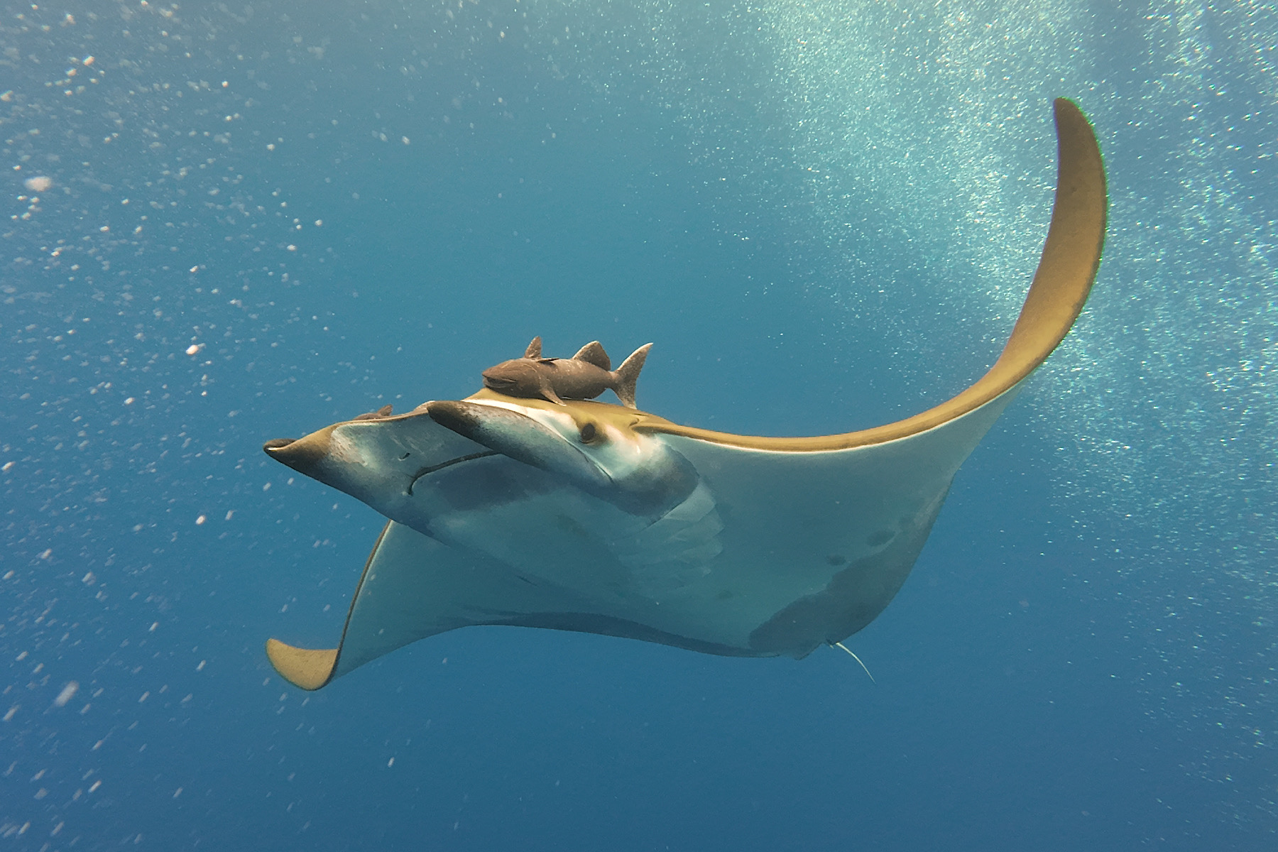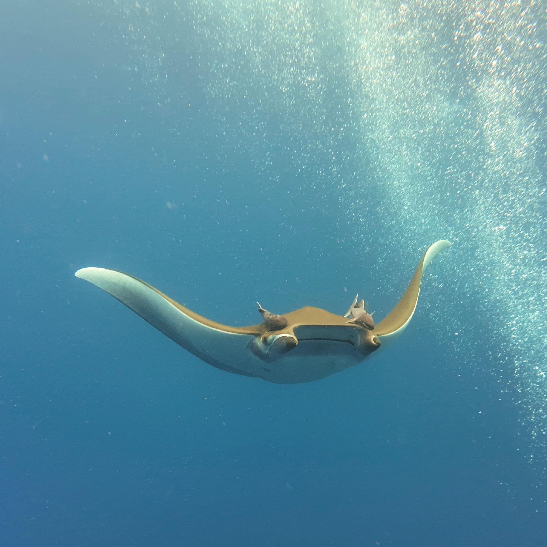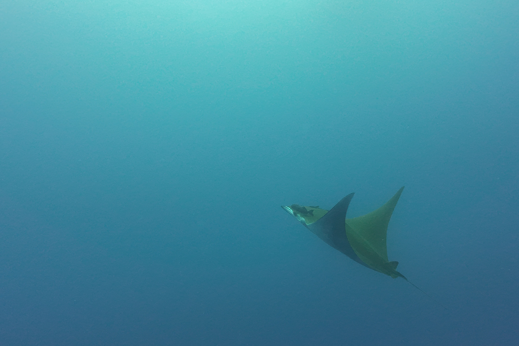 Wir lassen uns aber von solchen Lappalien nicht beirren und treten unsere langersehnten, weil uns letztes Jahr verwehrten, Tauchgänge an. Der erste Spot ist ein exponierter blue water Tauchgang, bei dem uns eine Familie majestätisch dahingleitender Riesenmantas begrüßt. Der zweite Tauchgang führt uns in ruhigere und gewohnte Gefilde, einem küstennahes Riff mit den üblichen Küstenriffbewohnern und dem drittgrößten Stachelrochen der Welt.