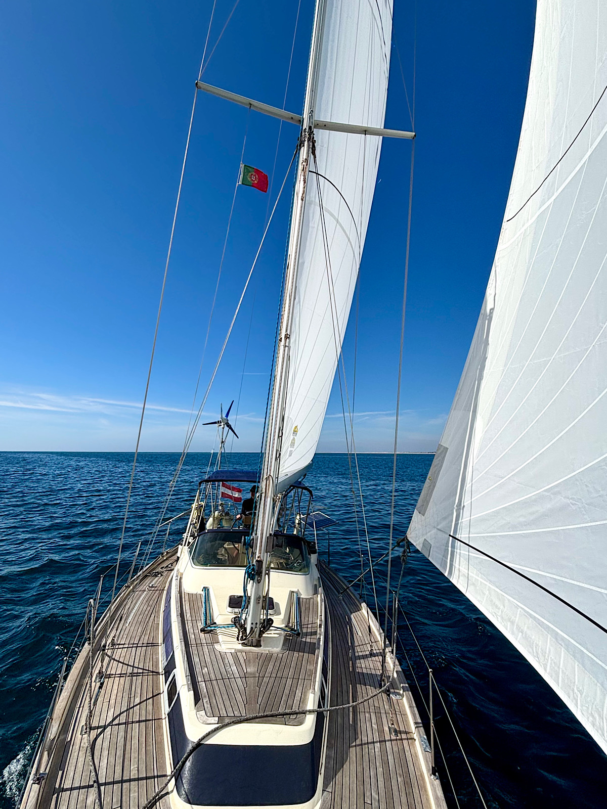 Die Vorbereitungen halten sich kurz und effizient, auch dank des für einen Tag gemieteten elektrischen Mustangs mit 300 PS. 36 Stunden nach Ankunft sind wir auch schon unterwegs und rasen mit unserer 47 PS Dampfmaschine, später auch unter vollen Segeln, Richtung Vilamoura. Rasen bedeutet in diesem Fall die Geschwindigkeit, mit der ein Rasen wächst.