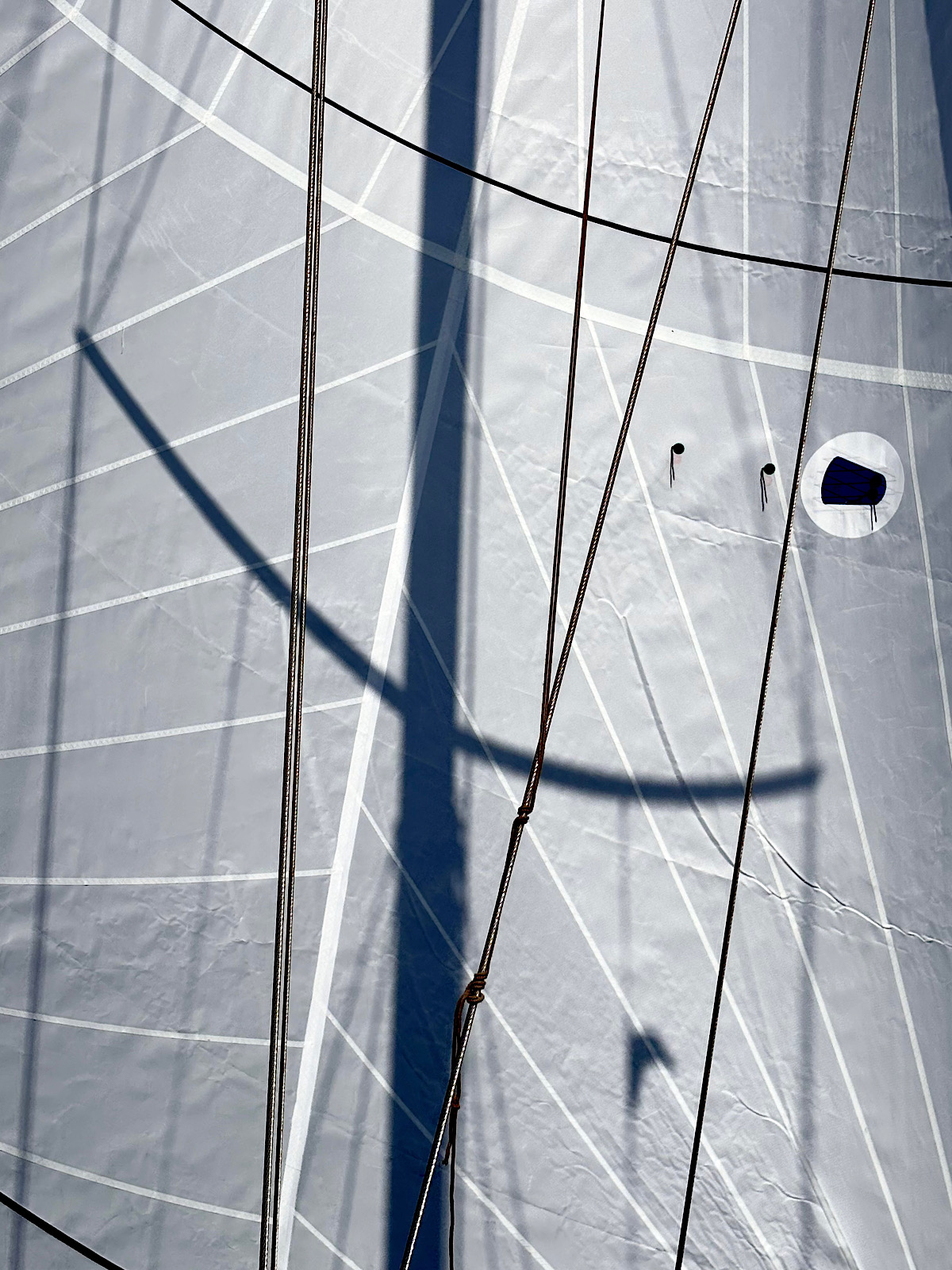 Da uns seit Ponta Delgada eine Mittelklampe fehlt, müssen wir uns bei achterlichem Wind eine neue Lösung als Preventer überlegen, um den Baum zu sichern – Robert bezeichnet die miese Konstruktion unabsichtlich, aber passenderweise als Pretender.