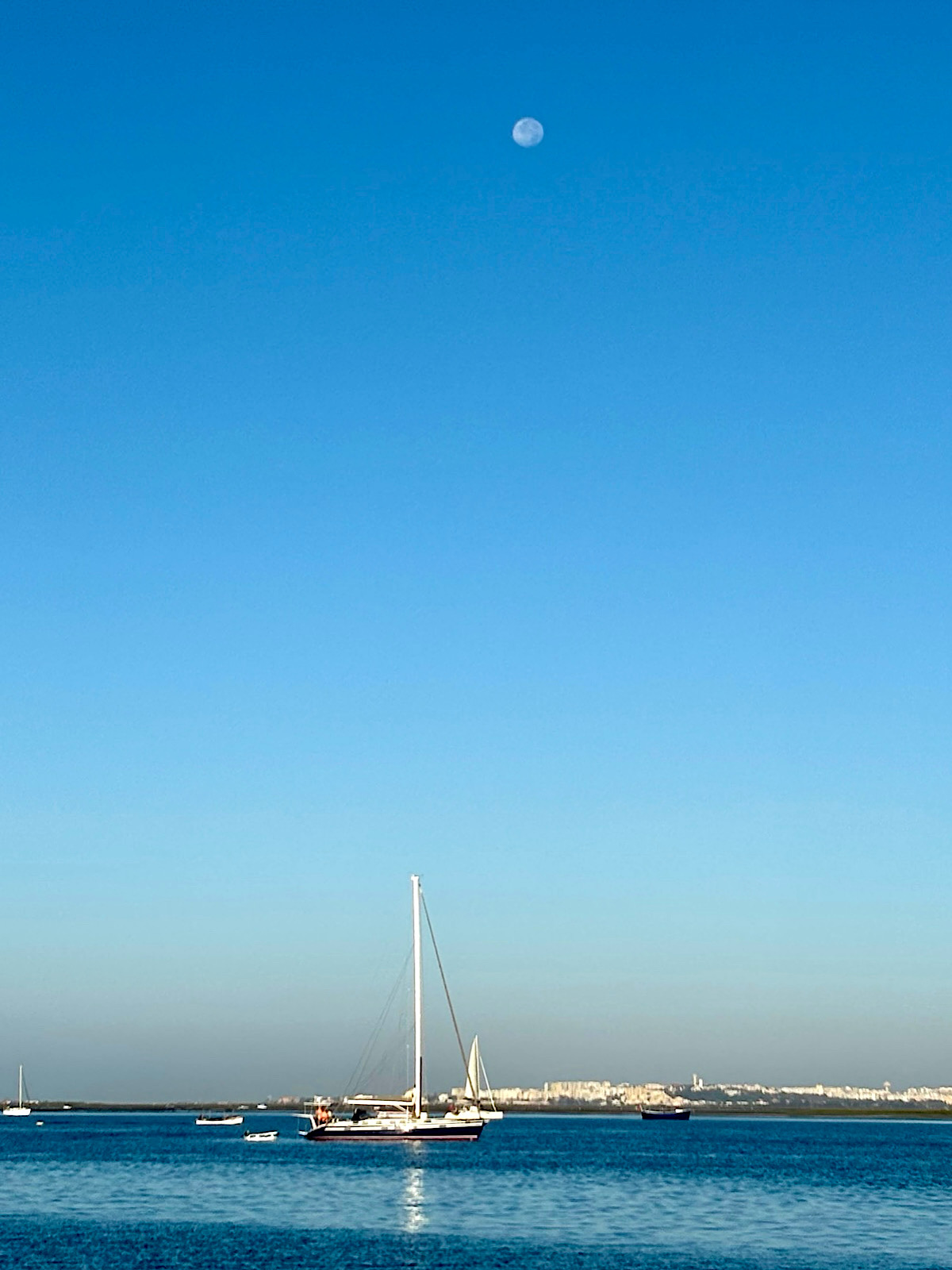 Gezeit: Die Bedingungen werden optimiert und kurz nach Niederwasser laufen wir bei Stillwasser (d.h. bei nur 1,5 kn Flussströmung) aus dem Hafen von Santo Antonio aus. Präzise treffen wir nach absichtlich ineffizientem Segeln und unserem ersten echten Badestopp im Atlantik zu Hochwasser (the tide is high) im Río Piedras ein. Plötzlich sind wir in Spanien und noch dazu in einem besonders spanisch klingenden Ort: El Rompido 💃🏻 liegt einige Meilen flussaufwärts und ist überhaupt nur bei Hochwasser erreichbar.