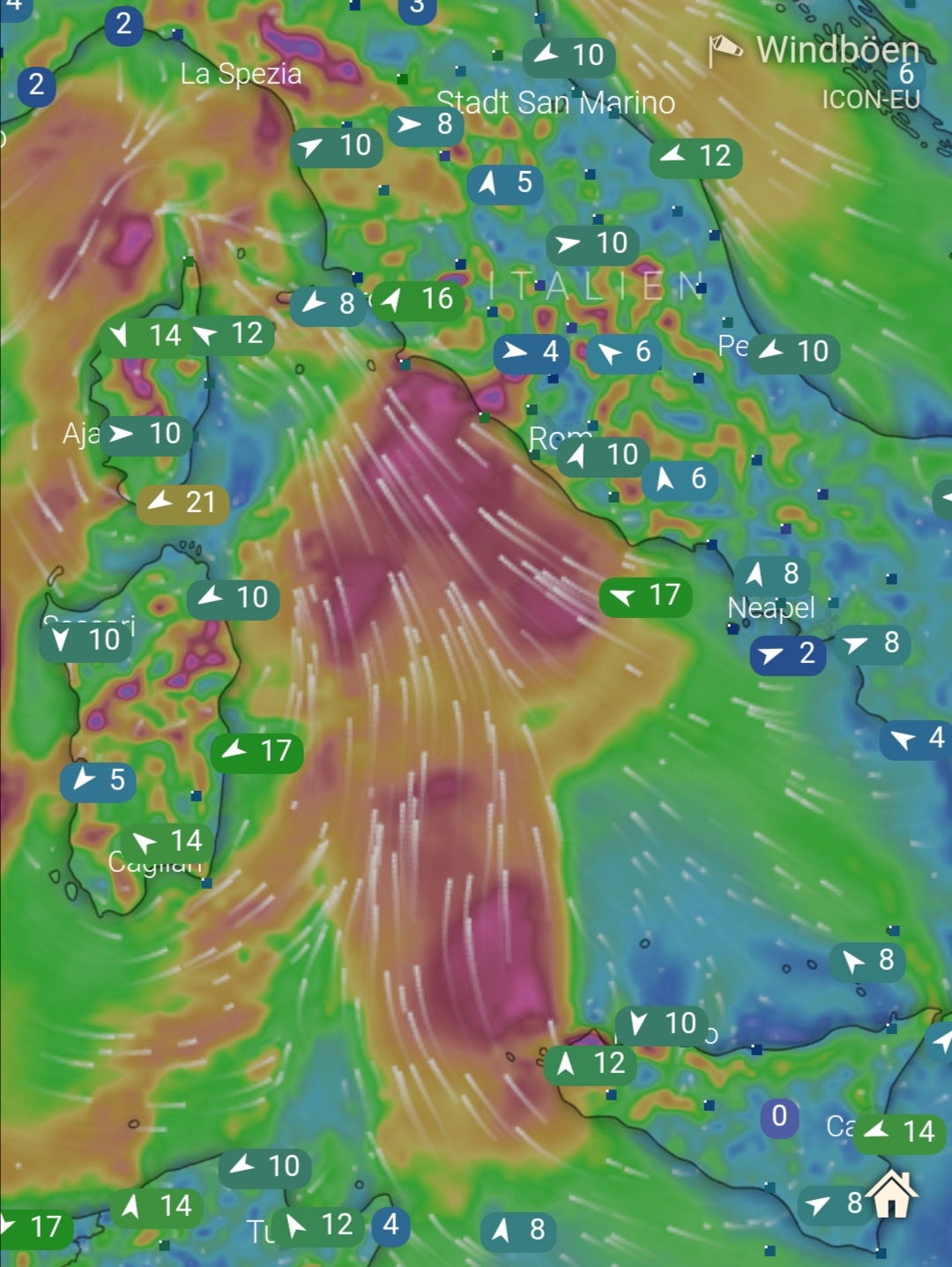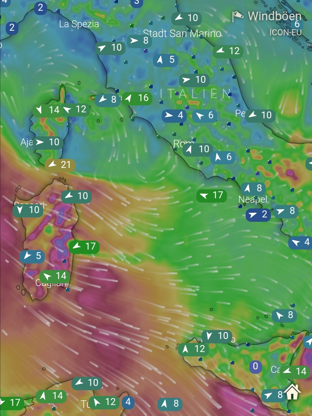 Heute, an dem Tag, an dem wir seit genau 2 Monaten auf unserem Schiff leben, verlegen wir unseren Liegeplatz noch einmal um ein paar Meter, um vor der Überfahrt mit unserem gerade eingetroffenen Gast Andreas (und damit Andi Nummer 3) noch einmal die Vorzüge einer Marina genießen zu können. Morgen werden wir dann also zu dritt zu der rund 40-stündigen Fahrt Richtung Balearen aufbrechen und dann erstmals die spanische Flagge setzen. Die Wetterlage scheint günstig. Ciao Sardegna, Arrivederci Italia!