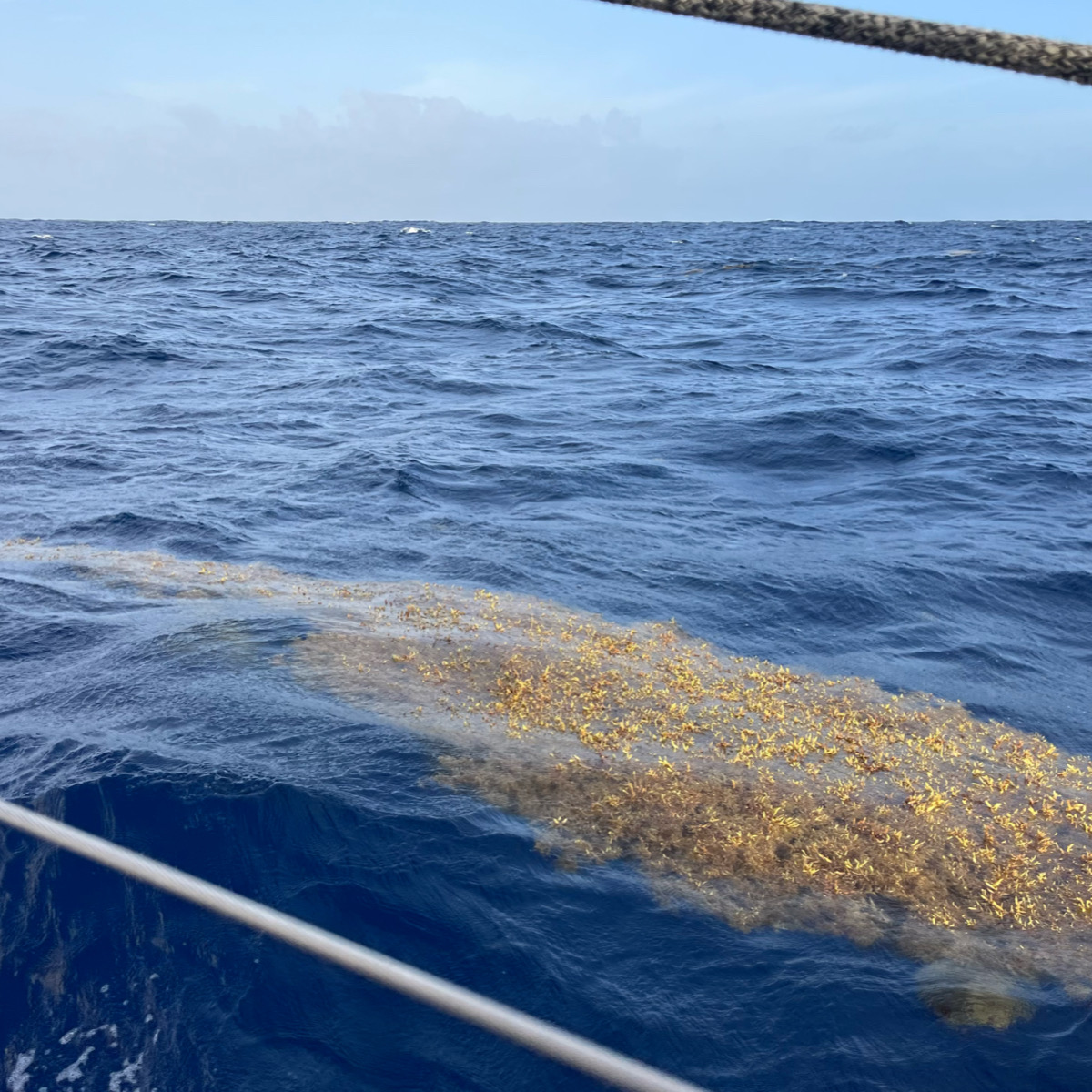 Spannend für uns ist, dass wir mitten am Ozean täglich einzelne Vögel sehen – hübsche, weiße mit papageienartigem Schnabel und langem, antennenförmigem Schweifgefieder. Einer davon hat sogar einen Grußschrei ausgestoßen als er nah an uns vorbeigeflogen ist. Vorsicht mit dem Windgenerator, gefiederter Freund. Hobbyornithologin Barbara hat uns verraten, dass es Weißschwanz-Tropikvögel sind. Außerdem sind weite Teile der Meeresoberfläche unserer Route mit grünlichen, runden Büscheln von ca. 20 cm Durchmesser bedeckt, die zumeist in Bahnen auftreten. Was das genau ist, haben wir bisher nicht herausgefunden.