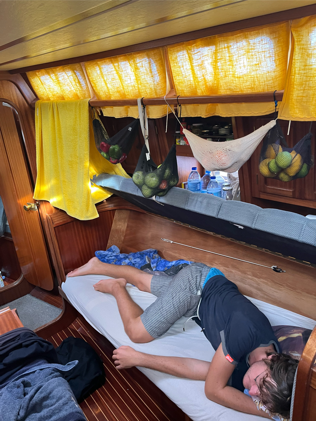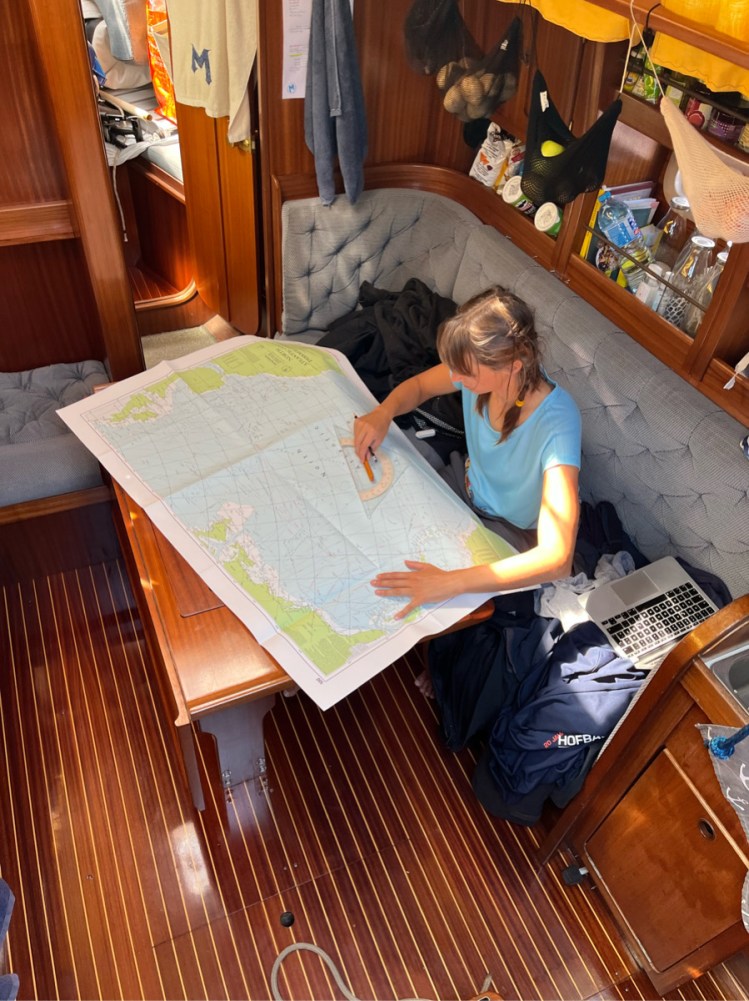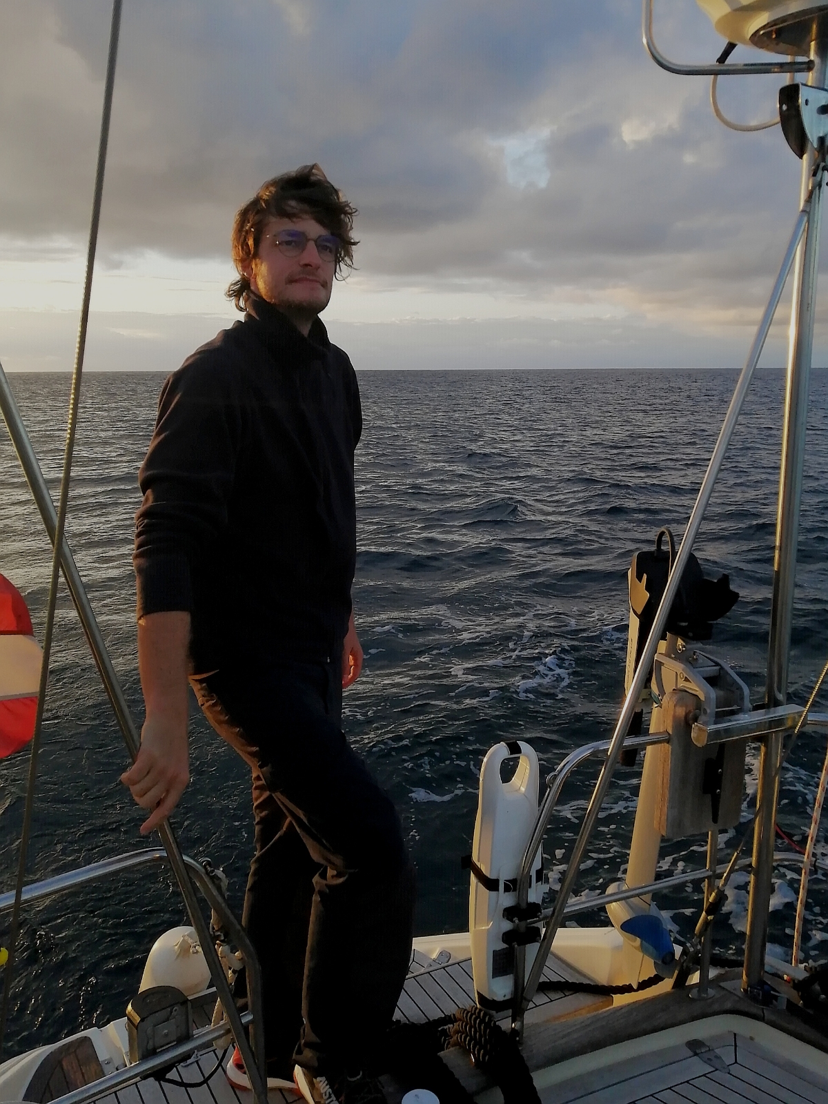 21:00 Die erste 4-Stunden-Schicht an Deck wird ebenfalls gern zum Abendessen genutzt. Während in der ersten Schicht noch wenig an Deck gedöst wird, stellen wir uns in den langen Schichten gern Sleeptimer auf 15-20 Minuten. In diesem Intervall kontrollieren wir Kurs, Segelstellung, AIS, Windstärke und machen einen Rundumblick. Für Windänderungen und Kollisionskurse mit anderen Schiffen haben wir zudem automatische Alarme gestellt. Gesteuert wird übrigens fast durchgängig von unserem fantastischen Autopiloten – er ist unser tüchtigstes Crewmitglied.