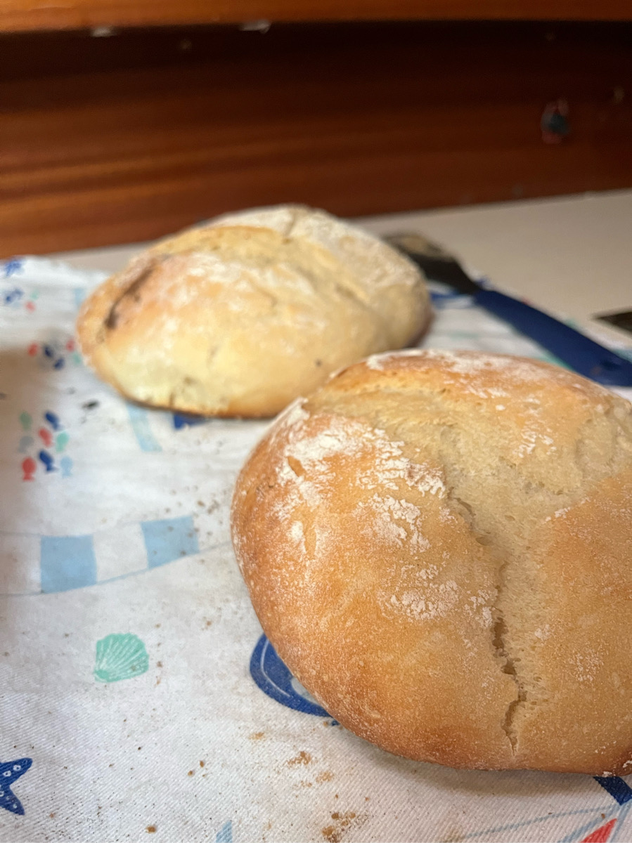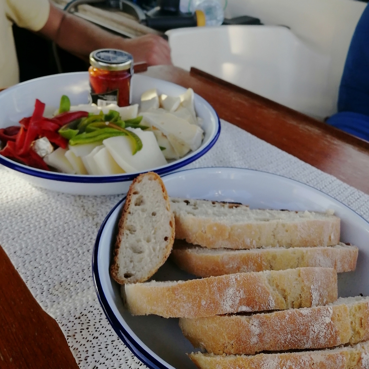 Wir haben Brot gebacken! Die Not, bedingt durch zwei geschimmelte Packungen Toastbrot, treibt uns dazu, diesen lange vor uns hergeschobenen Schritt endlich zu gehen. Wir sind also den Tag über damit beschäftigt Teig zu kneten und das Cockpit mit Mehl zu bestäuben um dann abends zwei frische, durchaus gelungene Leib Weißbrot aus dem Gasofen zu ziehen. Das Glück ist uns hold an diesem ersten Adventsonntag und die Welle beruhigt sich so sehr, dass wir zum ersten mal einen Tisch benutzen können und das Brot feierlich mit Ziegenkäse und Trüffelcreme verschmausen. Man gönnt sich ja sonst nix.
