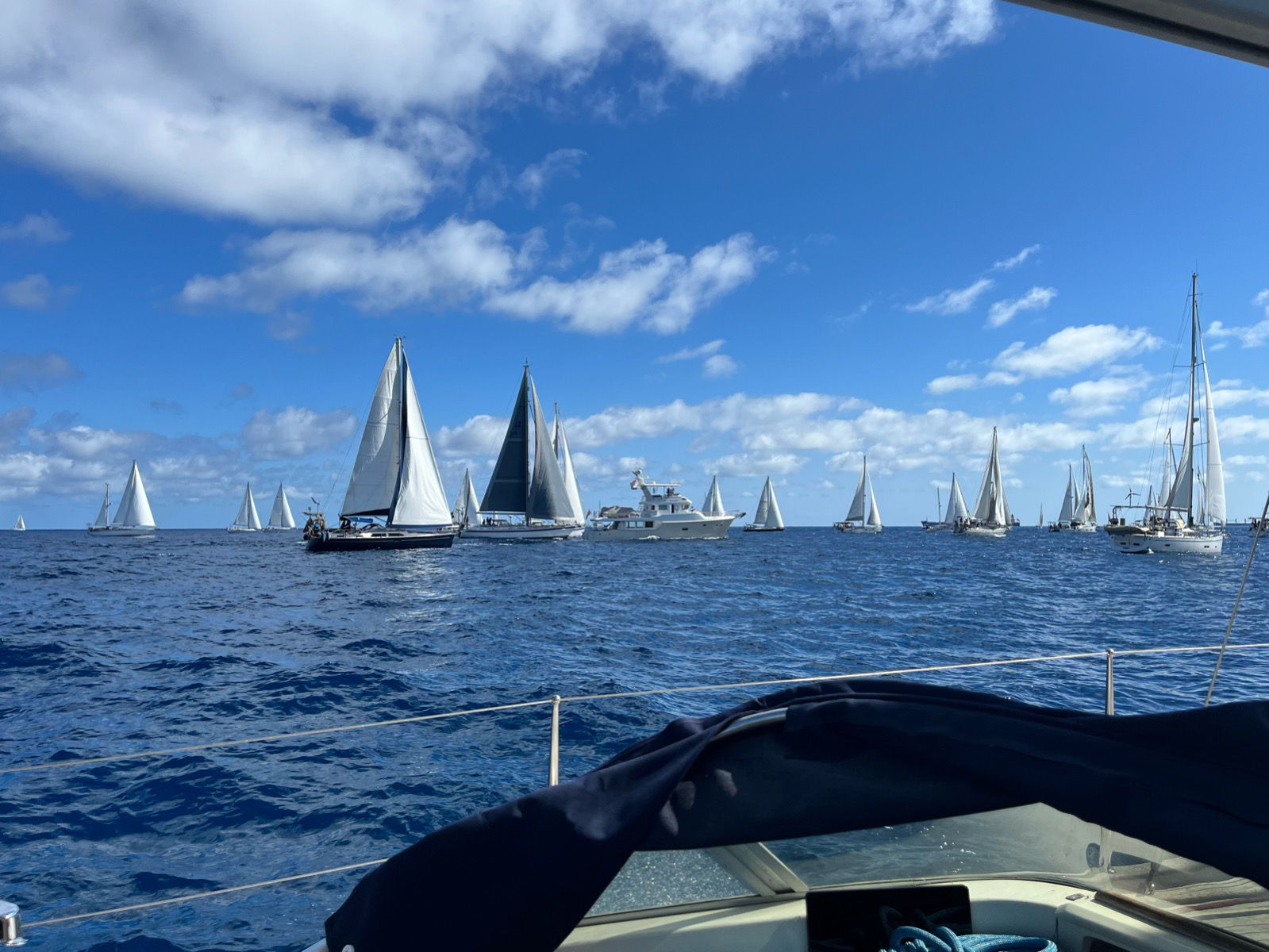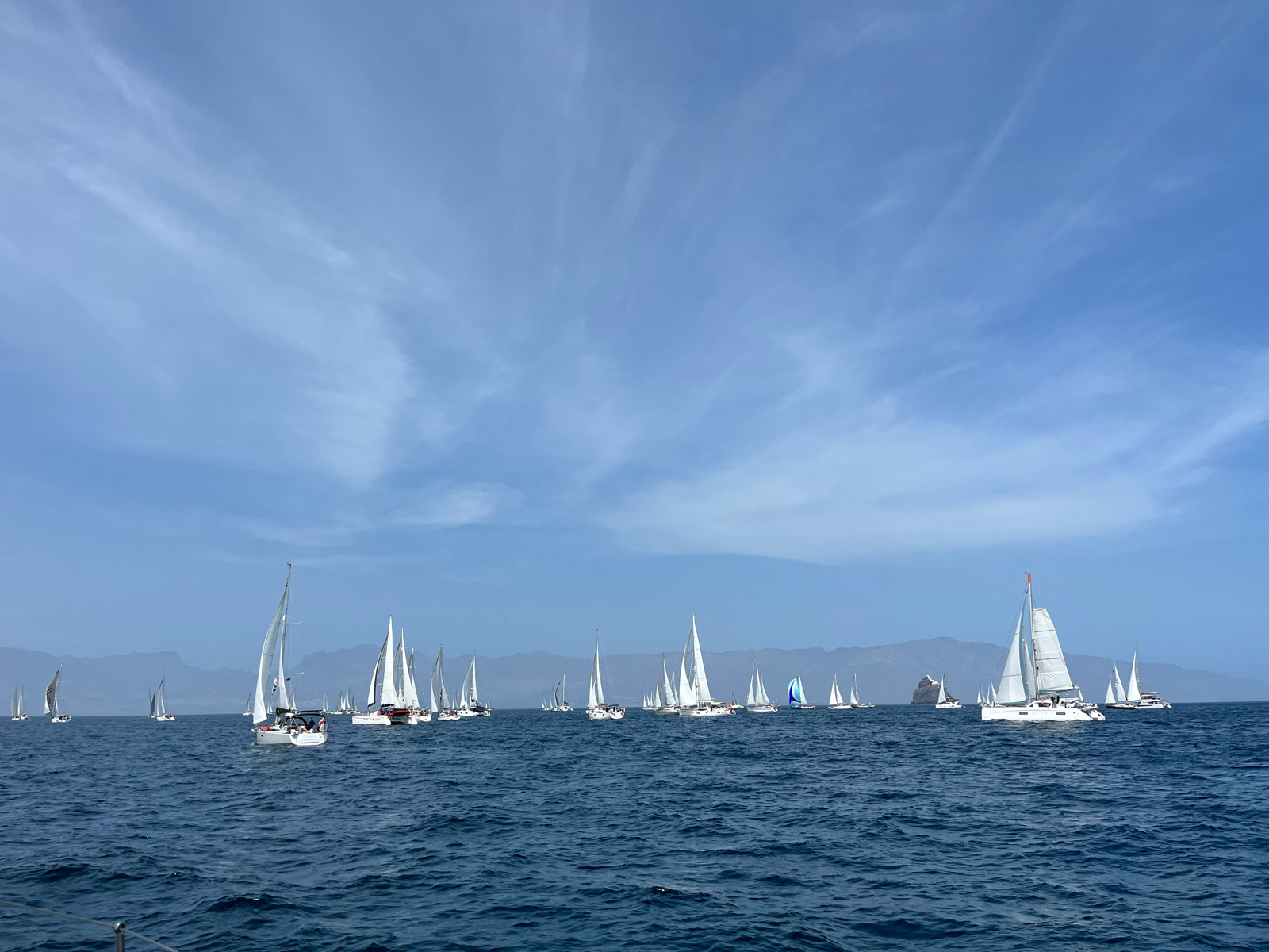 Wir dümpeln gemeinsam mit den anderne Booten der ARC+ bei böigen 4 bis 20 kn Wind im Startbereich vor der Marina Mindelo herum. Am Freitag um 13 Uhr UTC fällt der Startschuss für unsere lang ersehnte Atlantiküberquerung. Mit unserem Startmanöver können wir nur zufrieden sein. Dann ist, wie schon in Gran Canaria, der Wind weg und wir motoren eine knappe Stunde mit wunderbarem Ausblick auf die zahlreichen anderen Boote.