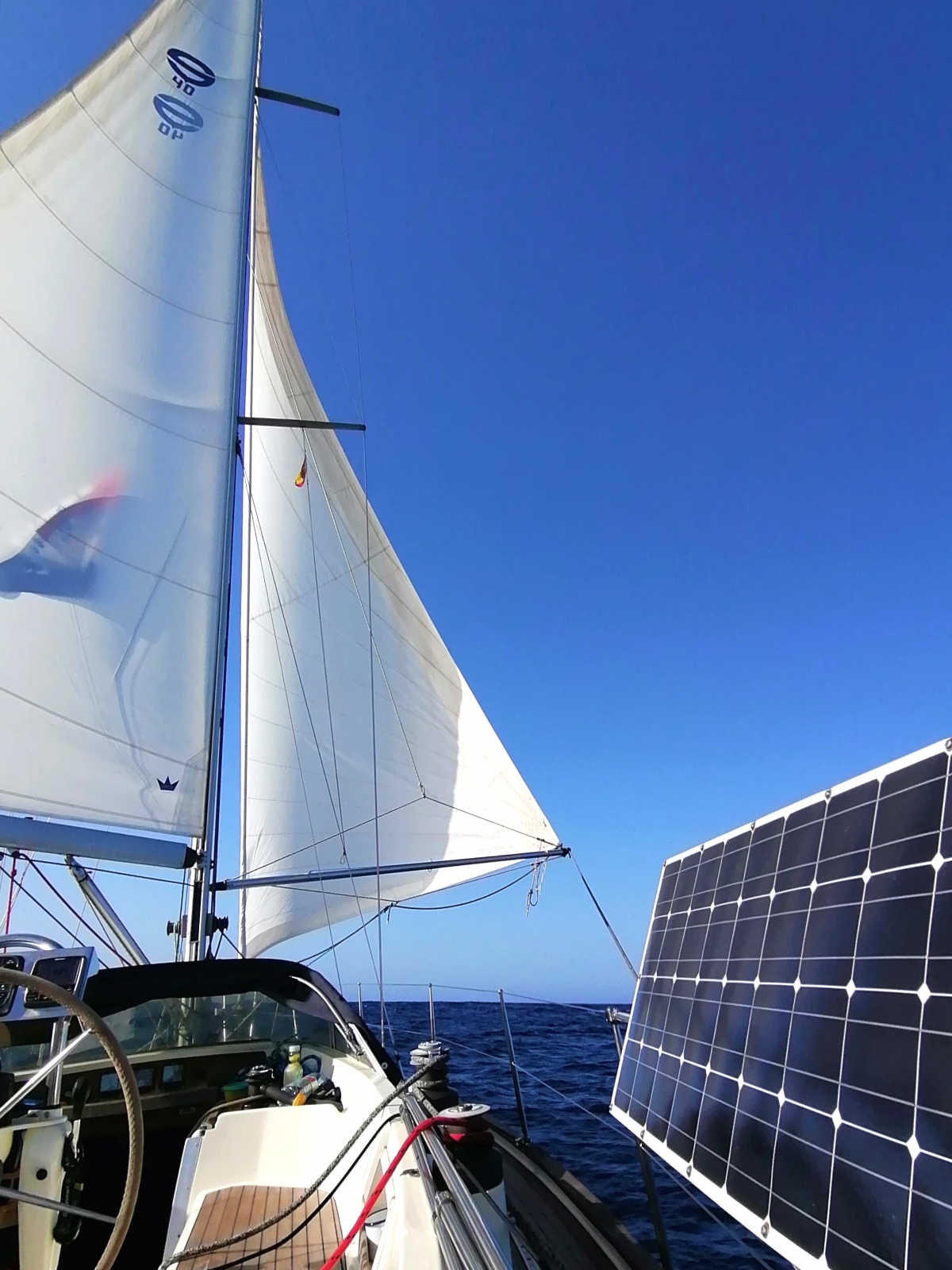 10:00 Erste Entspannungsphase. Nachdem die Überfahrt doch sehr rollend verläuft (Schiff bewegt sich um die Längsachse hin und her) ist jede Bewegung und sinnvolle Tätigkeit recht anstrengend. Wir gönnen uns dann meist ein Päuschen, bei dem wir uns im Cockpit vertäuen und Herr der Ringe-Hörbuch hören (mit Teil I sind wir durch). Zwischendurch bleibt auch immer etwas Zeit, sich um den Ladezustand der Batterien Sorgen zu machen. Bei der Fahrt Richtung Süden kriegen die Solarpanele nur am Vormittag richtig viel Sonne ab.