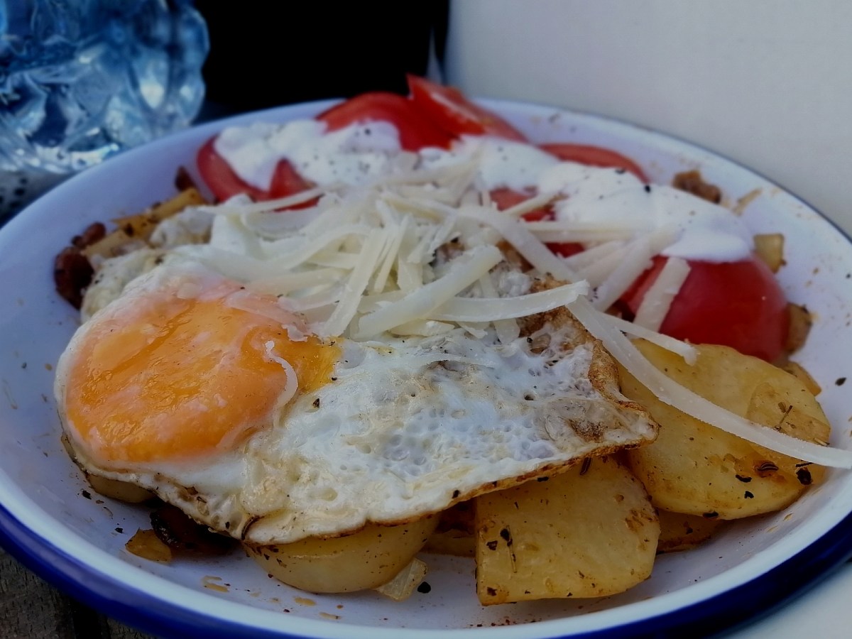Wenigstens von der Zubereitung eines exzellenten Frühstücks mit Spiegelei lässt sich Pia nicht abhalten. Der Anlass: Wir haben immerhin bereits über ein Viertel der Strecke hinter uns gebracht.