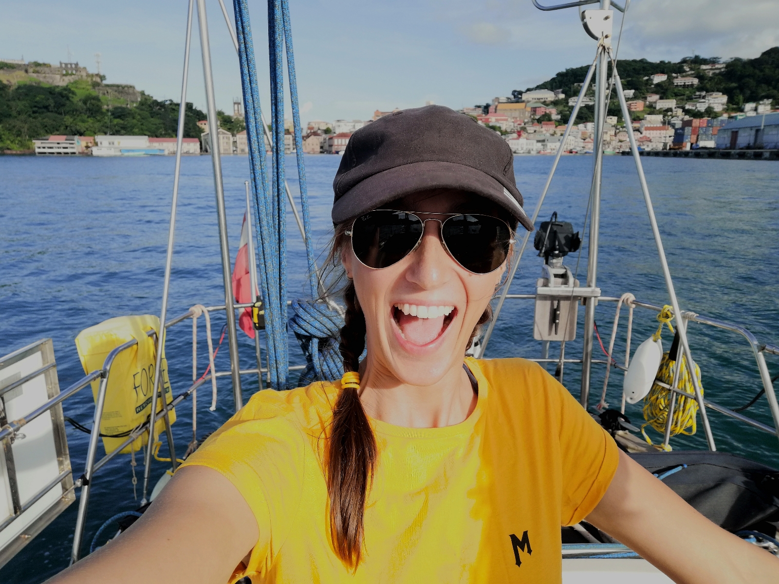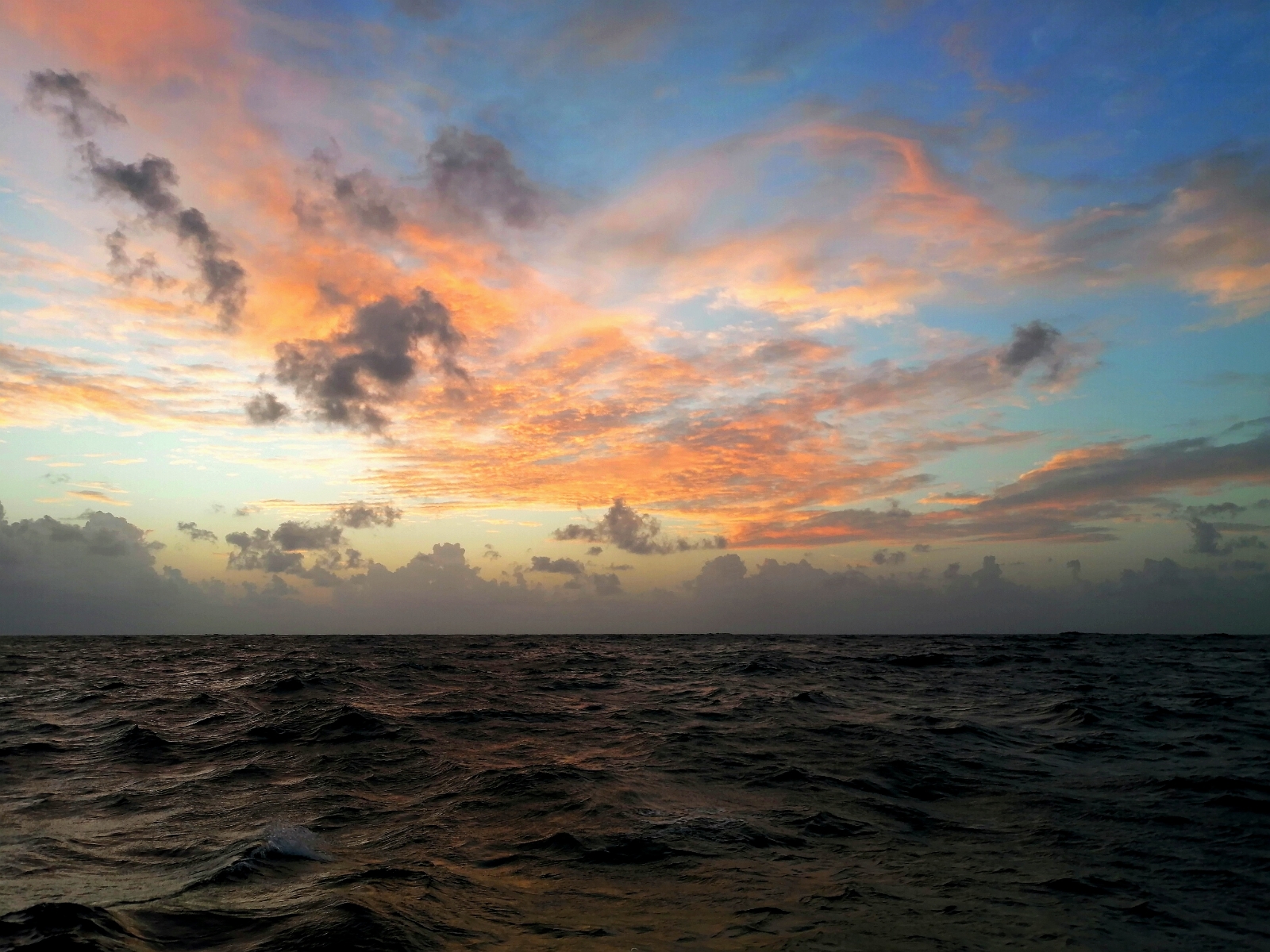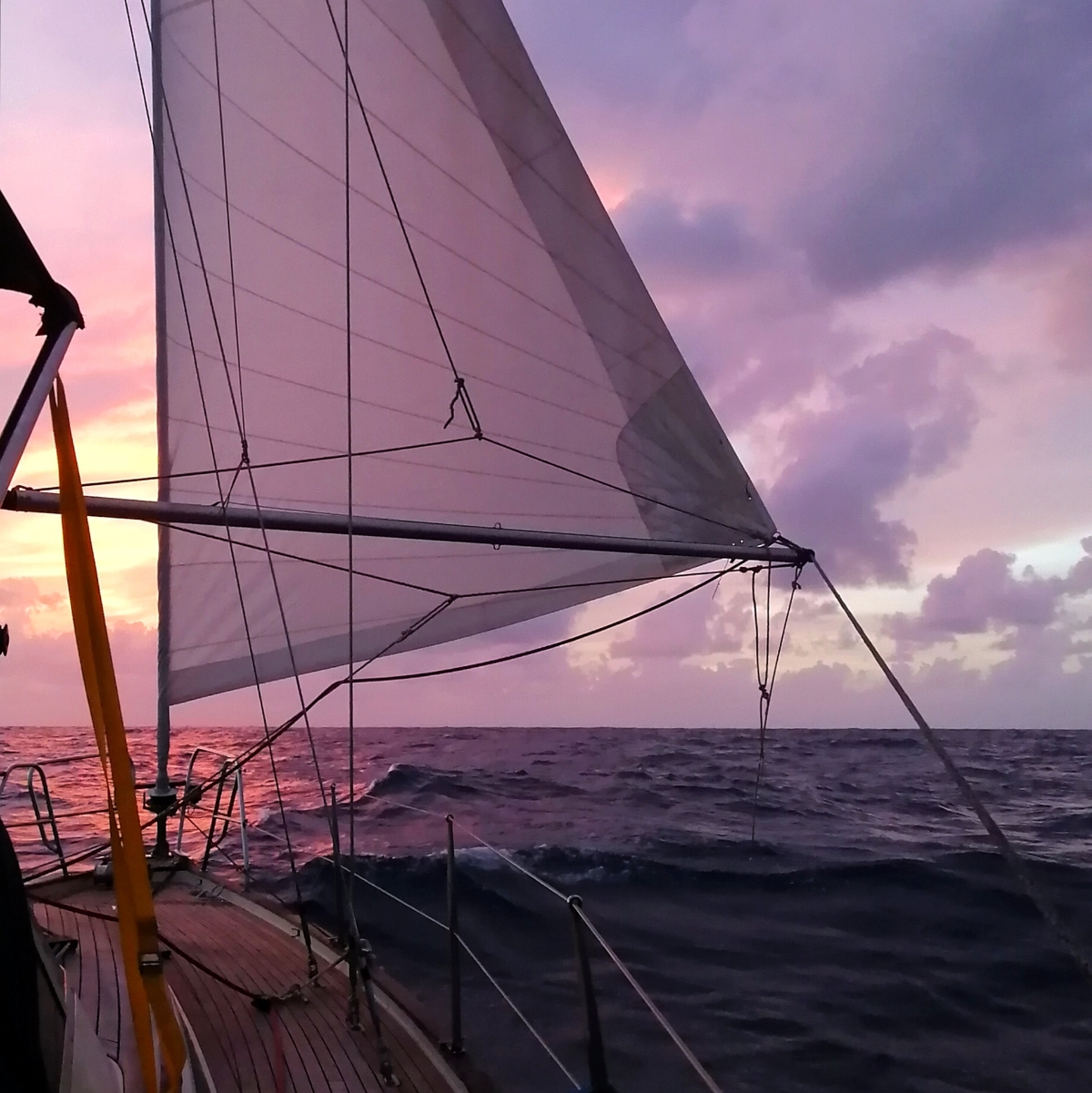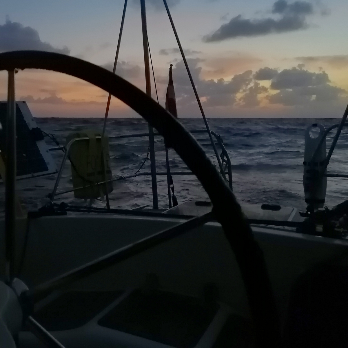 Im Leichtwindtrimm balancieren wir im Schneckentempo die letzten 100 sm auf der Zielgeraden. Wir verkochen noch das allerletzte Gemüse – Erdäpfel und Zwiebel. In der vorletzten Nacht erwischen wir den ersten richtigen Regen, wodurch jetzt für die Ankunft immerhin ein bisschen weniger Vogelkacke an Deck klebt. Die letzten 18 Stunden hat der Wind dann keine Lust mehr und wir motoren weite Strecken – immerhin bei glatter See und malerischem Sonnenuntergang. Wir freuen uns auf die Karibik! Nicht zuletzt weil wir unglaublicherweise schon seit zwei Monaten keine Gelegenheit mehr gehabt haben vom Boot aus ins Wasser zu hüpfen.