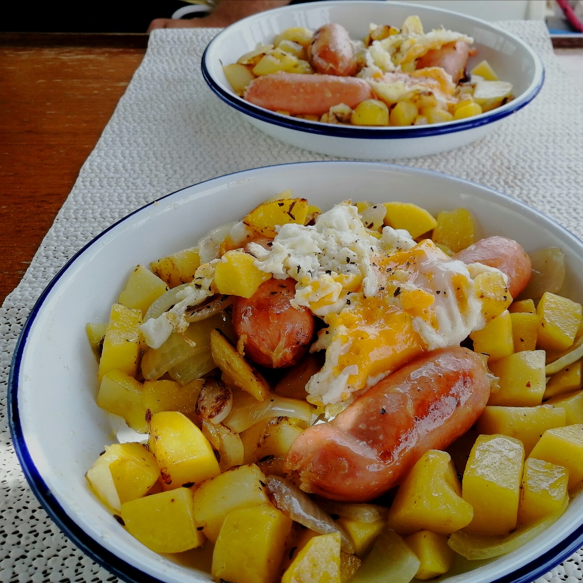 11:30 Irgendwann gegen Mittag kochen wir uns etwas zu Essen und verspeisen dann unsere größte Mahlzeit des Tages gemeinsam im Cockpit. Wir hatten unter anderem Hot Dogs, Chorizo-Mangold-Pasta, Erdäpfelgulasch, Kaiserschmarrn und Tiroler Gröstl. Für eine Woche ist doch noch einiges an Variation möglich. Die Atlantiküberquerung wird wohl mehr Risotto, Pastavariationen und Konserven mit sich bringen. Vorzugsweise kochen wir One-Pot-Gerichte, die sich dann auch ohne Tisch aus einer Schüssel löffeln lassen.