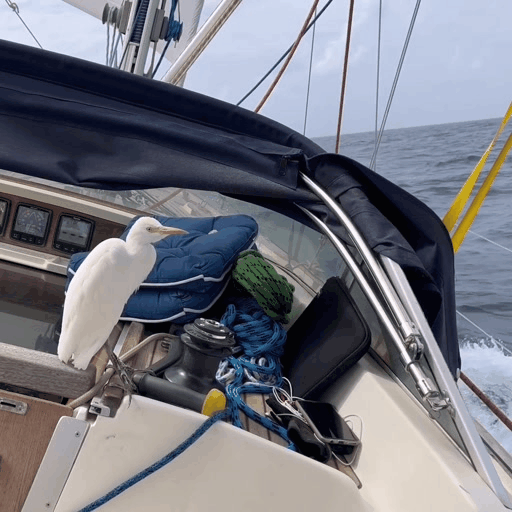 Wir haben einen Vogel! Bird is the word! Besser ein Kranich im Cockpit als eine Möwe auf dem Mast! Der frühe Vogel fängt den Fisch!