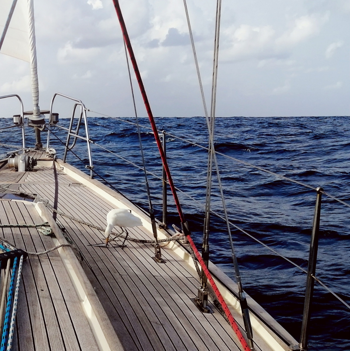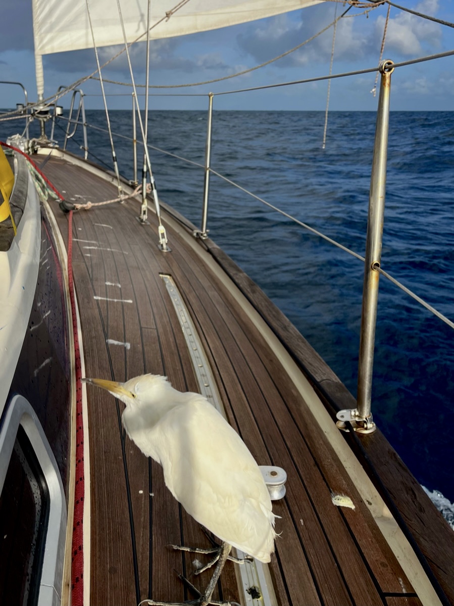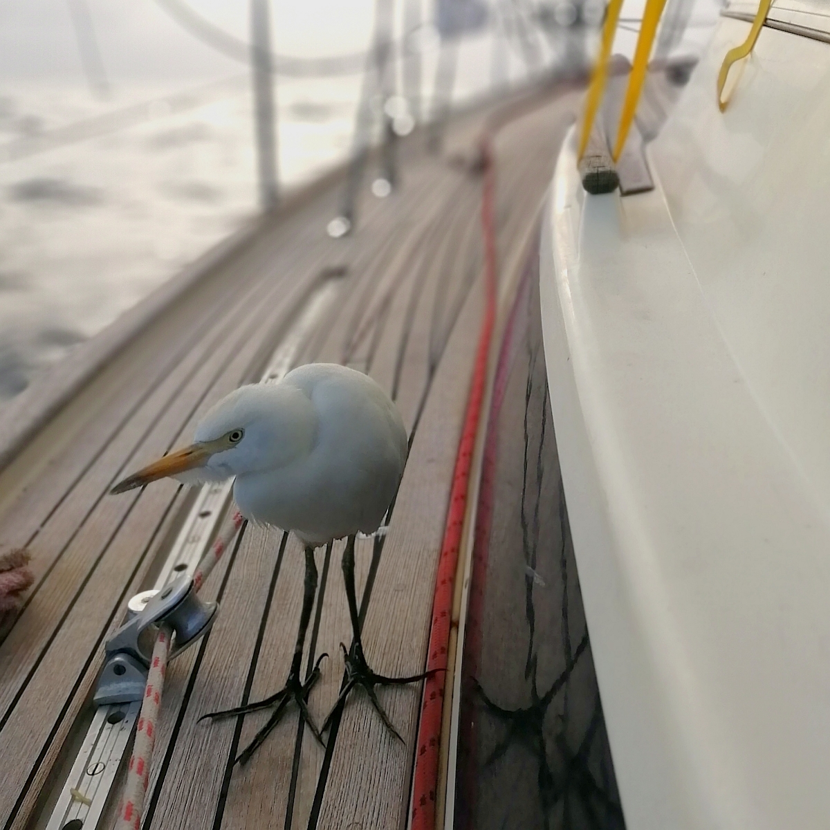 Alec „G. Rick“ der Zerhacker, ein Prachtexemplar eines weißen Vogels mit langem Schnabel, hat sich in der Nacht an Bord niedergelassen und unterhält uns seither. Nachdem er das Schiff und alle Luken genau erkundet hat, woraufhin wir rasch alle Luken geschlossen haben, sitzt er nun neben dem Cockpit, wippt hin und her, putzt sich und starrt uns ab und zu in heller Aufregung an. Umgekehrt genauso. Wir wollten dem Vogel Wasser geben, aber Interesse an unserer improvisierten Vogeltränke oder Brotkrümeln hat er bis jetzt nicht gezeigt. Damit hat er uns immerhin noch nicht das Deck vollgestuhlt. Im Vergleich zur Nacht schaut er mittlerweile aber wieder ganz ordentlich und weniger zerzaust aus. Ob wir wohl sein erstes Boot sind? Er wird jedenfalls für immer unser erster Bordvogel sein.