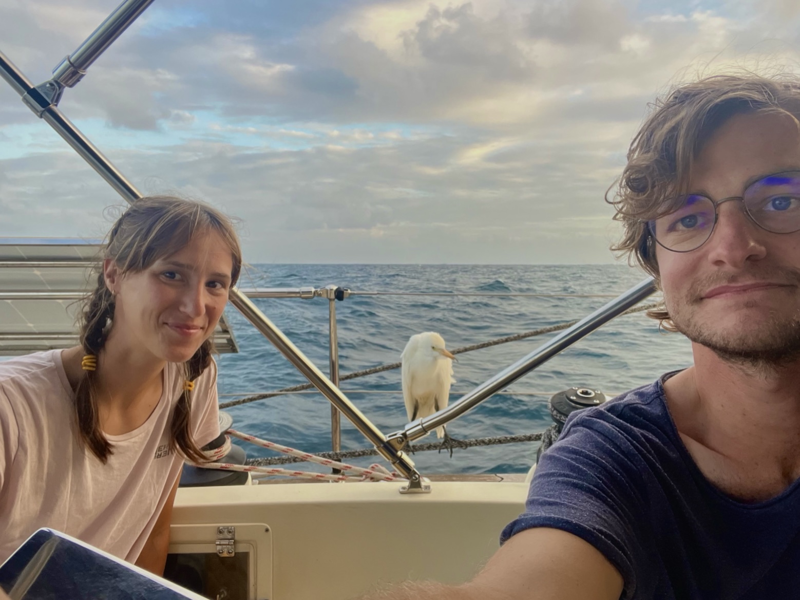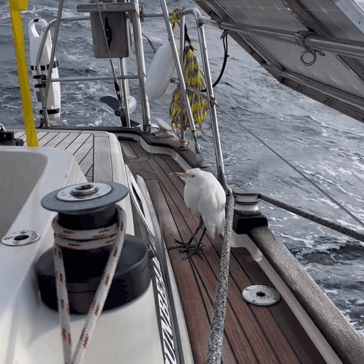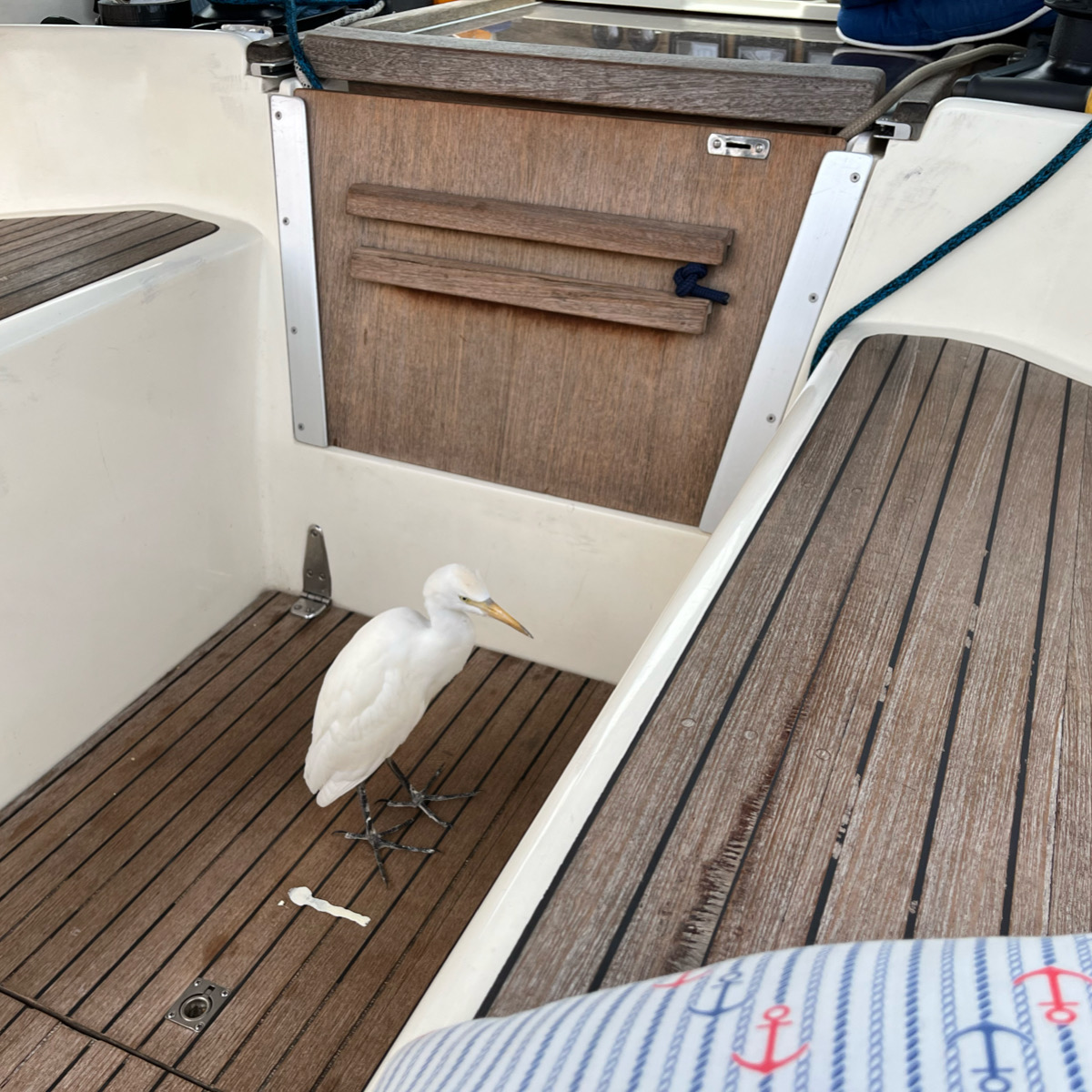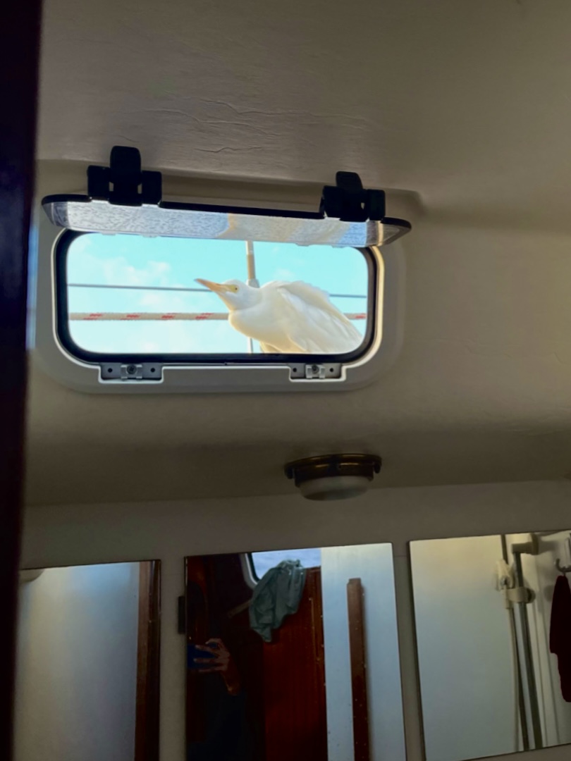 Alec „G. Rick“ der Zerhacker, ein Prachtexemplar eines weißen Vogels mit langem Schnabel, hat sich in der Nacht an Bord niedergelassen und unterhält uns seither. Nachdem er das Schiff und alle Luken genau erkundet hat, woraufhin wir rasch alle Luken geschlossen haben, sitzt er nun neben dem Cockpit, wippt hin und her, putzt sich und starrt uns ab und zu in heller Aufregung an. Umgekehrt genauso. Wir wollten dem Vogel Wasser geben, aber Interesse an unserer improvisierten Vogeltränke oder Brotkrümeln hat er bis jetzt nicht gezeigt. Damit hat er uns immerhin noch nicht das Deck vollgestuhlt. Im Vergleich zur Nacht schaut er mittlerweile aber wieder ganz ordentlich und weniger zerzaust aus. Ob wir wohl sein erstes Boot sind? Er wird jedenfalls für immer unser erster Bordvogel sein.