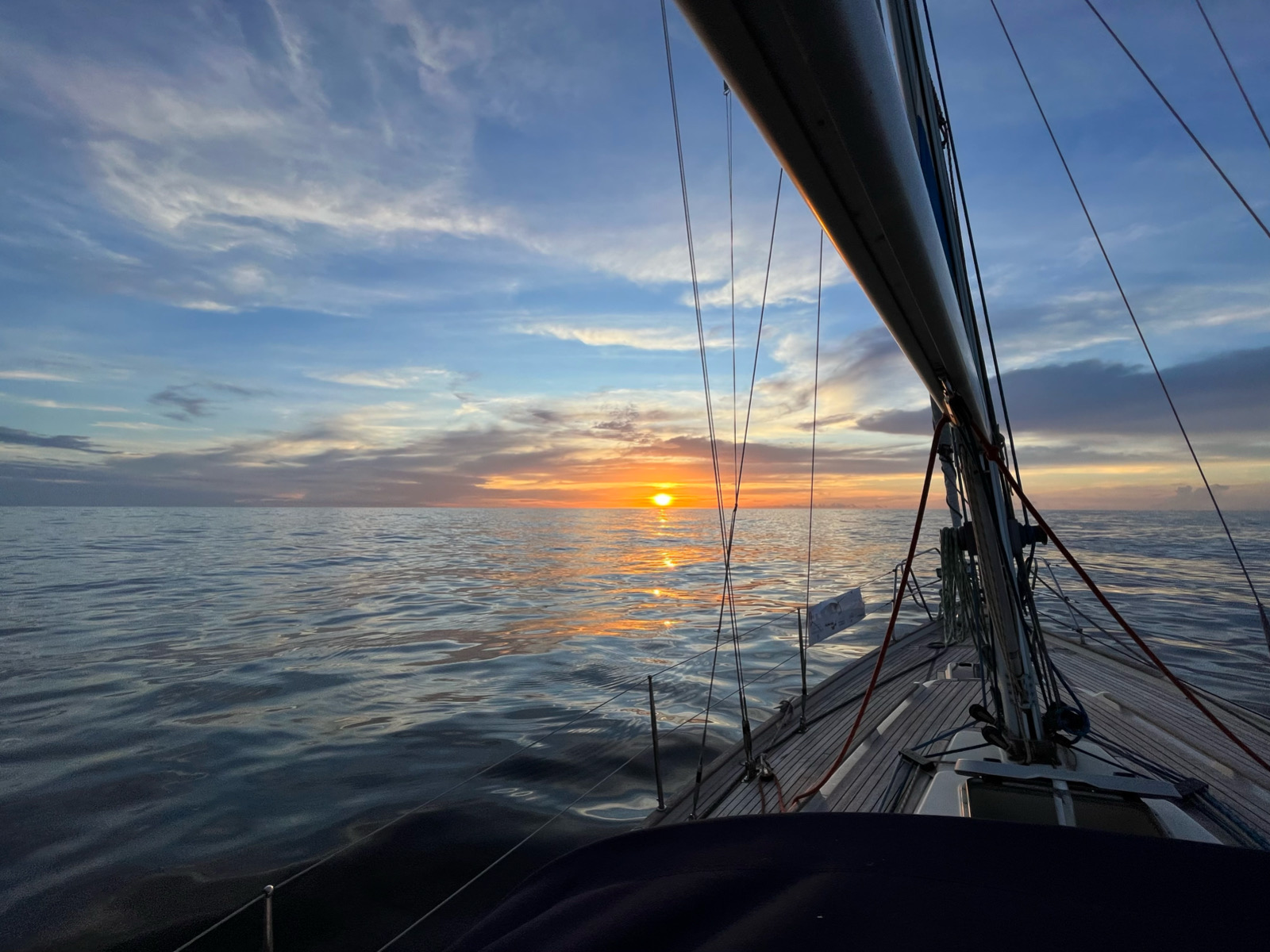 18:30 Sonnenuntergang. Wir beginnen unser Wachrad. Wir wechseln uns ab im Rhythmus 2,5 – 4 – 4 – 2,5 Stunden – immer abwechselnd einer an Deck und einer unter Deck. Hier gibt es viele Philosophien, aber diese war ein neuer Versuch und hat uns gefallen. Die erste Schicht ist gemütlich – noch nicht zu kalt und feucht – und wird gern zum einsamen Abendessen genutzt. Unter Deck wird meist eher gedöst statt wirklich geschlafen.