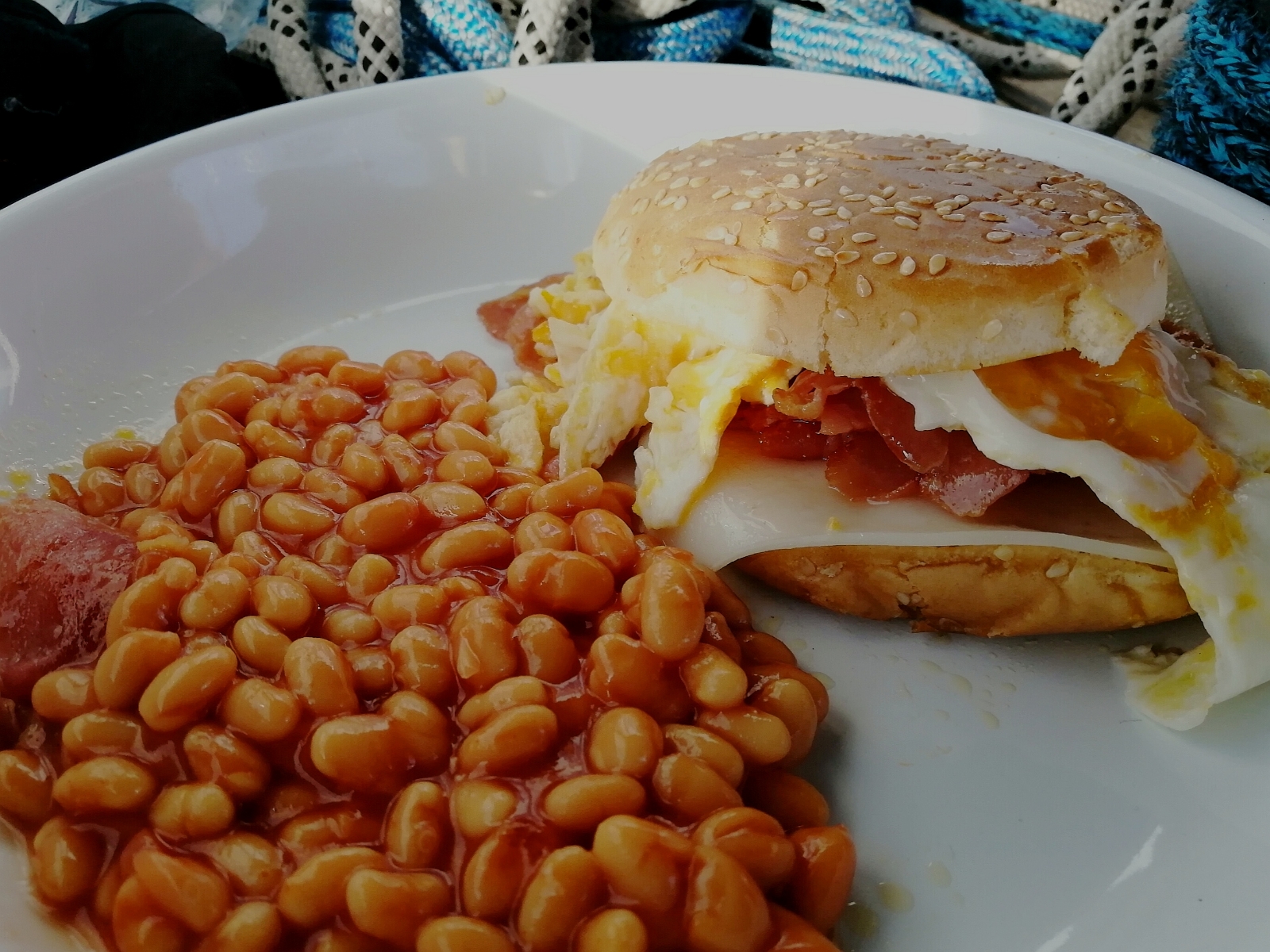 08:30 Frühstück. Wer von uns beiden gerade unter Deck geschlafen hat bringt Kaffee und Frühstück mit ins Cockpit. Meistens halten wir das Frühstück einfach – ein Dolci, Brot mit Marmelade, Kuchen. Zur Halbzeit kredenzt uns Bernhard ein full english breakfast. Die vielen britischen Teilnehmer der ARC haben uns auf den Geschmack gebracht. Panisch haben wir vor dem Ablegen noch zwei Dosen Heinz baked beans gekauft, nachdem andere Schiffe erzählen, ganze Kästen damit gefüllt haben. Allerdings wurden auf anderen Booten auch Unmengen von Zitronen gehortet (Angst vor Skorbut?). Unsere eine ist noch da. Dem Frühstück folgt oft eine kurze Aufräumrunde (Zeug für die Nachtfahrt weg, Sonnenbrillen her etc.) und gegebenenfalls Änderungen der Segelstellung. In der Nacht nehmen wir es eher in Kauf langsamer zu sein oder einen leicht falschen Kurs zu fahren.