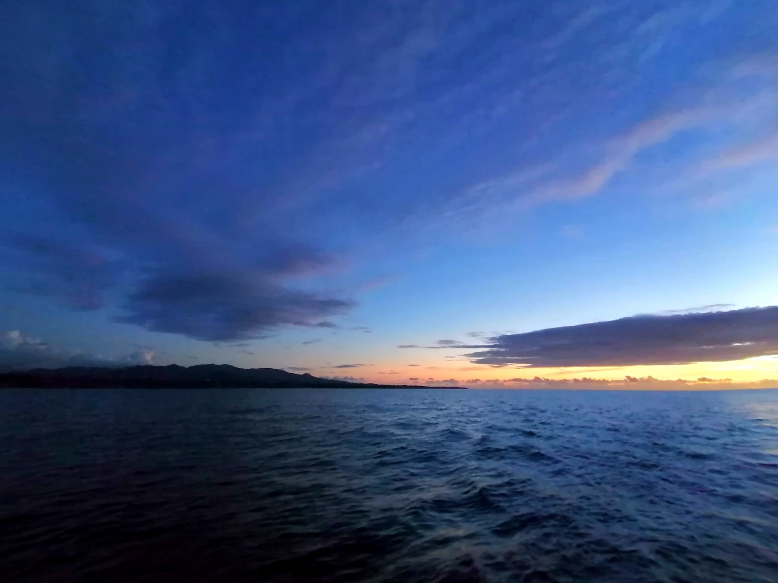 01:00 Rollentausch. Wer gerade die erste lange Schicht hinter sich hat verkrümelt sich unter Deck zum Schlafen. Optional haben wir einen Schlafplatz in der Achterkabine und einen im Salon hergerichtet. Je nach Wind und Welle ist mal der eine, mal der andere gemütlicher. Durchschlafen klapp nicht ganz, aber nach mehreren Tagen schläft man immer länger am Stück. An Deck herrscht hier die Schicht der Kamikaze-Fische. Häufiger kratzen wir in der Früh kleine (tote) fliegende Fische vom Deck, einmal einen kleinen Kalmar. Einmal springt aber ein gar nicht so kleiner fliegender Fisch direkt ins Cockpit, wo er mich – Fitzek-Hörbuch hörend – zu Tode erschreckt, als er auf meinen Füßen landet. Ich brüll los, Bernhard kommt nach oben geeilt und wirft ihn zurück ins Wasser. Wahrscheinlich hat ers überlebt. Im nächsten Moment fragen wir uns, ob wir ihn nicht hätten braten können, wenn er sich so bereitwillig in unsere Mitte begibt… Einmal sehen wir ganz kitschige Nachtdelfine im hellen Mondschein. Insgesamt konnten wir abgesehen von bereits genannten Tieren noch eine große Meeresschildkröte, einen riesigen Mondfisch und den Blas und die Finnen von zwei oder drei Walen in der Ferne beobachten, vermutlich Buckelwale.