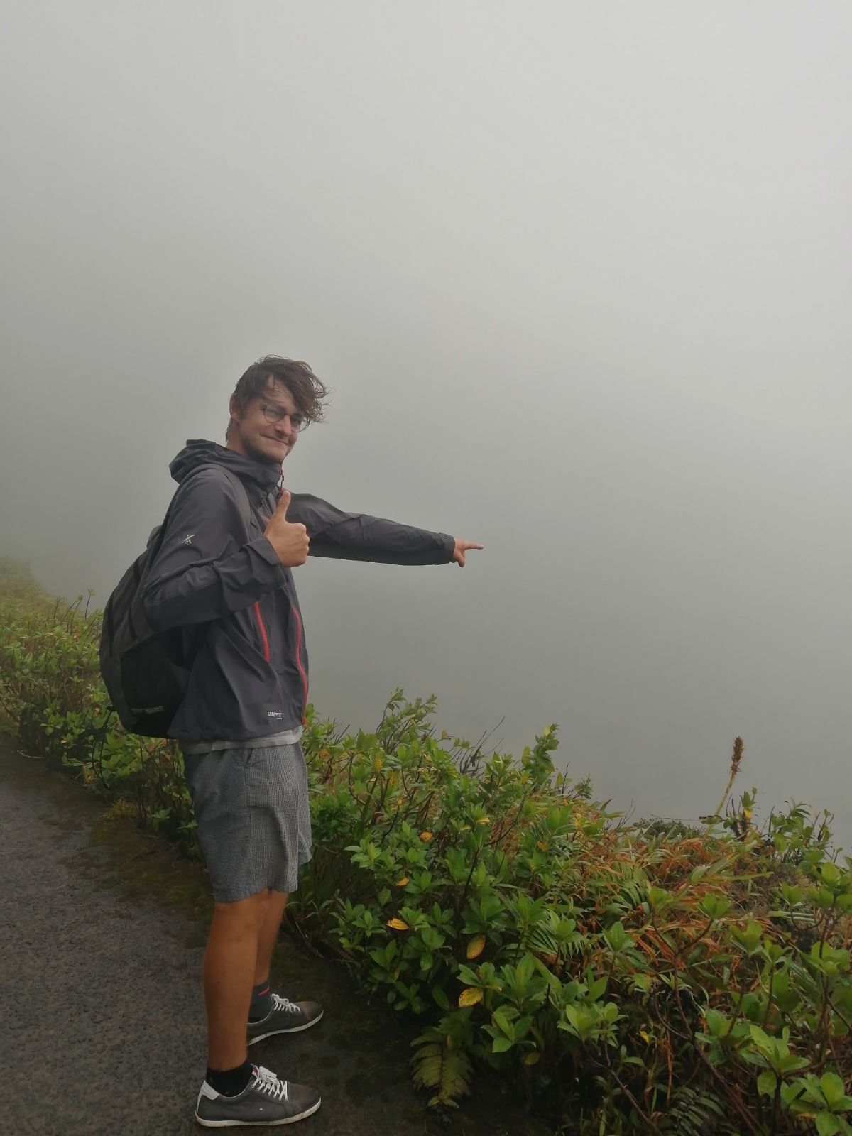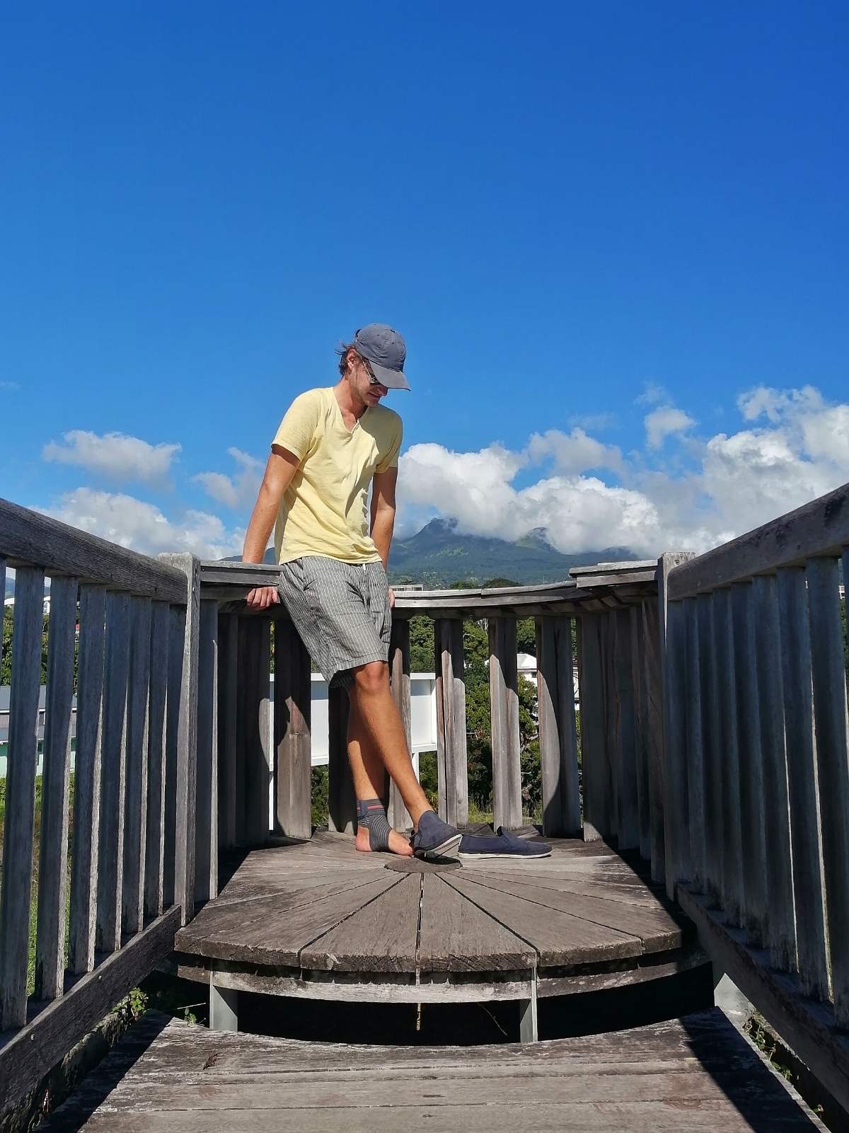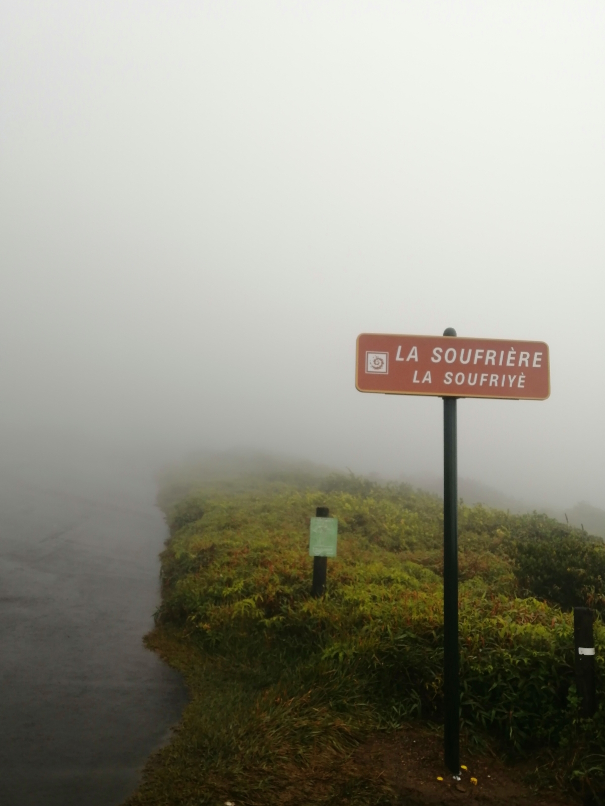 Am nächsten Tag schlängeln wir uns dann aber motorisiert die Serpentinen nach oben, um den Vulkan La Soufrière (liebevoll auch Soufflé) zu bestaunen. Der Weg zum eigentlichen Vulkankrater ist leider wegen Sturmschäden gesperrt. Dann gibts noch den imposanten Lac Flammarion, einen dampfenden See. Der Weg zum See ist komplett nebelverhangen. Zu Sehen gibts für uns nix, dafür mit Sturm, Nebel und Kälte ein kleines bisschen Heimatgefühle. Am Fuße des Soufflé wurde allerdings für Besucher eine heiße Quelle hergerichtet – genau das richtige nach so einem Schitag. Also plantschen wir ein wenig in dem nach verdorbenen Eiern stinkenden und mit gehirnfressenden Amöben verseuchten Wasser und wärmen uns auf.