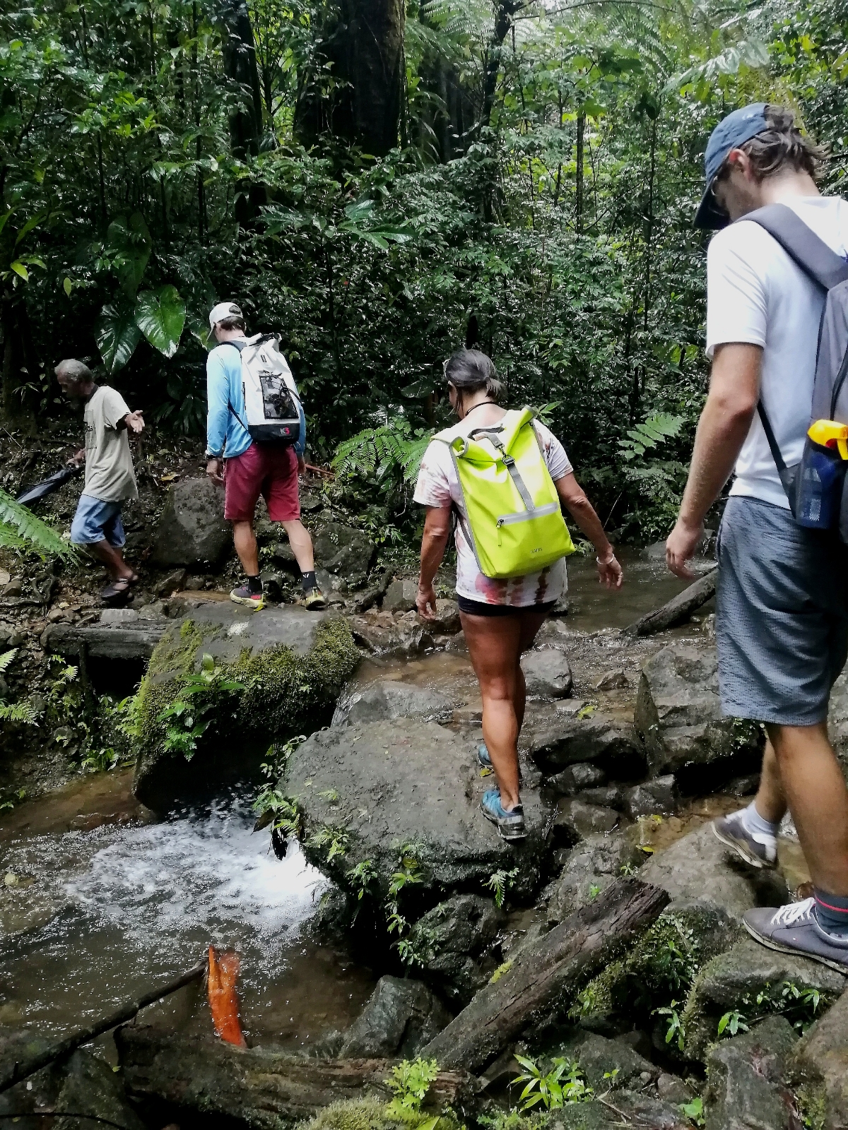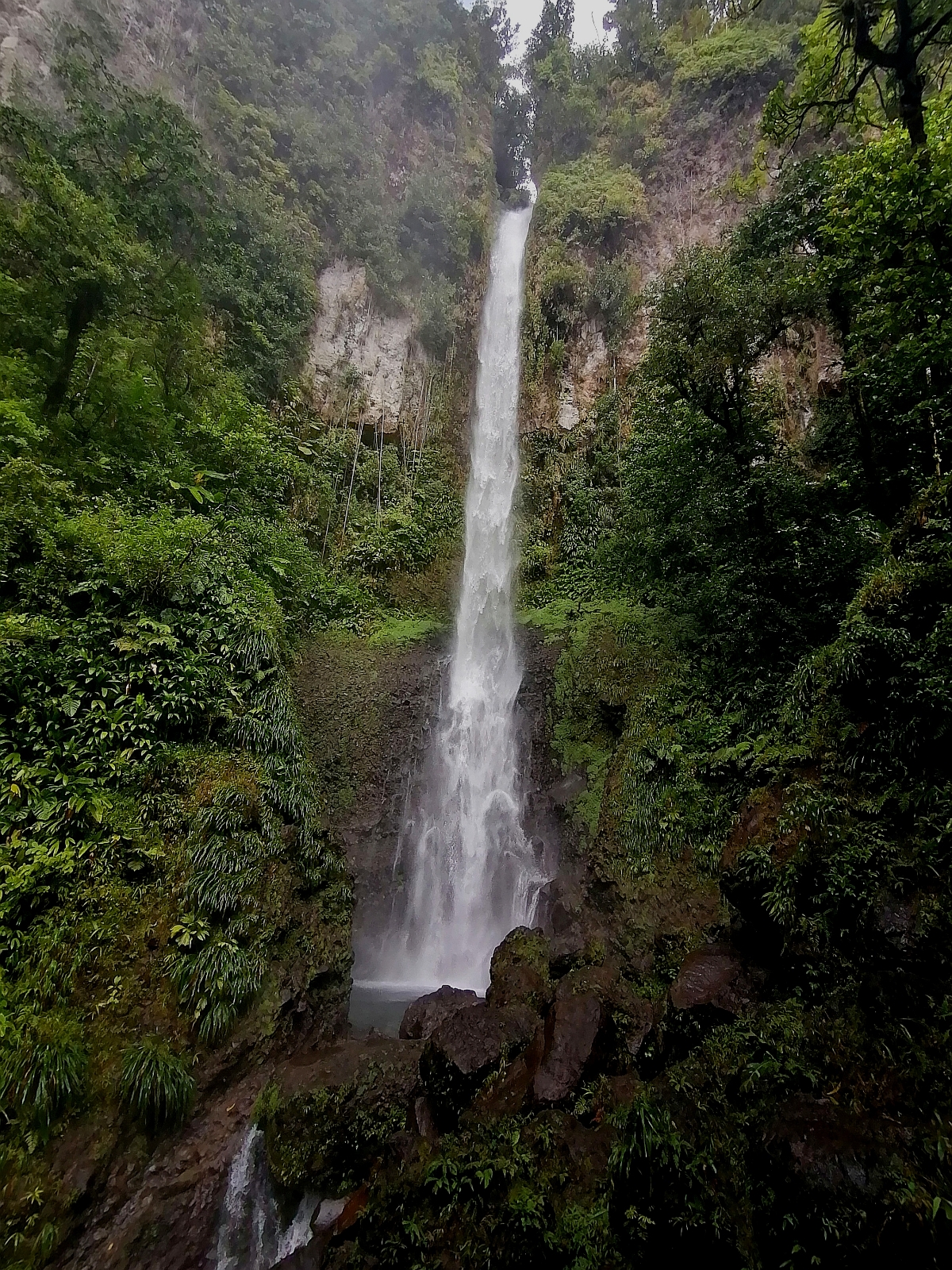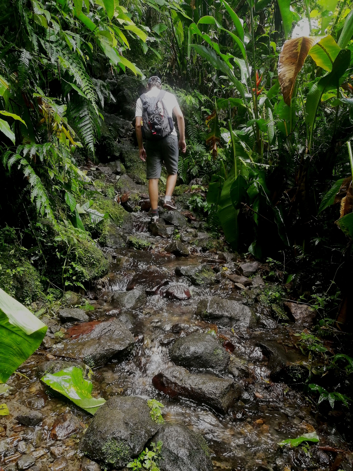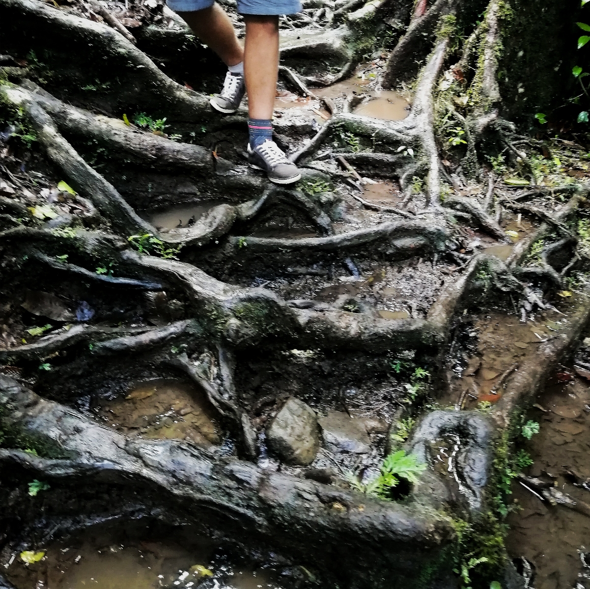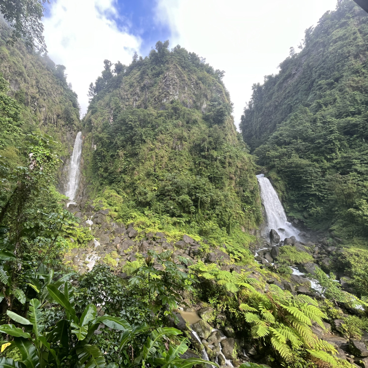 Erstmals seit wir in der Karibik unterwegs sind, sehen wir mehr von einem Land als die unmittelbare Küstenregion. Und zwar in einer sechsstündigen Tour gemeinsam mit Guide Dr. Jones und Jim & Marianne vom knallorangenen kalifornischen Katamaran Alani. Dr. Jones bringt uns in seinem Kleinbus zunächst zu den Middleham Falls. Der Besuch des Wasserfalls erfordert eine einstündige, matschige und ausgesprochen anspruchsvolle Wanderung über Stock und Stein und den ein oder anderen Fluss durch den Regenwald. Der Weg ist das eigentliche Highlight – Wasserfälle kennen wir schon, Regenwald ist für uns neu. Pia hat Tage später noch Muskelkater.