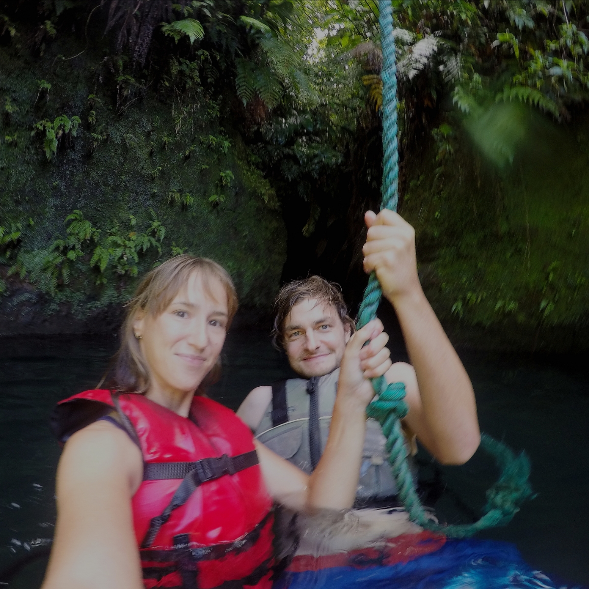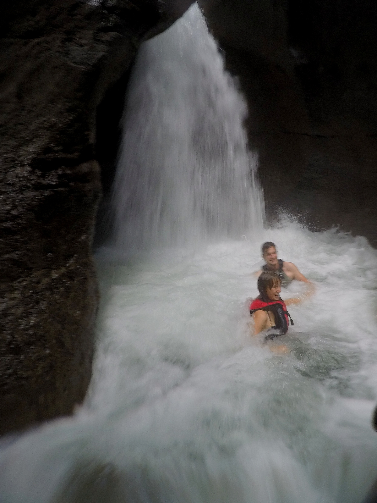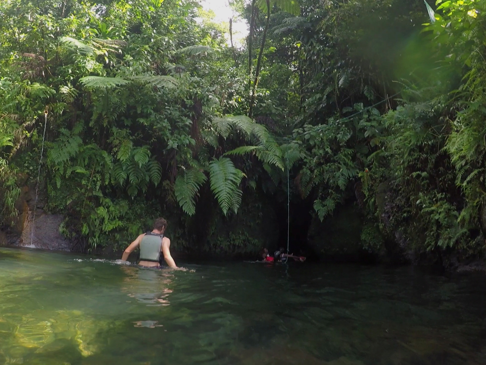Zweites Ziel unseres Ausflugs ist Titou Gorge, ein kleiner Wasserfall am Ende einer Regenwaldschlucht, der nur schwimmend erreicht werden kann. Zur Abwechslung steigen wir also in frisches Süßwasser und erschwimmen den kurzen Fluss entlang der beeindruckenden Felswände. Einer von 365 Flüssen der Insel – einer für jeden Tag des Jahres. Nachdem vor uns eine wasserscheue Gruppe mit ihrem panischen Guide endlich das Feld räumt, plantschen wir unter dem Wasserfall und lassen uns anschließend mit der Strömung wieder hinaustreiben. Die Schlucht ist ein Drehort von Fluch der Karibik 2 – da wo sie in den Käfigen runterfallen und dann im Wasser landen. Orlando Bloom ist hier geschwommen!