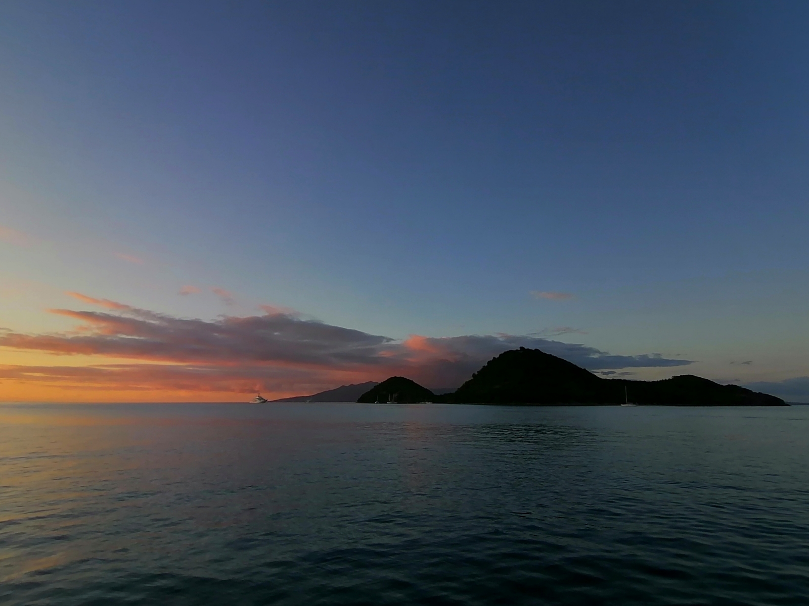 Noch beeinträchtigt vom Rumpunsch des Vortags lassen wir Dominika in unserem Kielwasser und motoren bei vollkommener Flaute gen Norden. Spiegelglattes Wasser und eine 0,0 auf der Windanzeige – ein Anblick der sich erstmals seit dem Mittelmeer darbietet. Unser Tagesziel sind die Îlets de Saintes, eine kleine Inselgruppe, die dem französischen Guadeloupe vorgelagert ist. Wir ankern vor dem Hafen und können bei Dosennudeln einen wunderbaren Sonnenuntergang genießen. Zum Glück haben wir immer einen ganzen Haufen Notfallfutter mit dabei – vorrangig für schwierige Überfahrten, nützlich aber auch bei Kater und fehlendem Lieferando.