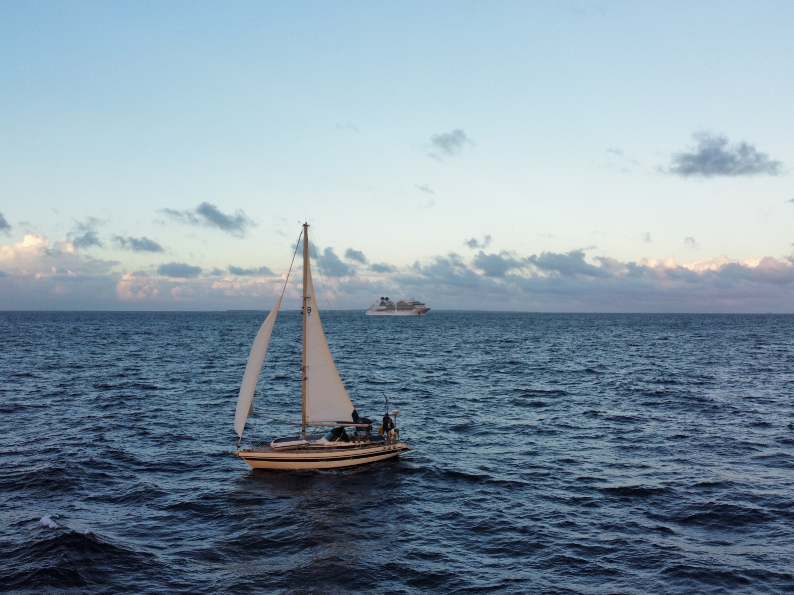 Am Abend des nächsten Tags setzen wir über zu den British Virgin Islands – ein Sehnsuchtsort. Seglerparadies, Strände, Schnorcheln! Die Überfahrt bietet alles: Nachdem wir bei gemütlichen Bedingungen starten, nimmt der Wind gegen Abend zu, hört fast auf, nimmt dann stark zu inklusive dramatischem, nächtlichem Reffmanöver, nur um dann gänzlich aufzuhören und uns zu 30 sm unter Motor zu zwingen. Während der Fahrt wird musiziert, gegessen, ein Kreuzfahrtschiff befreundet und Jimi ans Seefahrtleben gewöhnt.