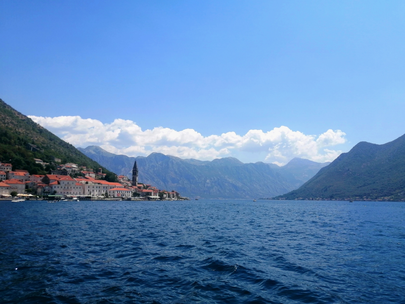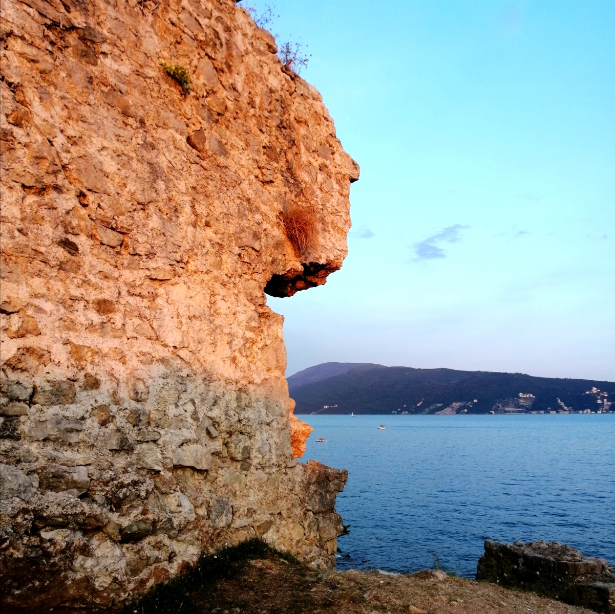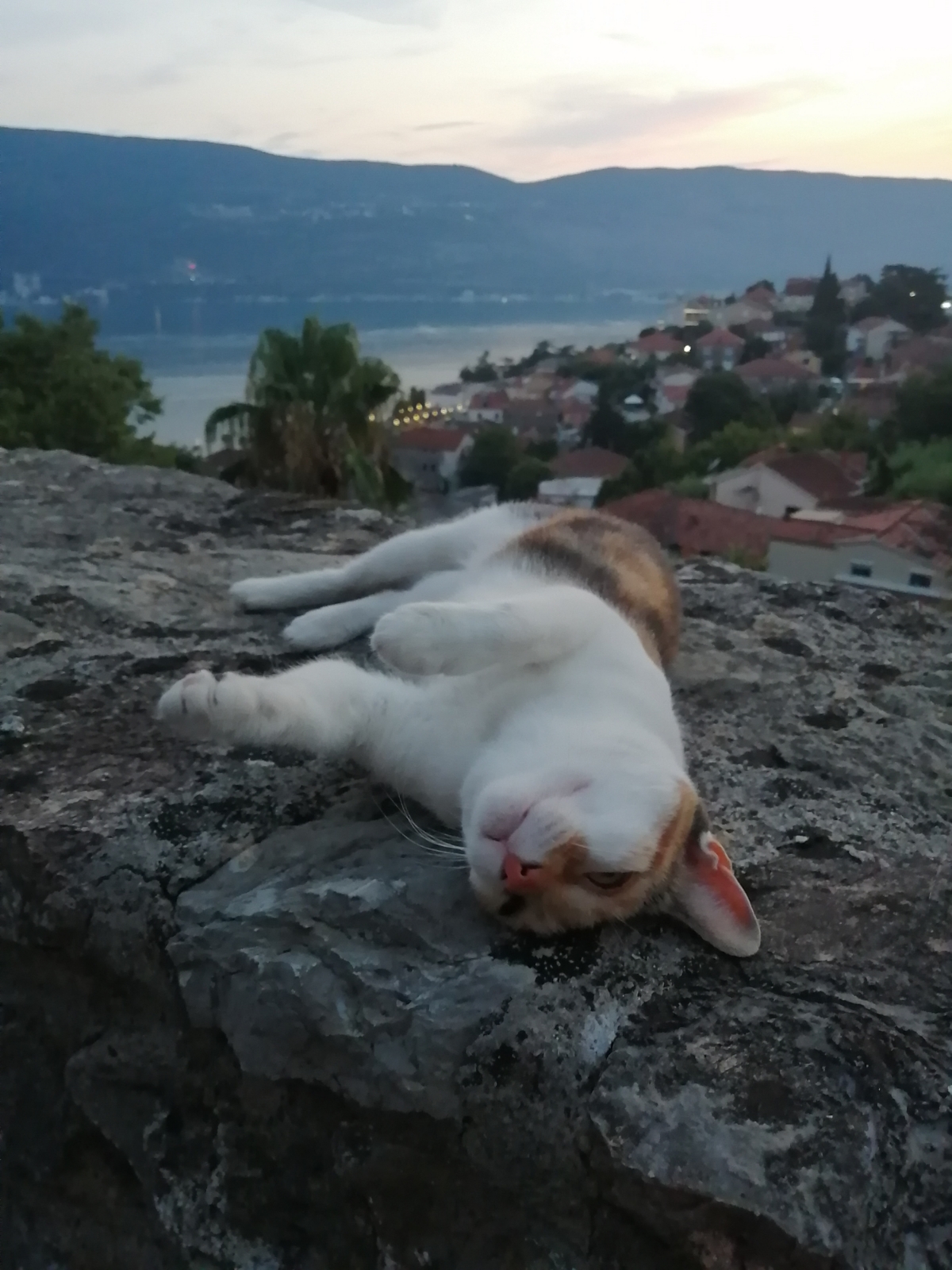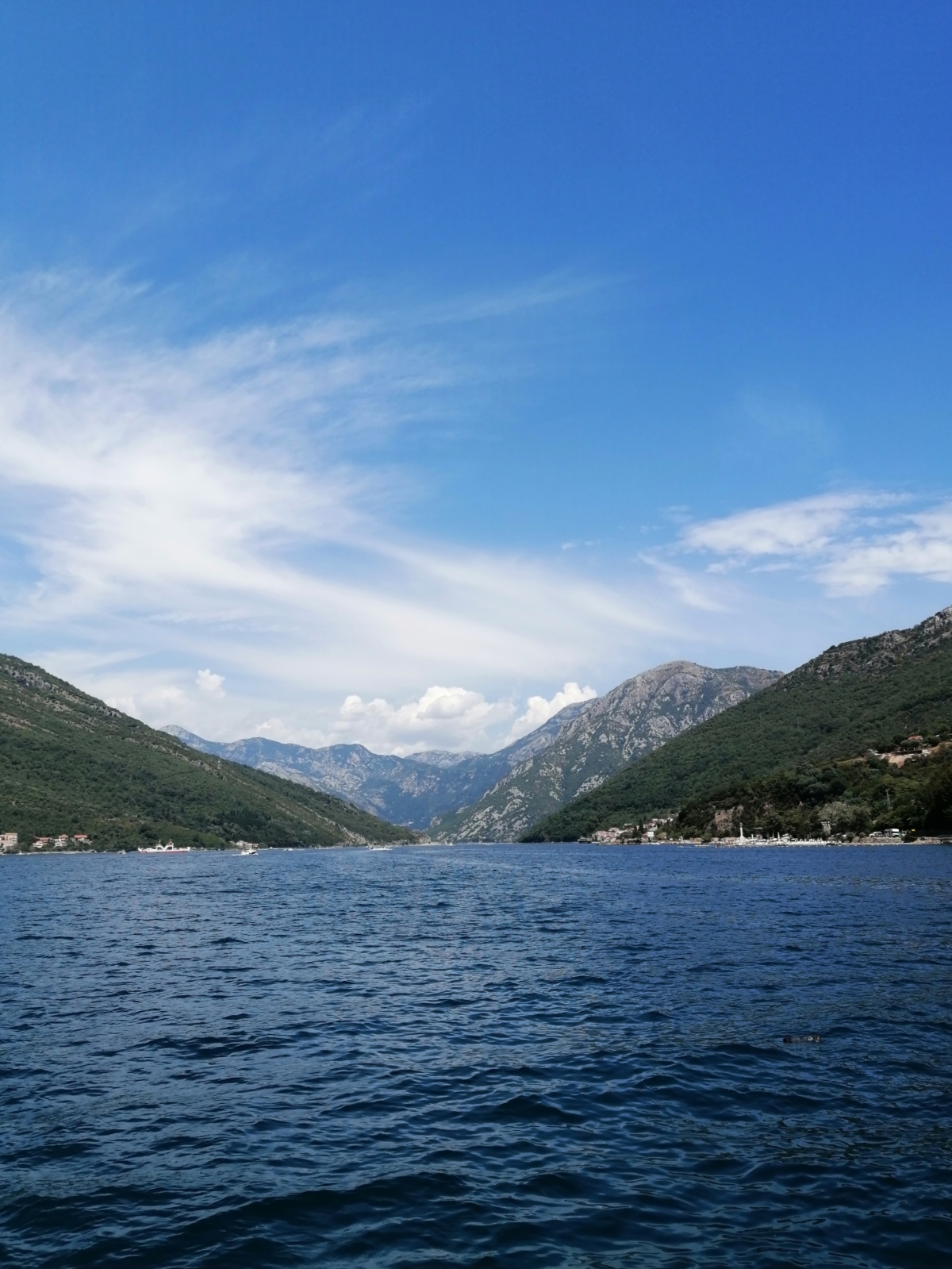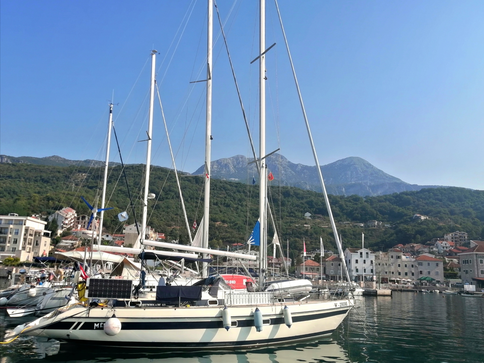 Ein kleines bisschen Wind, gerade zu wenig zum Segeln und genau von vorn macht die Fahrt trotz Motoren bei der Hitze ganz gut erträglich. Ein paar Meilen vor dem Ziel können wir dann noch ein bisschen Leichtwindsegeln. Mit der entsprechenden, spannungsaufbauenden Geschwindigkeit runden wir das letzte kroatische Kap und segeln in die Bucht von Kotor – wo wir fast erschlagen werden. Ganz plötzlich fällt der Wind von 6 auf 0 kn und die Temperatur steigt um gefühlte 20°C. Eine mühsame letzte halbe Stunde also durch die Bucht bis Zelenika zum Einklarieren. Ein furchtbare Mole, die im Internet etwa so beschrieben wird: Bei schlechtem Wetter sollte man dort nicht anlegen, sonst bleiben nur Teile vom Boot übrig. Zum Glück Flaute. Das Einklarieren funktioniert ebenso reibungslos wie das Ausklarieren zuvor und dann ist es nur noch ein Katzensprung zu unserem ersten Ziel Herceg Novi.