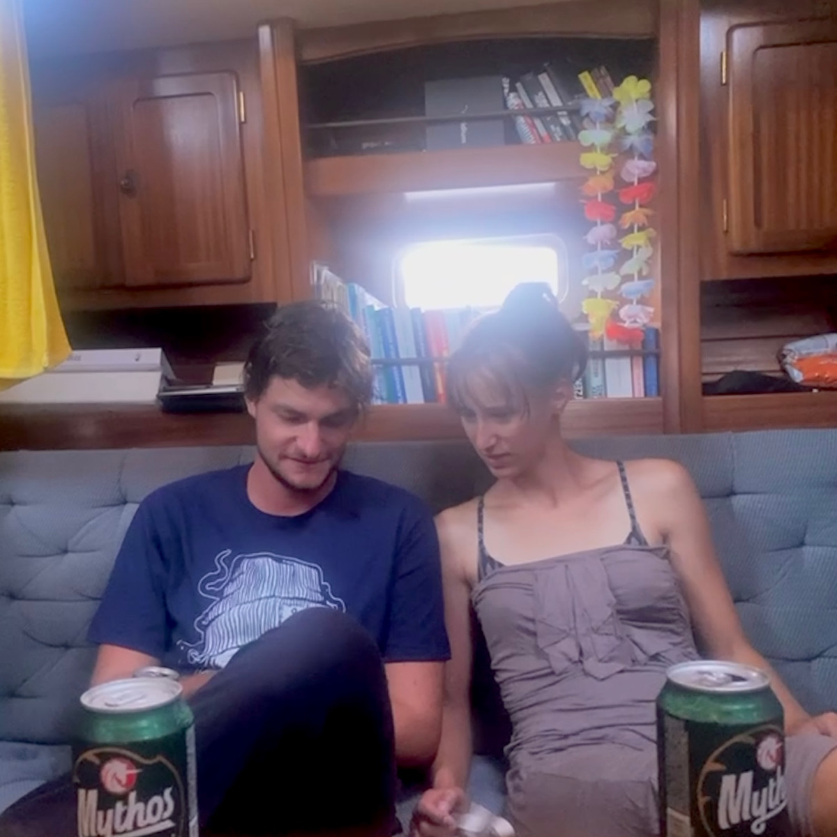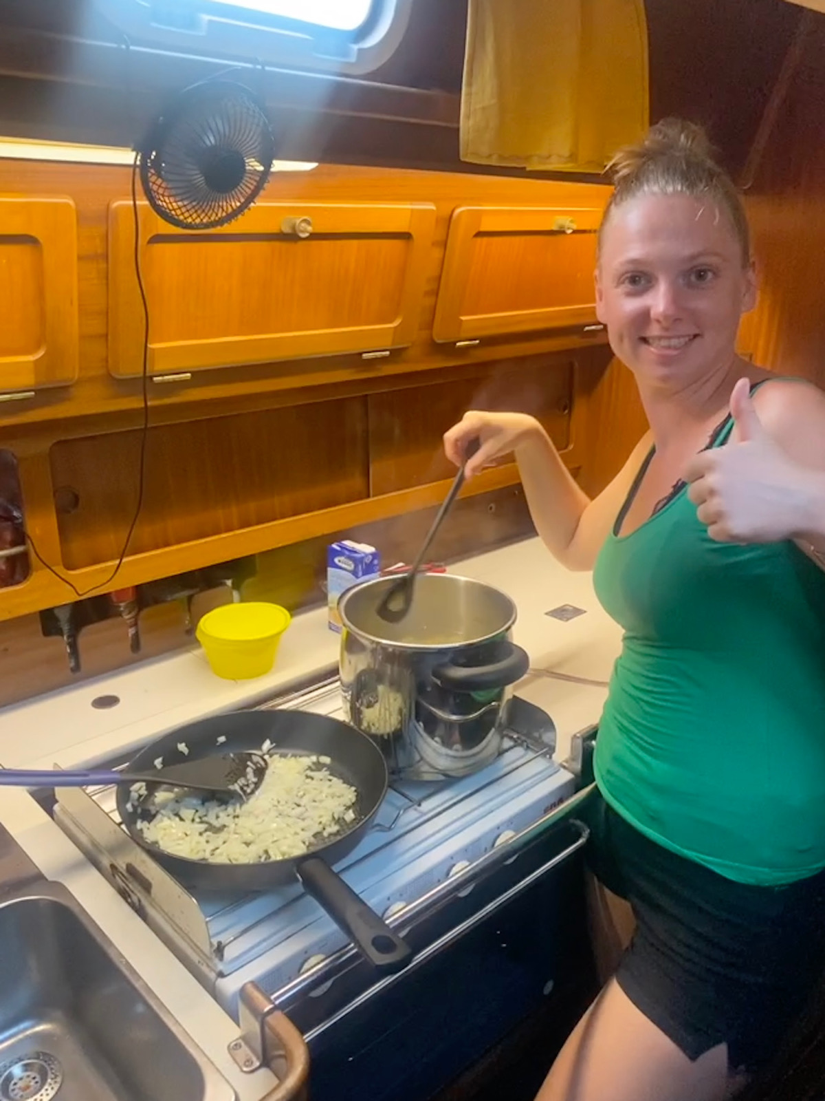 In der Bucht Vliho fällt uns plötzlich ein neues Crewmitglied auf: Eine riesige Gottesanbeterin hat es sich unter Deck gemütlich gemacht, als Pia gerade dabei ist einen Geburtstagskuchen für Bernhard zu backen.