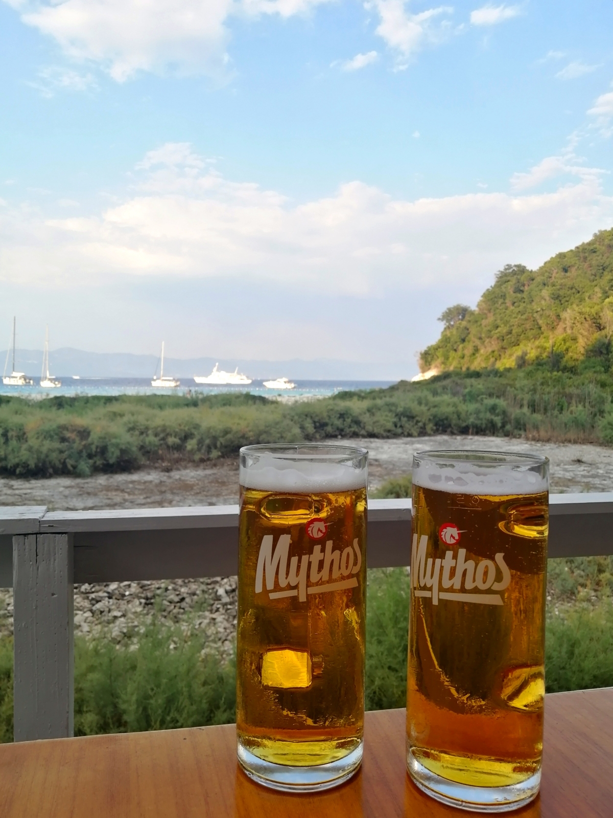 Im Süden von Korfu und im Norden von Antipaxos haben wir dann zwei sehr griechische Segelabende. Irgendwo an der Küste werfen wir den Anker in 5 m Tiefe und im Sand hält er auf den ersten Versuch bombenfest. Kein Vergleich zu den regelmäßigen Zitterpartien in Kroatien. Ein Sprung ins kühle Nass lässt uns wissen, dass Hochsommer ist – frische 29,2°C. Für uns als Nebensaisonurlauber ist das schon was besonderes, mal längere Zeit im Meer herumgammeln zu können. Am zweiten Abend wird es mit Mythos-Bier in der Strandbar und anschließendem Halloumi-Grillen mit Tsatsiki noch griechischer. Jäh endet unsere Idylle um 5:30 Uhr, als Seegang und Ostwind einsetzen und der Ankeralarm uns weckt. Aufgrund des ohnehin nahenden Sonnenaufgangs, des auf einmal sehr ungemütlichen Schlafs und der unweiten Felsen packen wir uns zusammen und düsen eben ein paar Stunden früher als geplant Richtung Preveza.