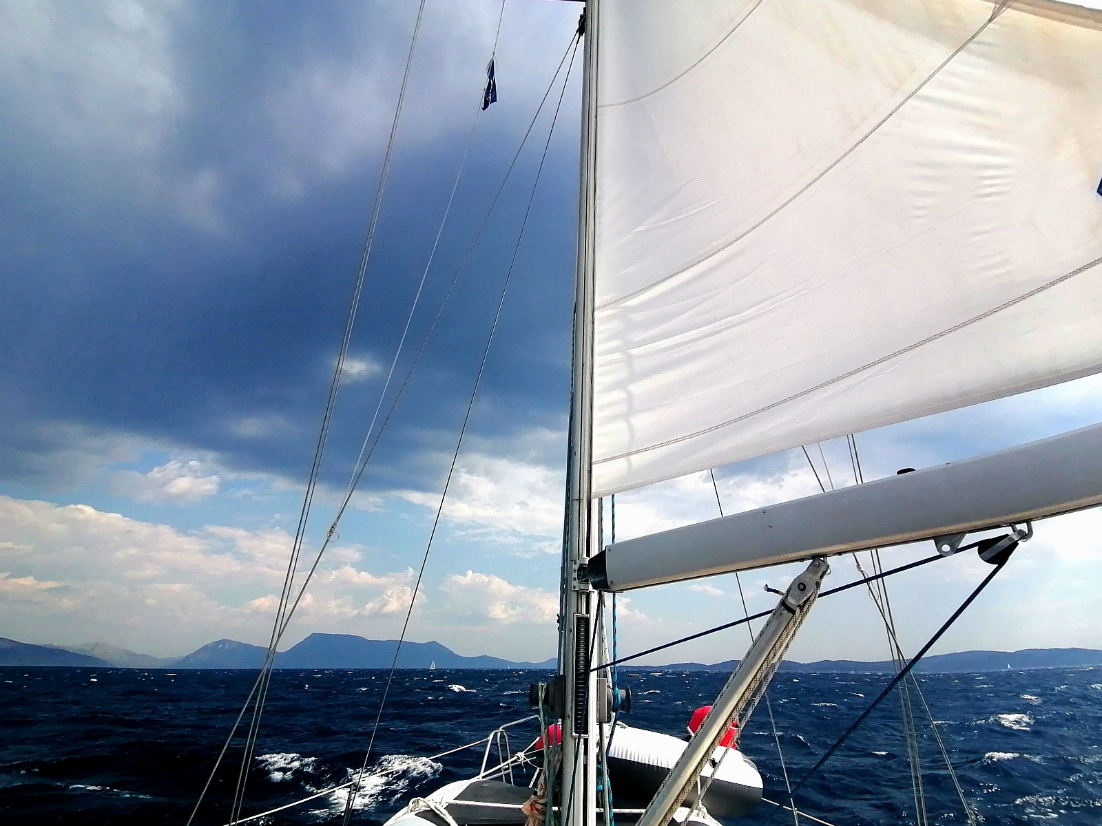 Am Sonntag fühlen wir uns dann wieder wie echte Crewmitglieder, als wir am Vormittag in Crewuniform endlich in See stechen. Zuerst passieren wir einen Kanal vorbei an der Stadt Lefkada, um von dort unsere Bucht für die Nacht auf der kleinen Insel Meganisi anzusteuern. Auf dem Weg streifen wir eine sehr spektakulär aussehende Gewitterzelle und haben genügend Wind, um für kurze Zeit die Segel zu setzen.