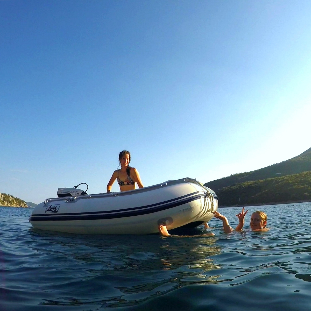 Besonders ereignisreich ist der Aufenthalt in der Bucht Sivota. Benni, Bernhard und Pia wagen einen Klippensprung aus ca. 8m Höhe – mir wird schon beim Zuschauen schlecht. Nicht nur deswegen wird uns diese Bucht in Erinnerung bleiben. Bernhard erleidet einen Wespenstich an einer sehr ungünstigen Stelle und auch das nigelnagelneue Dinghy wird nach einem erneuten Zwischenfall mit dem Fäkaltank umgetauft. Ab sofort besuchen wir das Land mit Hilfe von Stinki 2.