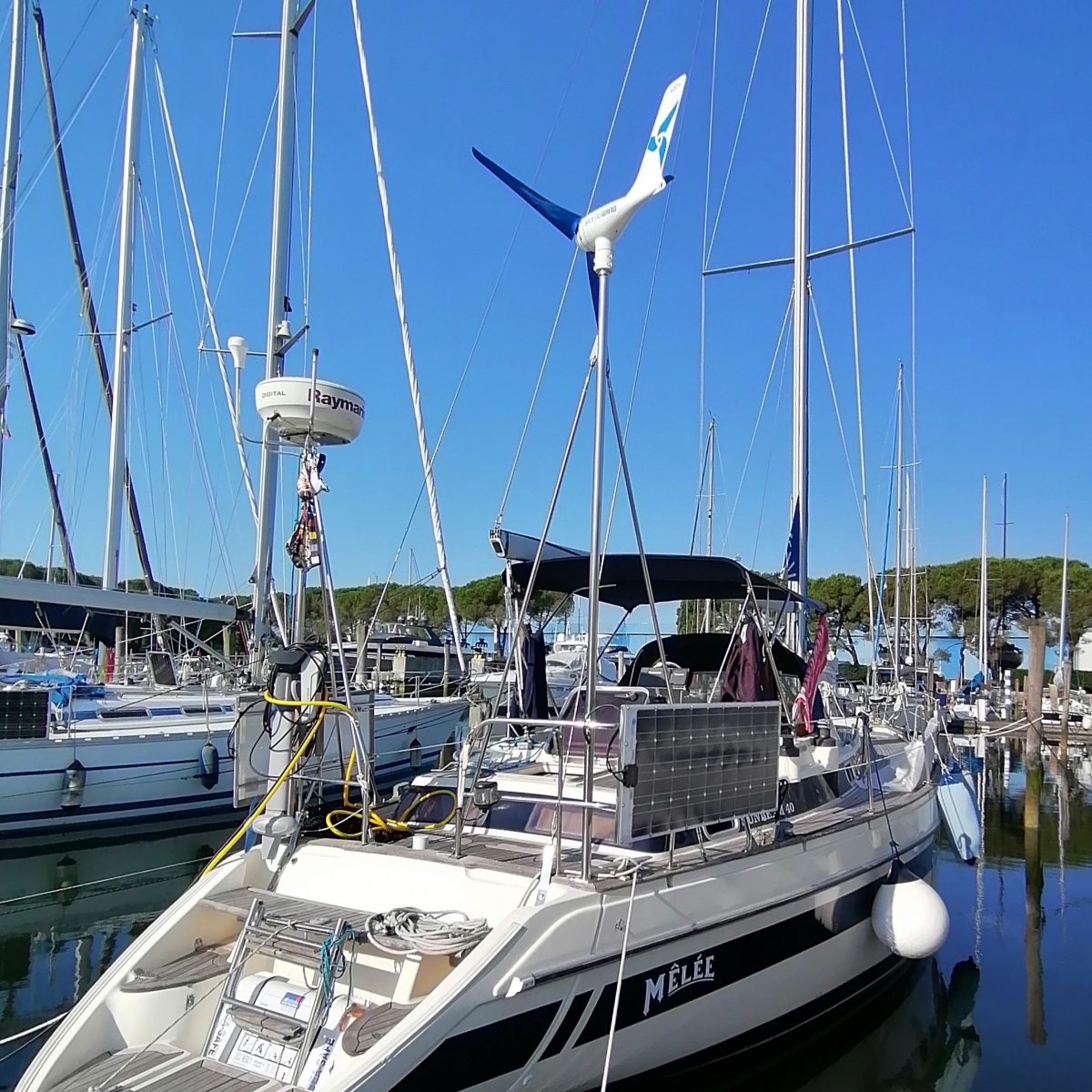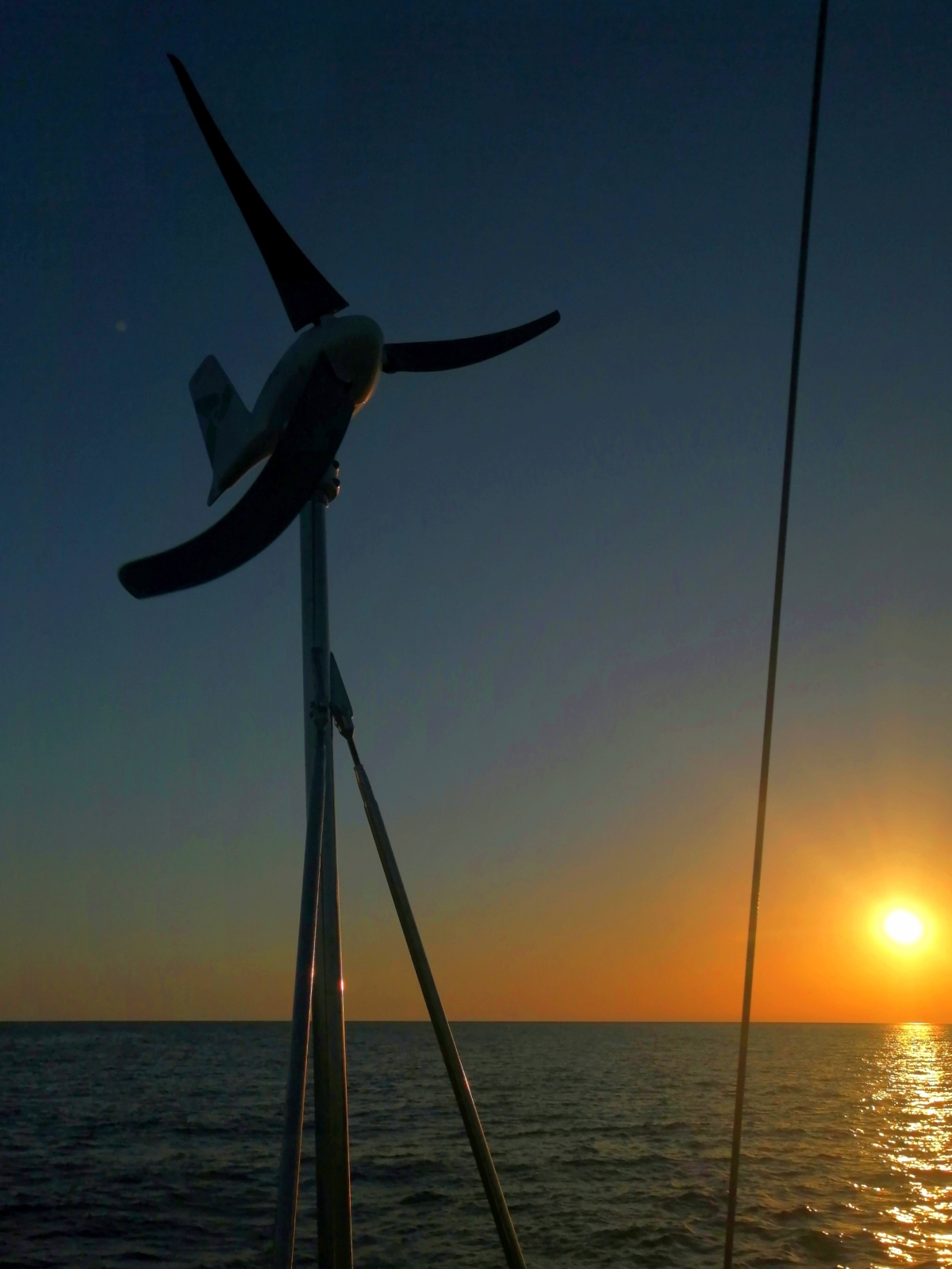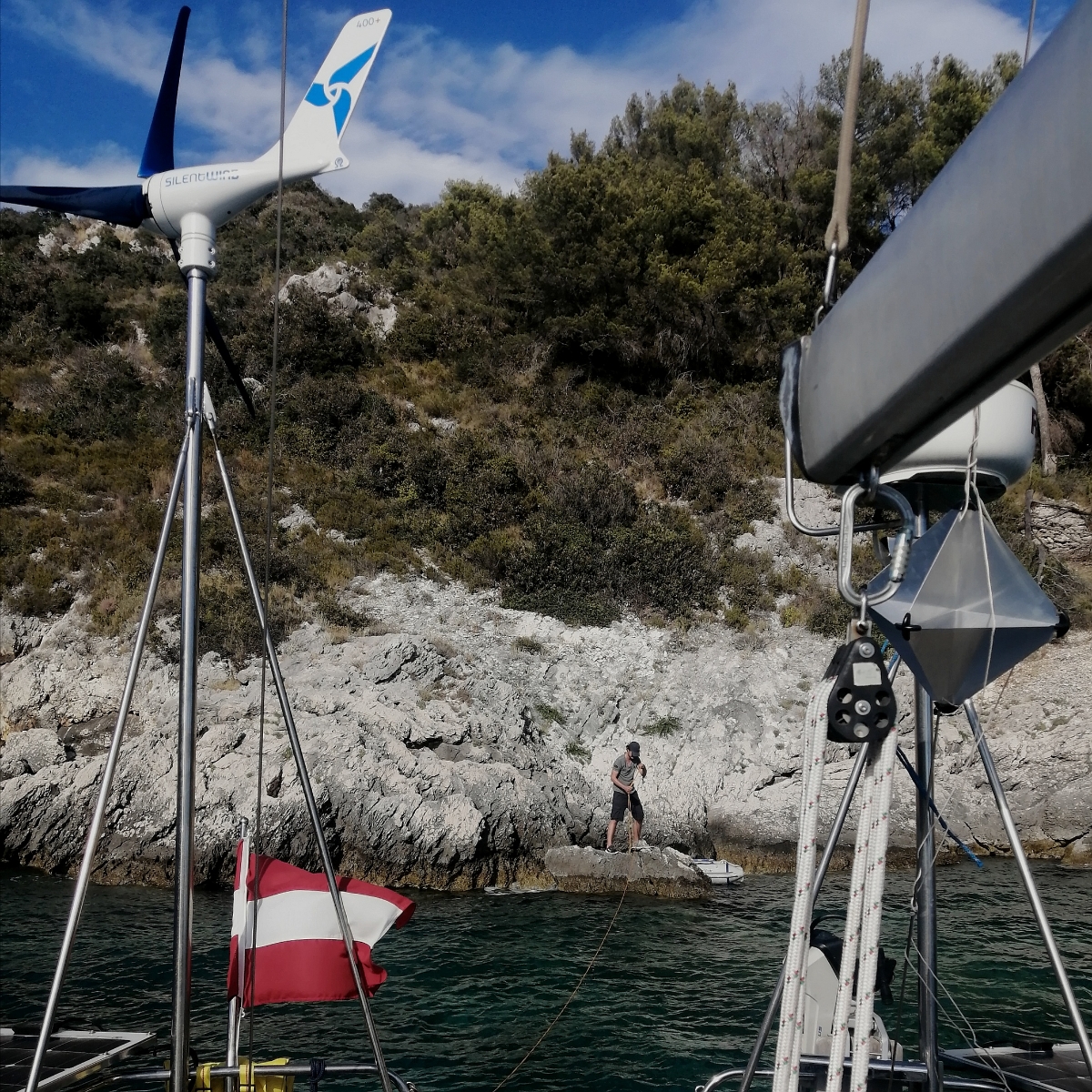 - Ein Windgenerator und zwei Solarpanels sollten uns weitgehend energieautark machen.