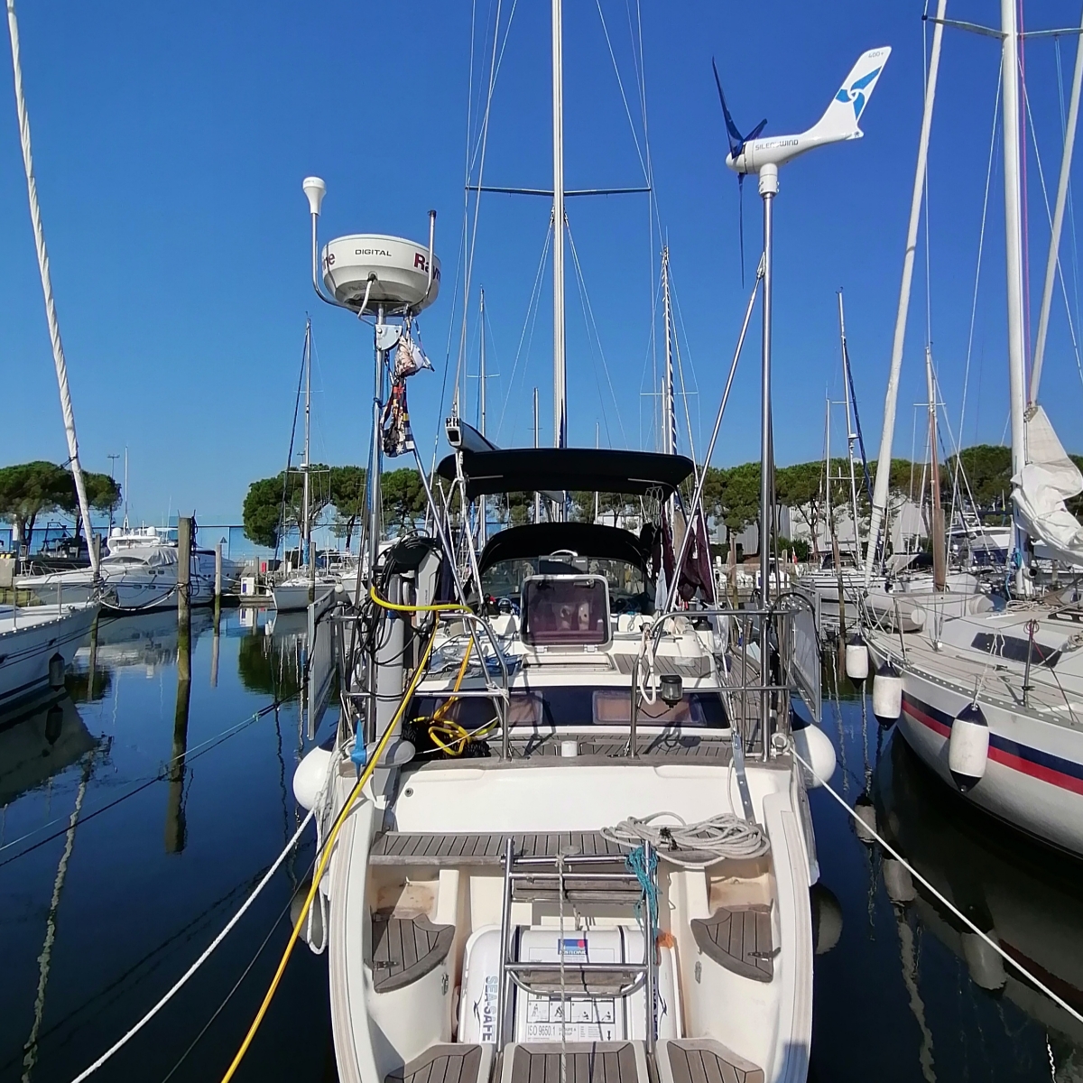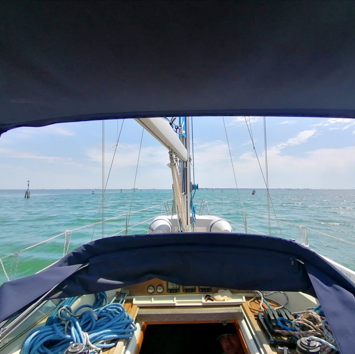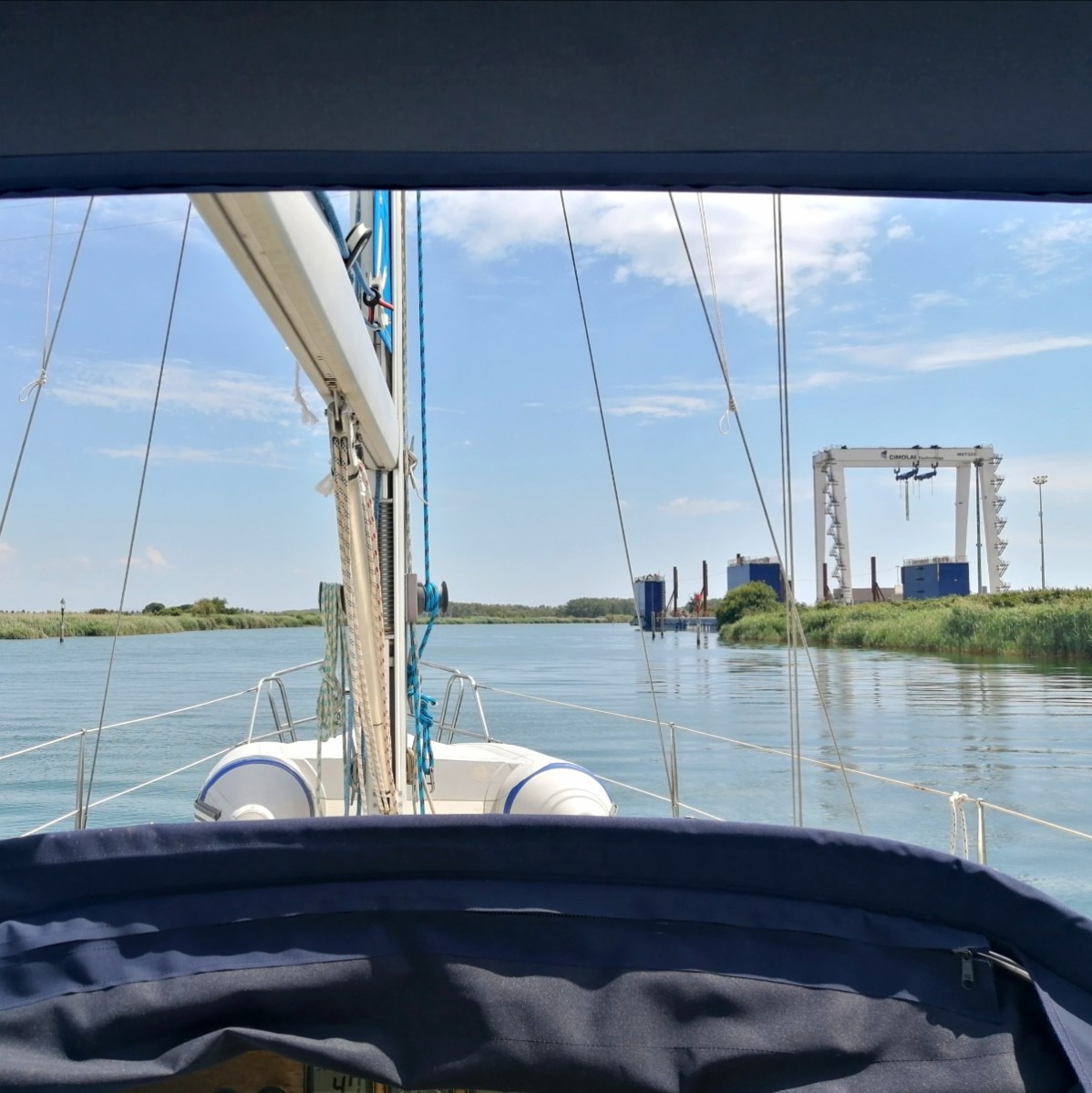 Was für ein aufregender Tag 0! Montag gegen Mittag werden die letzten Arbeiten am Schiff erledigt und die ungefähr budgetierte, aber dennoch gesalzene Rechnung gelegt. Dann heißt es für uns nur noch raus hier! Nach einer letzten Runde im Marinapool, Müll entsorgen und Packen unserer sieben Sachen düsen wir los Richtung Süden: Vom Fluss Corno durch die Dalbenstraße der Lagune raus aufs offene Wasser des Golfs von Triest. Endlich Salzwasser.