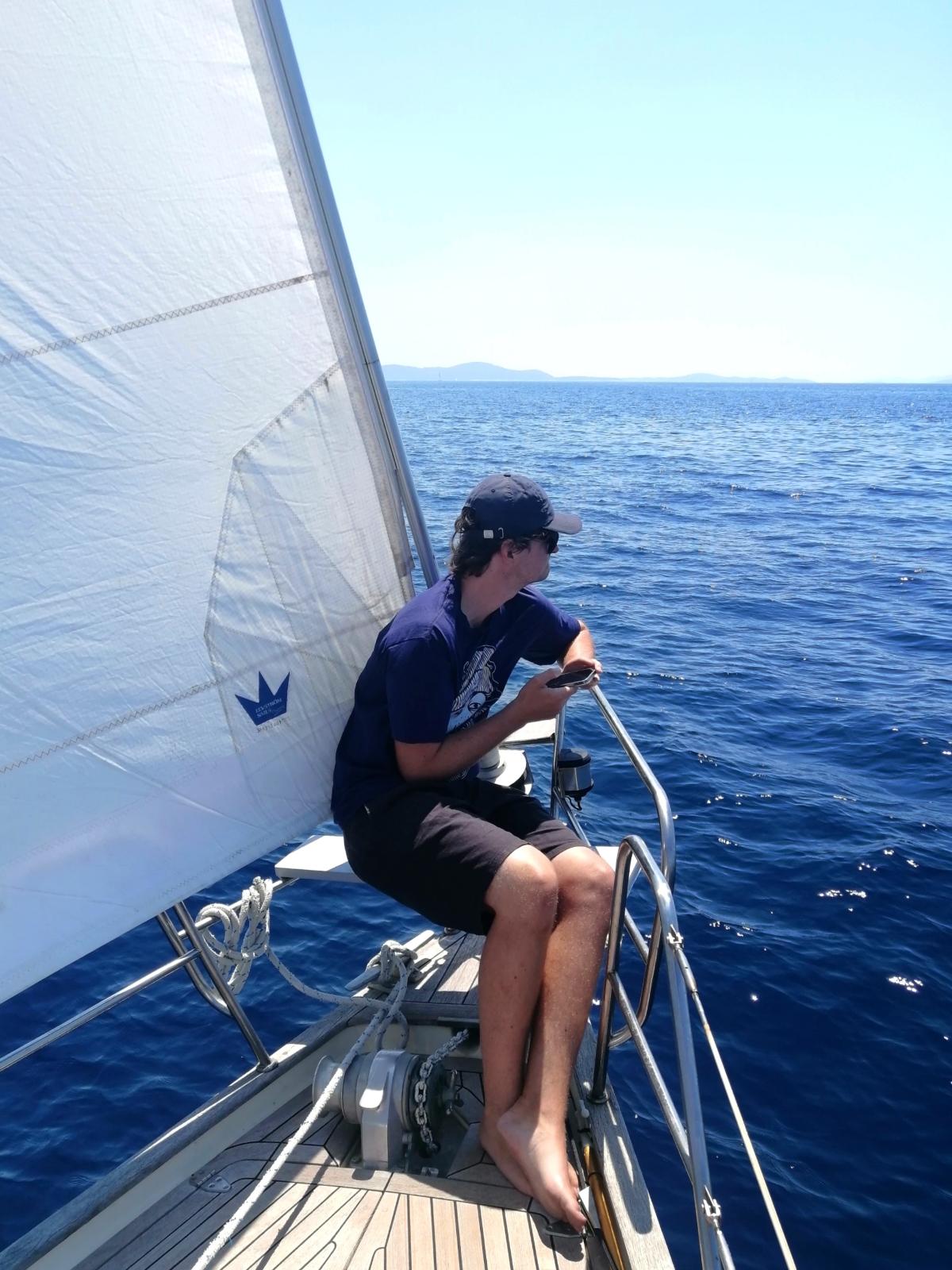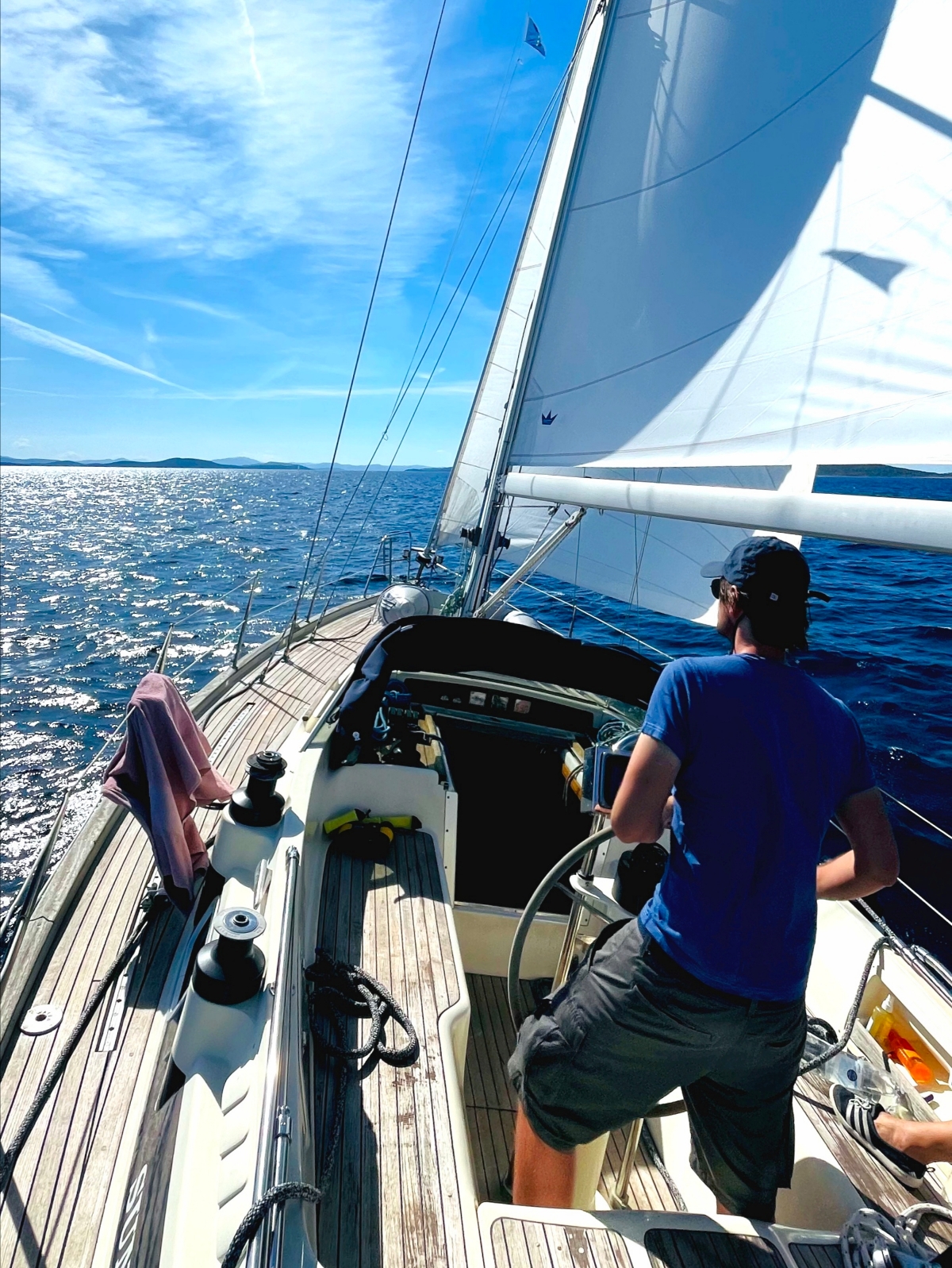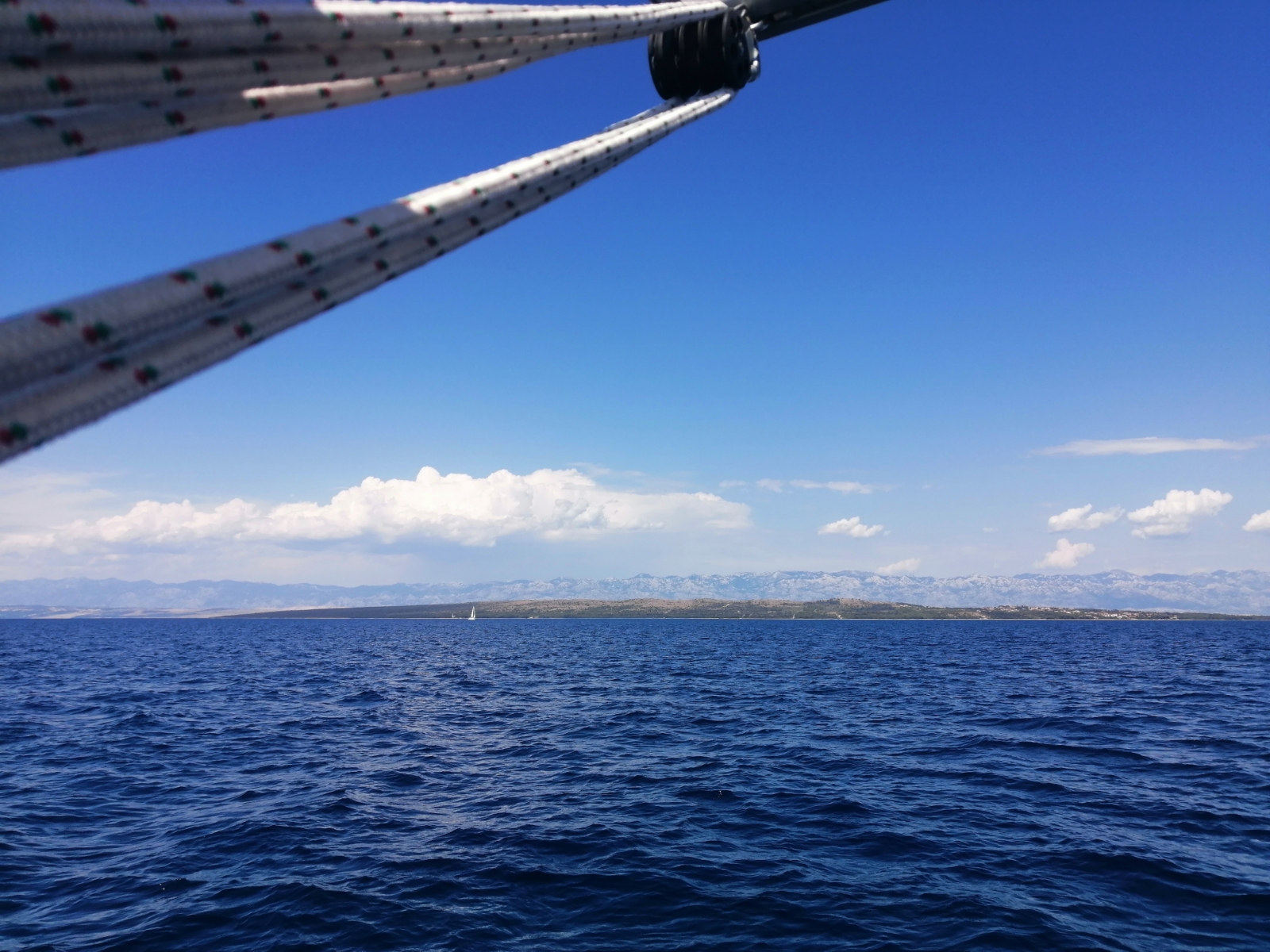 Am Weg nach Korčula versuchen wir zum zweiten Mal die Genua auszubaumen… Und es funktioniert! Bei 6-8 kn Wind schippern wir gemütlich 2,5 Stunden lang mit 3,5 kn SOG dahin. Zum ersten Mal hat übrigens ein Gast seinen eigenen Kübel für den Fall fortgeschrittener Seekrankheit mitgebracht – diesen aber glücklicherweise nie auspacken müssen.