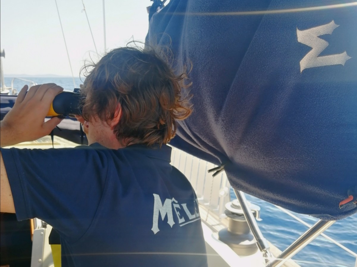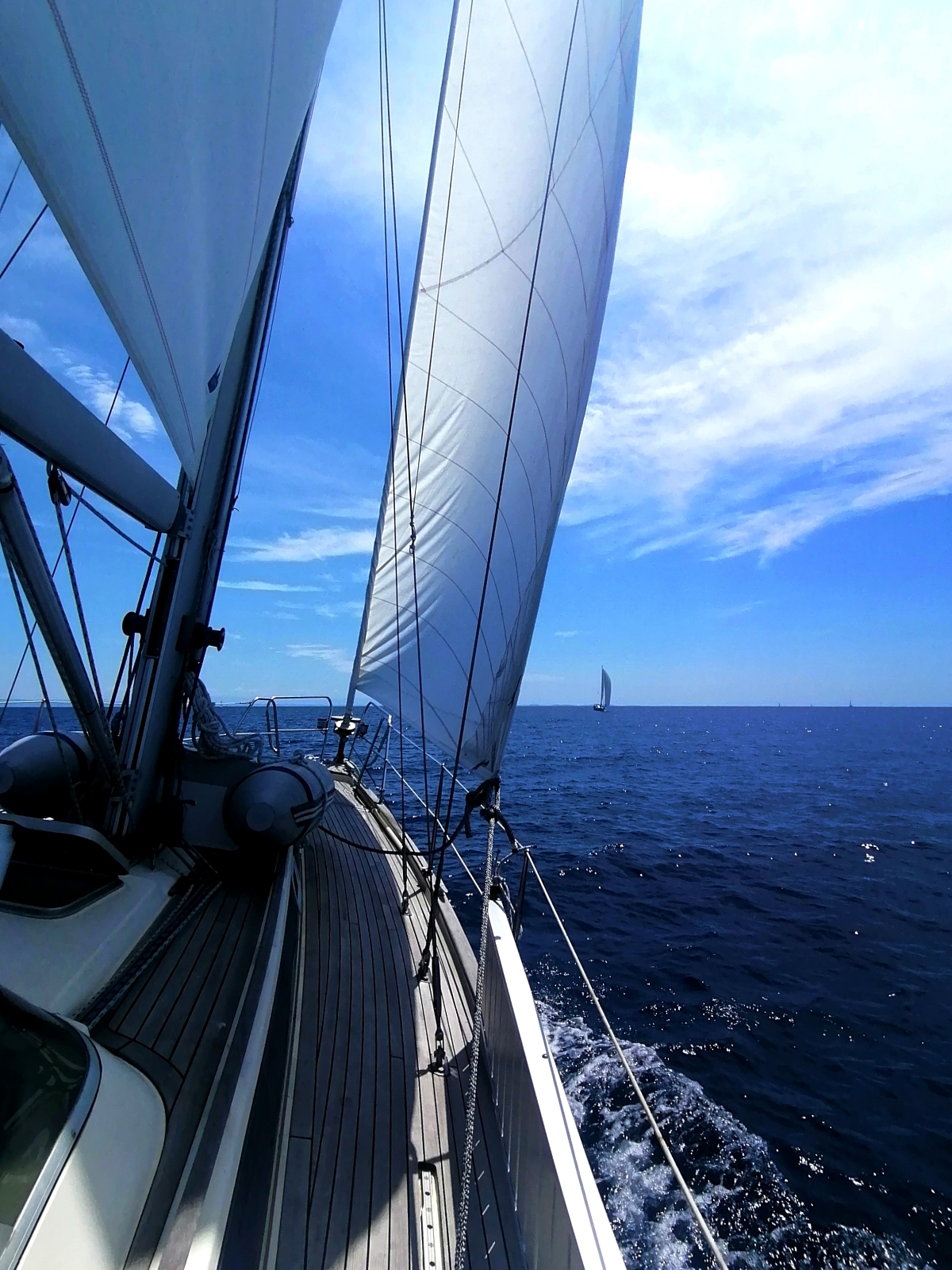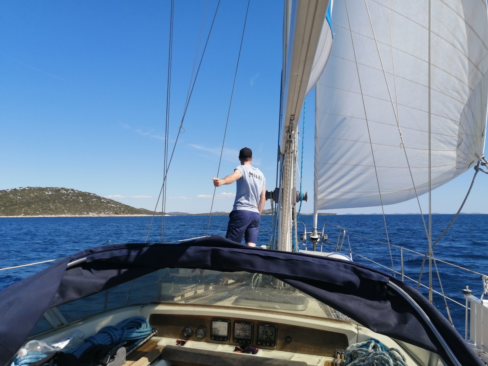 Am Weg nach Korčula versuchen wir zum zweiten Mal die Genua auszubaumen… Und es funktioniert! Bei 6-8 kn Wind schippern wir gemütlich 2,5 Stunden lang mit 3,5 kn SOG dahin. Zum ersten Mal hat übrigens ein Gast seinen eigenen Kübel für den Fall fortgeschrittener Seekrankheit mitgebracht – diesen aber glücklicherweise nie auspacken müssen.