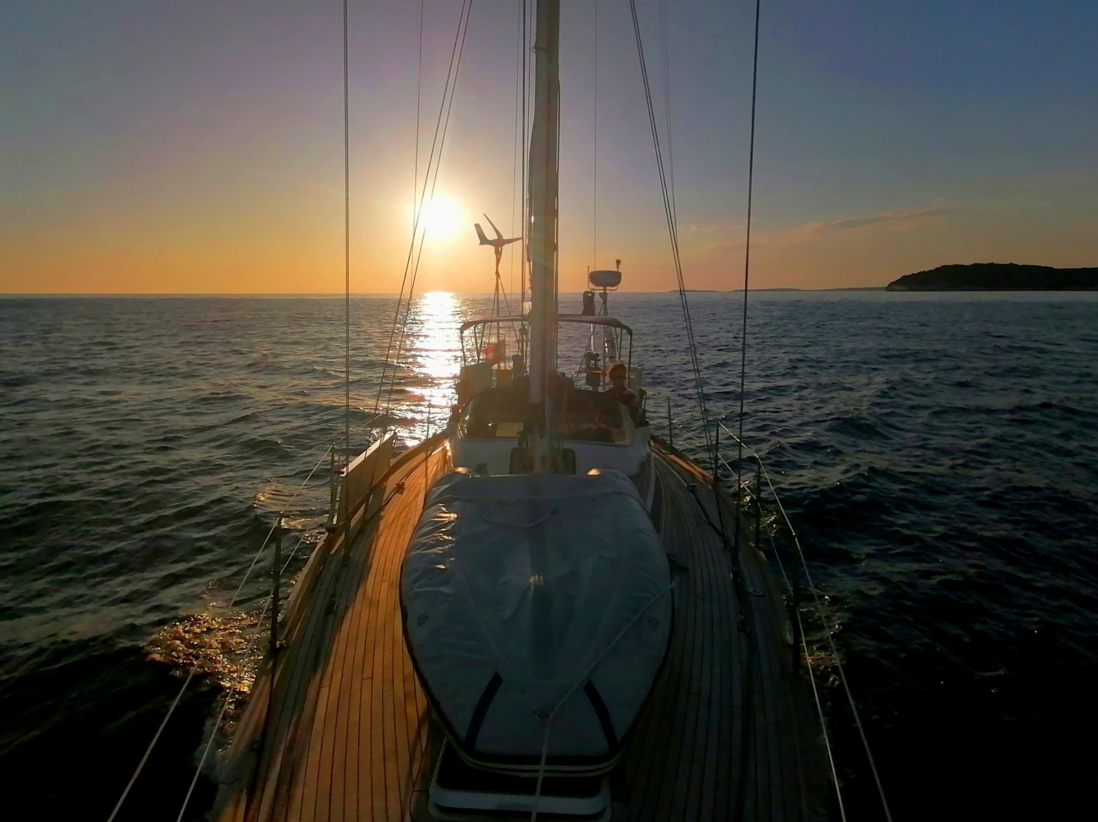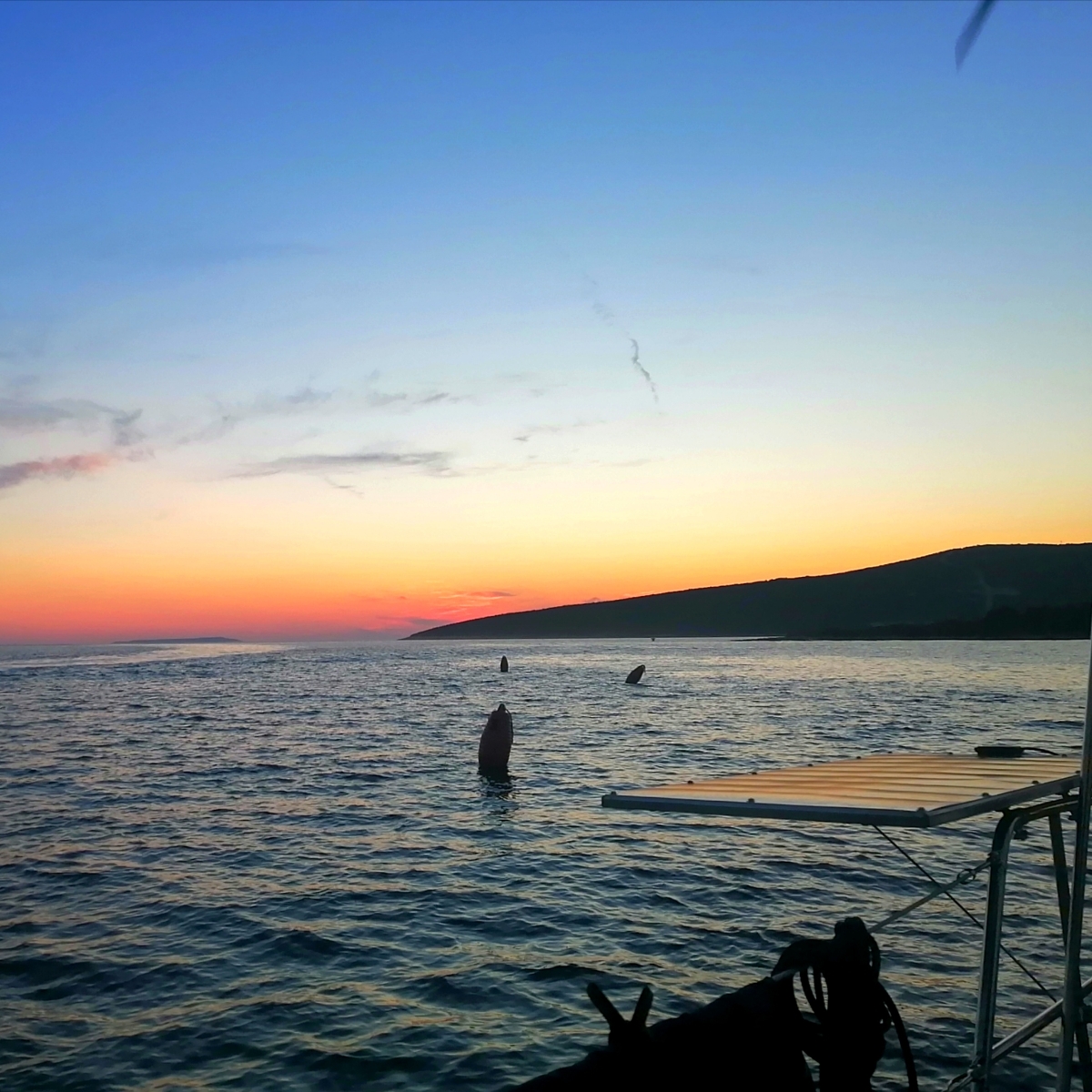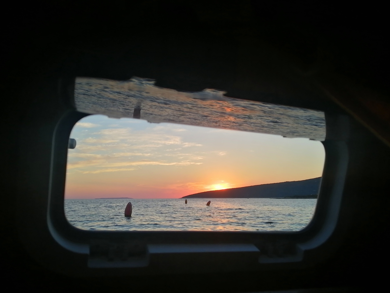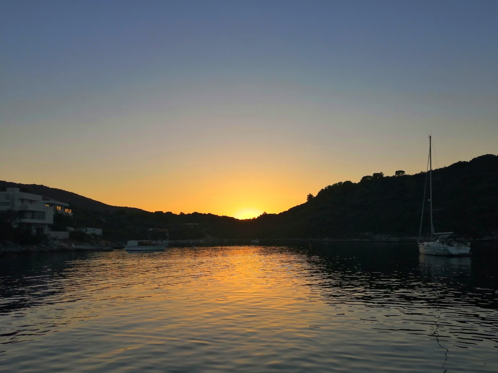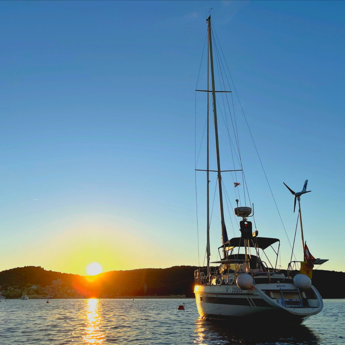 In einer Bucht mit Ausflugsschiffen und Motoryachten ankern wir in recht großer Tiefe. Nach einem Ausflug in die malerische Strandbar, dem Genuss von je einem Aperol Spritzer und 22 € ärmer geht die Sonne in unserer kleinen Bucht unter. Der Wind kommt nicht aus der vorhergesagten Richtung und der Welle scheint die Windrichtung ohnehin egal zu sein. Wir fühlen uns auf dem Ankerplatz mit Landleine in Felsnähe unwohl und beschließen kurzerhand eine Nachtfahrt mit nicht ganz klar definierten Ziel. Nach einem Zwischenstopp in der Bucht vor der Stadt Hvar (überfüllt) finden wir mit dem zweiten Ziel, der winzigen Insel Jerolim, eine geschützte Bucht mit traumhaftem Ausblick auf den Vollmond. Ungemütlicher Schwell bleibt, die Distanz zu den Felsen ist jedoch jetzt deutlich gemütlicher. Gute Nacht.